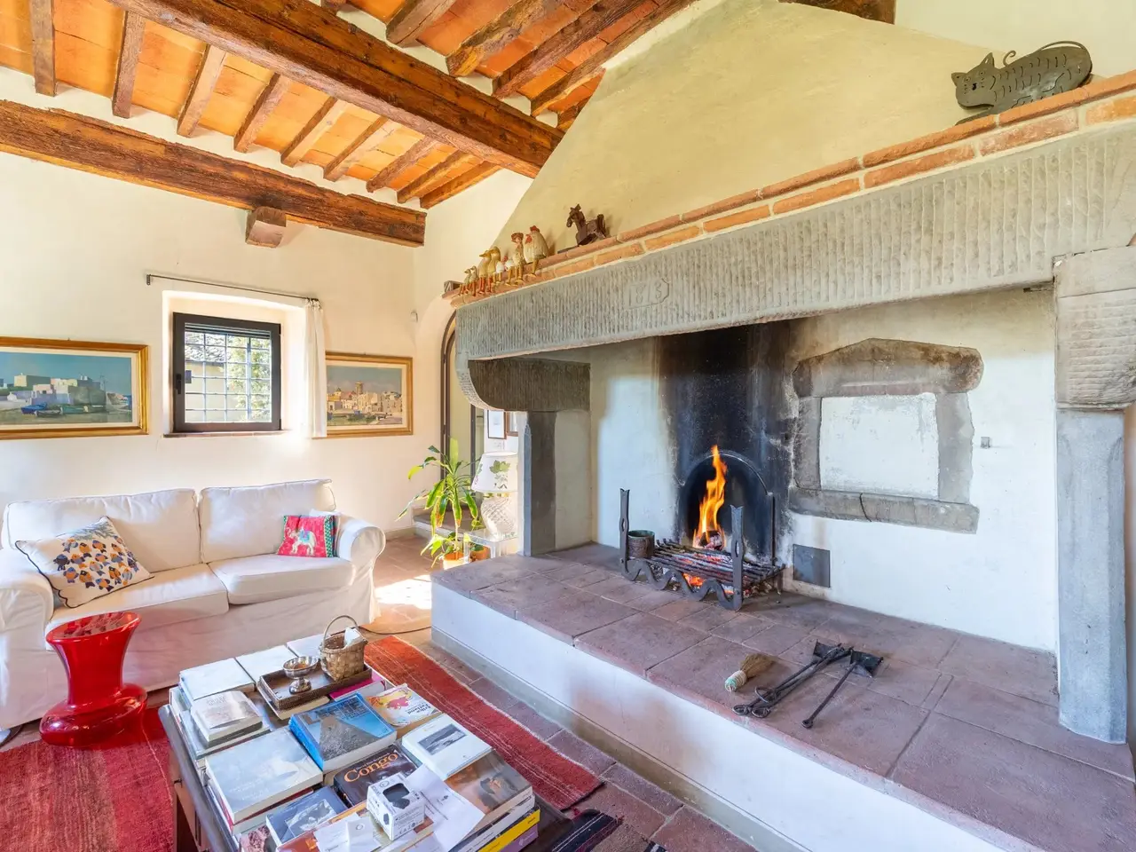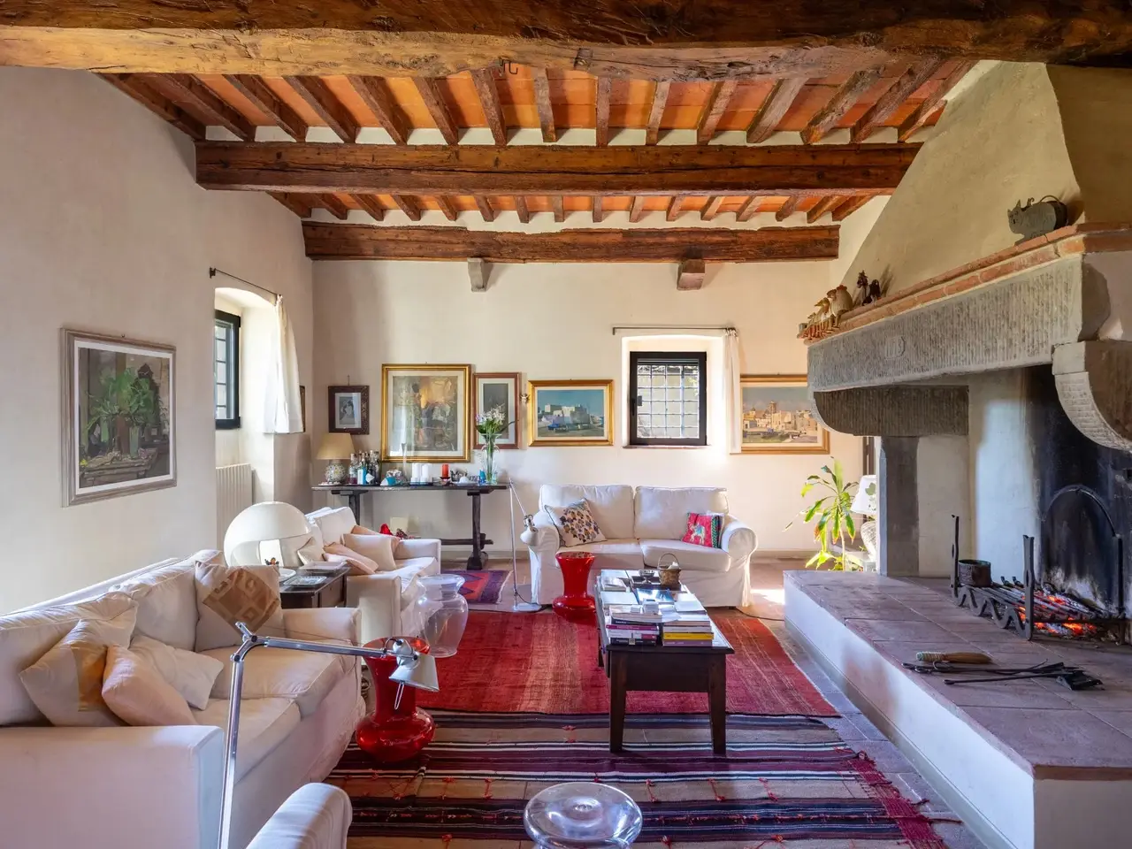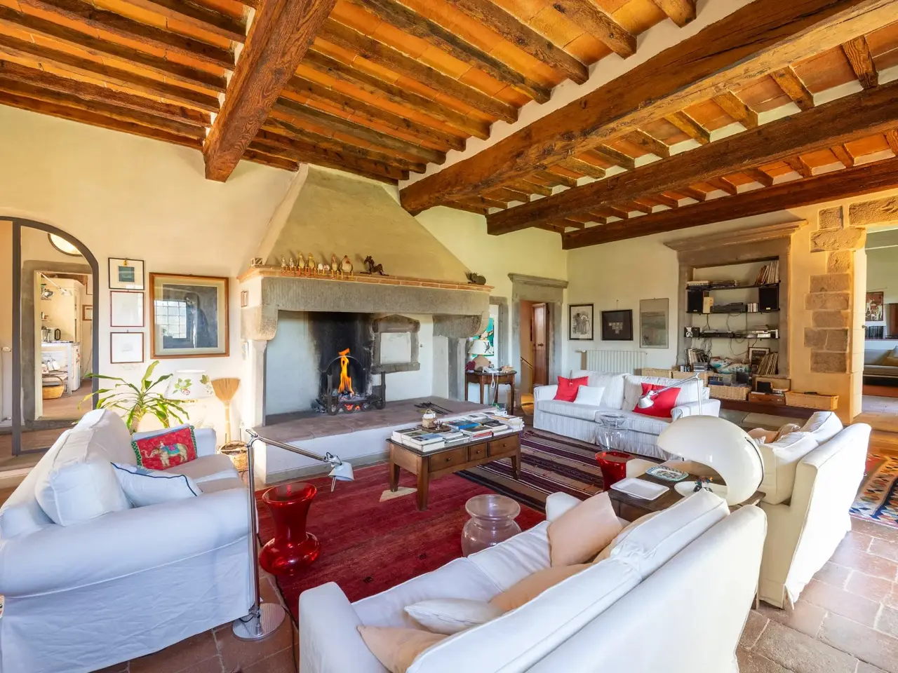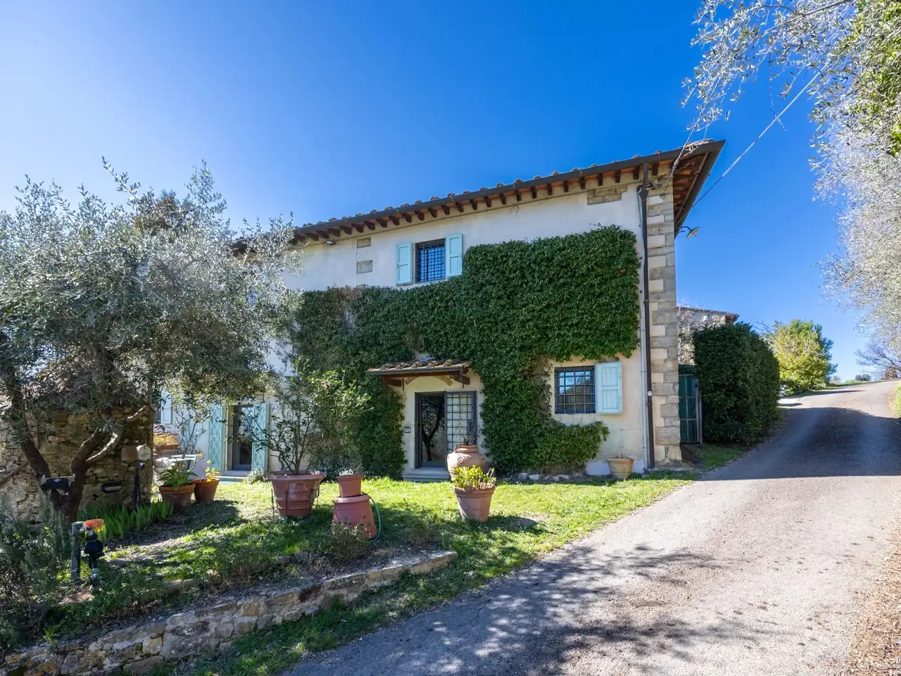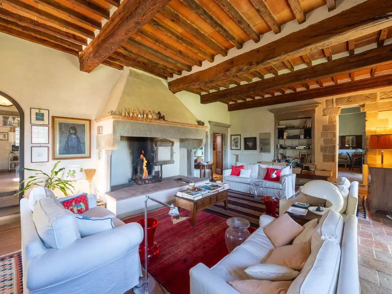 The property is located in the hamlet of “Tigliano” in the municipality of Pontassieve, which has been part of the Fattoria di Grignano for many centuries.It originated as a tower house in the 12th century. Subsequent enlargements resulted in the “scapicozzatura” of the tower, and before being used as a farmhouse, it was used for religious purposes, as specific finishes, in the present living room, suggest.Tigliano is a delightful hamlet where peace and quiet is assured.The property, regular in shape and free on four sides, was renovated in the 2000s by the current owners and continuously improved in subsequent years.It is arranged on two levels. On the ground floor we find a large living room with an important working fireplace, ceiling with exposed beams and “handmade” terracotta floors. Communicating with the living room is the beautiful eat-in kitchen and dining room. The kitchen is characterized by the beautiful Carrara marble details with which the solid wood countertop was made unique with the sink, cooktop and tabletop. The brick ribbed ceiling characterizes the dining room. Both rooms have direct access to the large outdoor slab with a terracotta floor that extends the living area during summer periods. Adjacent to the dining room is a large room used as a pantry. Also on the same floor a second living room that can be used as a study/bedroom. Two bathrooms. A stone staircase leads down to the charming cellar with brick vaults.The upper floor consists of a large living room/library at the living room with a fireplace below, four bedrooms and two bathrooms.Thanks to the presence of two connecting stairwells, an independent portion can be obtained from the consistency of the property.The property is characterized by ceilings ranging between 3.20 m and 3.50 m, open spaces, and many openings to the outside, features not easily found in farmhouses. The stone portals on the ground floor are valuable.On the basement floor a functional technical room.In addition to the terracotta slab mentioned above, a lovely garden completes the property.The hamlet and the property are located in a position from which, as far as the eye can see, no settlements such as factories, highways, railways. The landscape is, therefore, made up of woods and estates cultivated with olive trees and vines. Clearly visible are the Consuma Pass and the forest of Vallombrosa with the bell tower of the Abbey.The area enjoys a favourable climate, both because of its protected position from the north and its height above sea level (400m).It is 16km from Florence, and there is a public bus service to Florence, with a stop 150m from the property.At the Sieci train station (8 km away) 4 trains per hour guarantee a connection with Florence (Campo Marte station in 11 minutes, S.M.Novella station in 16/20 minutes).