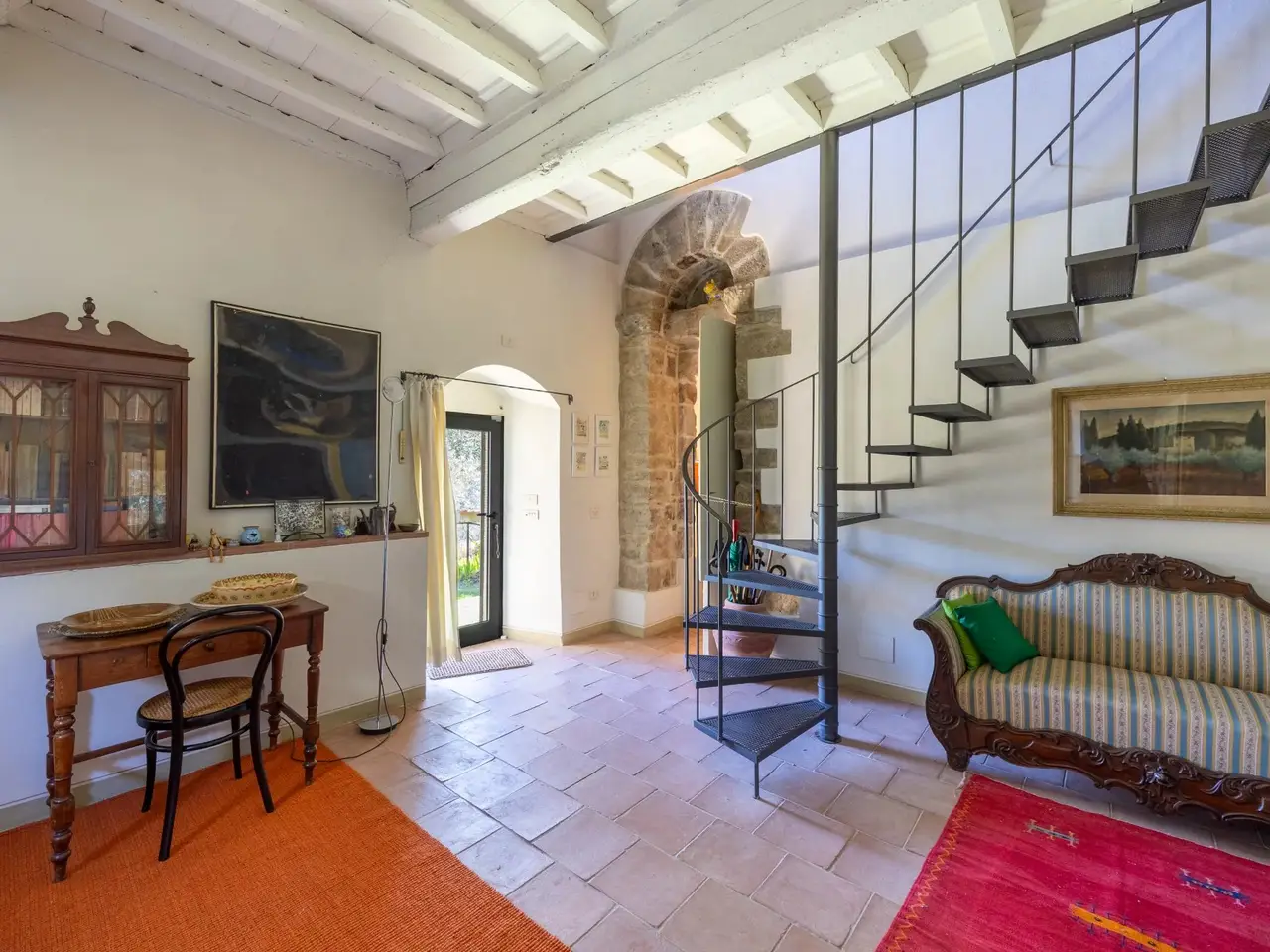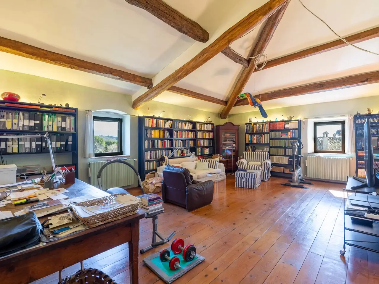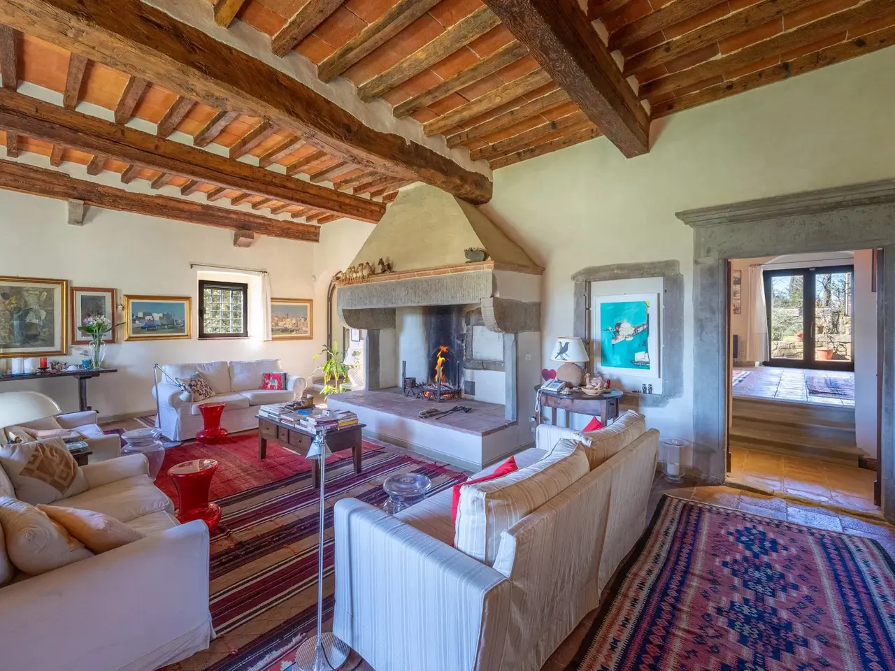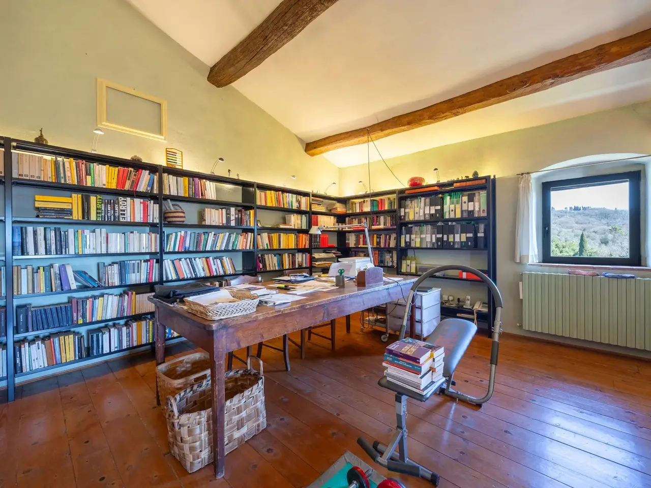 The property is located in the hamlet of “Tigliano” in the municipality of Pontassieve, which has been part of the Fattoria di Grignano for many centuries.It originated as a tower house in the 12th century. Subsequent enlargements resulted in the “scapicozzatura” of the tower, and before being used as a farmhouse, it was used for religious purposes, as specific finishes, in the present living room, suggest.Tigliano is a delightful hamlet where peace and quiet is assured.The property, regular in shape and free on four sides, was renovated in the 2000s by the current owners and continuously improved in subsequent years.It is arranged on two levels. On the ground floor we find a large living room with an important working fireplace, ceiling with exposed beams and “handmade” terracotta floors. Communicating with the living room is the beautiful eat-in kitchen and dining room. The kitchen is characterized by the beautiful Carrara marble details with which the solid wood countertop was made unique with the sink, cooktop and tabletop. The brick ribbed ceiling characterizes the dining room. Both rooms have direct access to the large outdoor slab with a terracotta floor that extends the living area during summer periods. Adjacent to the dining room is a large room used as a pantry. Also on the same floor a second living room that can be used as a study/bedroom. Two bathrooms. A stone staircase leads down to the charming cellar with brick vaults.The upper floor consists of a large living room/library at the living room with a fireplace below, four bedrooms and two bathrooms.Thanks to the presence of two connecting stairwells, an independent portion can be obtained from the consistency of the property.The property is characterized by ceilings ranging between 3.20 m and 3.50 m, open spaces, and many openings to the outside, features not easily found in farmhouses. The stone portals on the ground floor are valuable.On the basement floor a functional technical room.In addition to the terracotta slab mentioned above, a lovely garden completes the property.The hamlet and the property are located in a position from which, as far as the eye can see, no settlements such as factories, highways, railways. The landscape is, therefore, made up of woods and estates cultivated with olive trees and vines. Clearly visible are the Consuma Pass and the forest of Vallombrosa with the bell tower of the Abbey.The area enjoys a favourable climate, both because of its protected position from the north and its height above sea level (400m).It is 16km from Florence, and there is a public bus service to Florence, with a stop 150m from the property.At the Sieci train station (8 km away) 4 trains per hour guarantee a connection with Florence (Campo Marte station in 11 minutes, S.M.Novella station in 16/20 minutes).