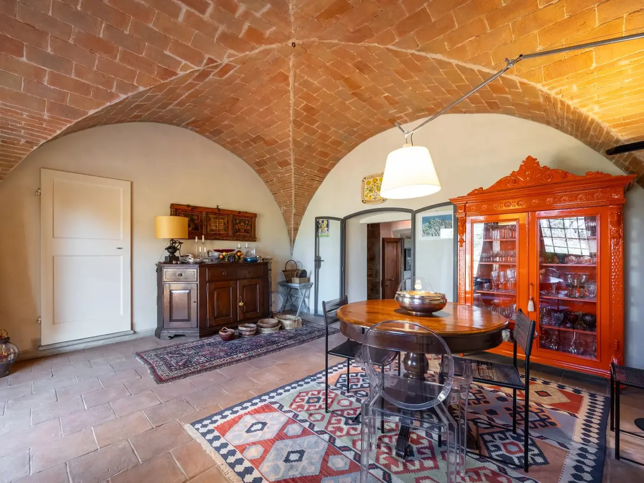 Brick ribbed ceiling in dining room