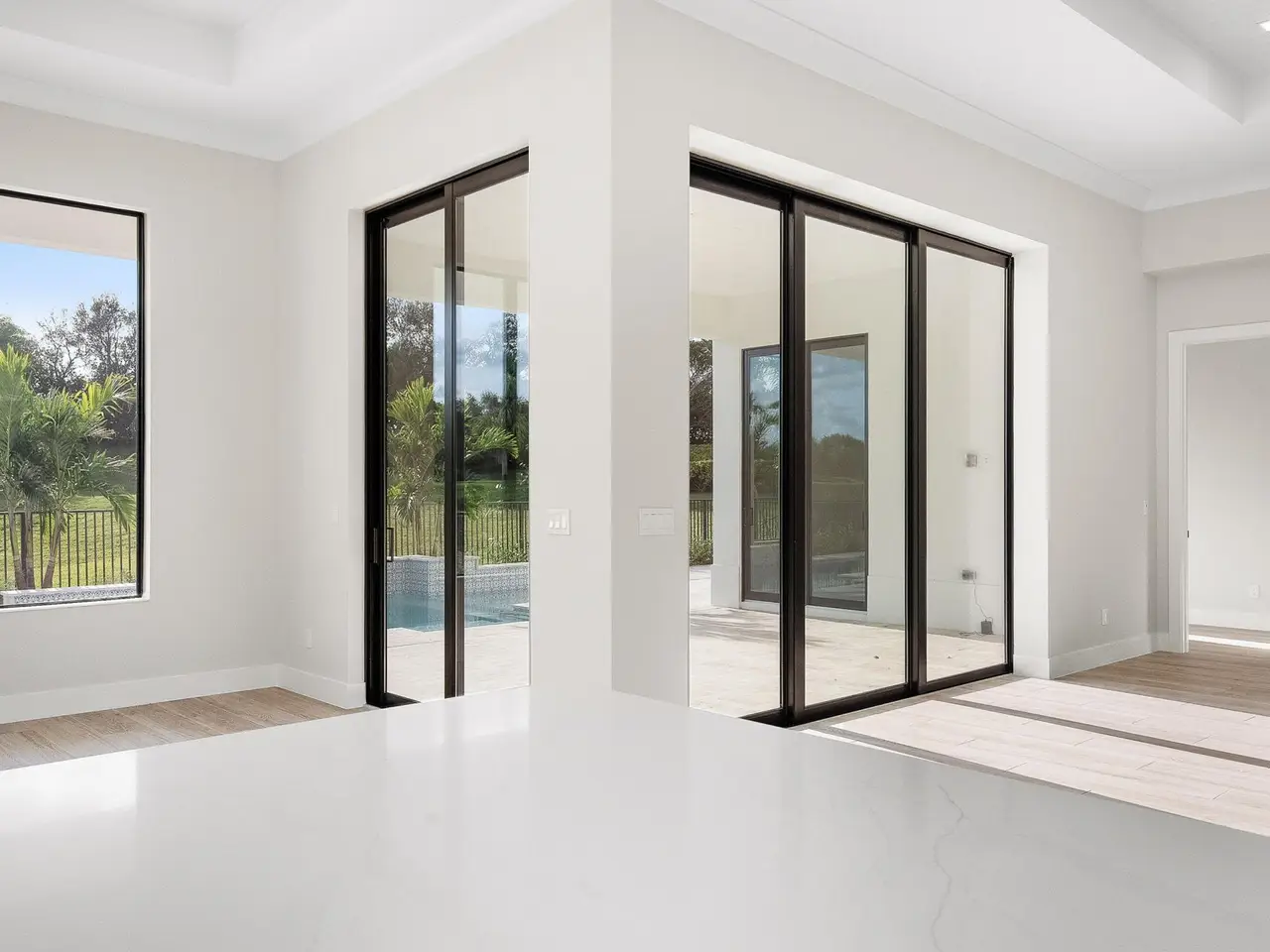 This Coastal Modern offering from GHO Homes with fantastic amenities is now available. Expansive twelve ft. high ceiling with oversized storm guard windows & doors announce you have arrived. Family room, kitchen, dining, club room, covered patio and pool create a one of kind living experience. The kitchen features Cafe series appliances, natural gas cooktop, 42 double door frig., build in convection wall oven, quartz counter tops, stacked upper cabinets with glass accent doors. The primary suite features a morning bar, a Carrie Bradshaw style display closet with custom shelfs, a 2nd walk-in, 12 ft high tray ceiling & is privately located on its own wing. Primary bath has double vanities, soaking tub & premium shower. Two Guest suites each have private baths & Walk-in closets.