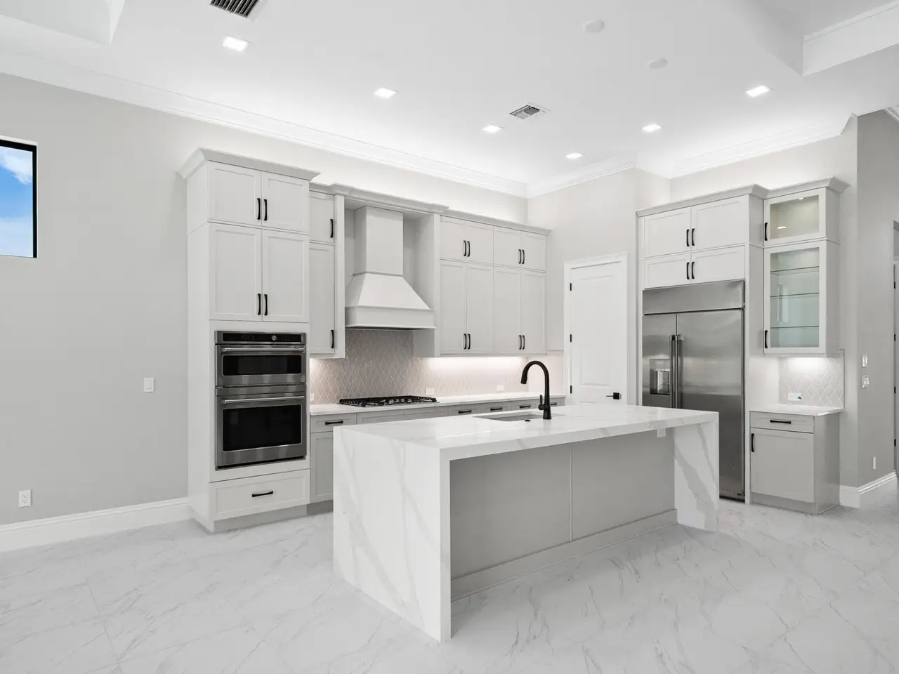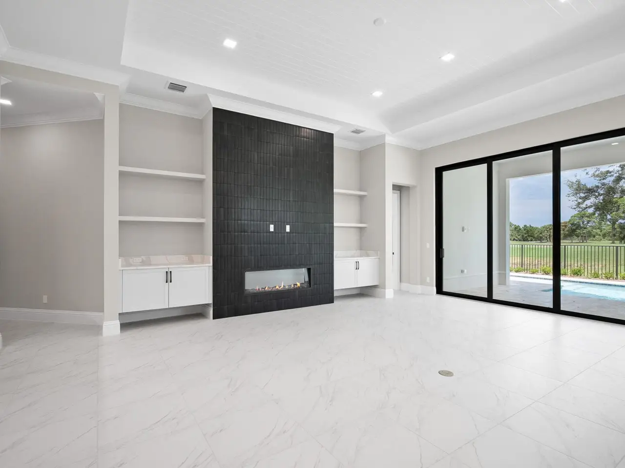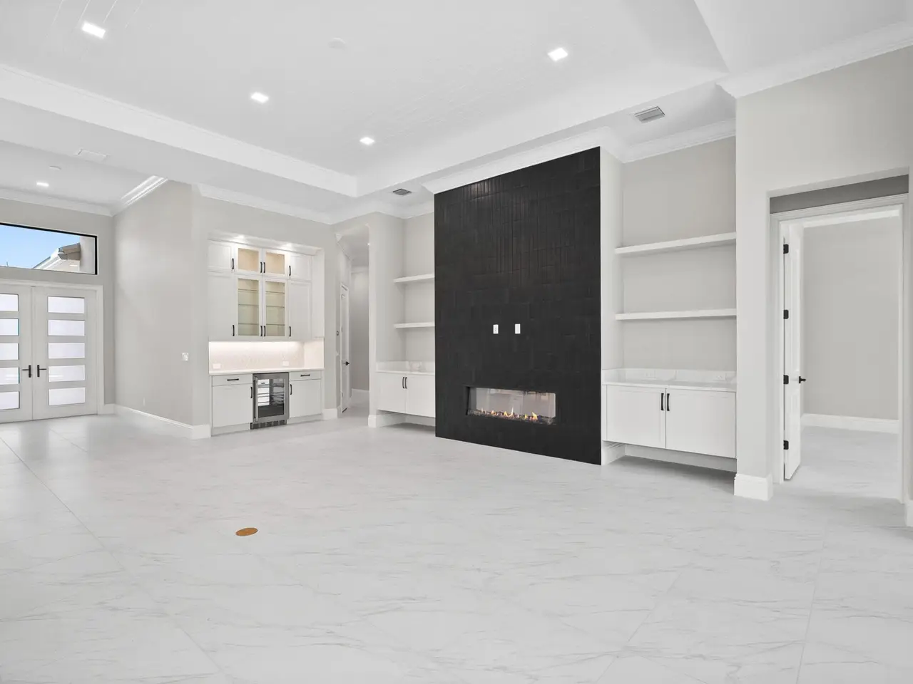 Located in the prestigious Tesoro Club, this exceptional residence features a striking contemporary front elevation. Based on the Stella model, this residence boasts impressive high-volume ceilings and a chefs kitchen with top-of-the-line Cafe appliances, including a spacious 42-inch built-in refrigerator. The kitchen is designed for functionality and style, featuring an oversized central island with a stunning 2.5-inch waterfall edge, a walk-in pantry with custom shelving, and stacked cabinets above a natural gas cooktop. The great room is a focal point, enhanced by an electric fireplace surrounded by elegant tiling, creating an inviting and sophisticated atmosphere. The backyard is perfect for entertaining, with a luxurious pool and travertine paver patio that elevates outdoor living!