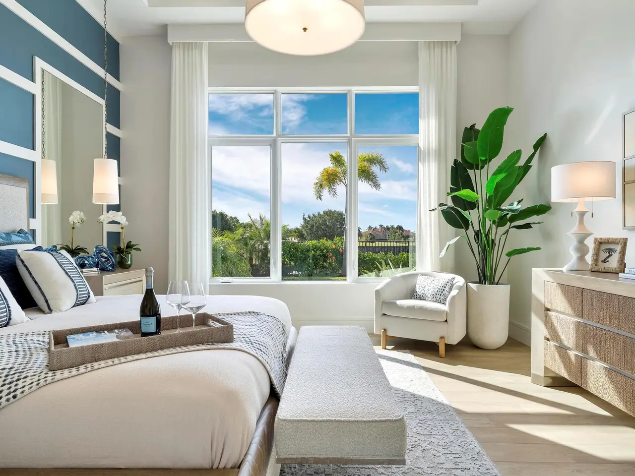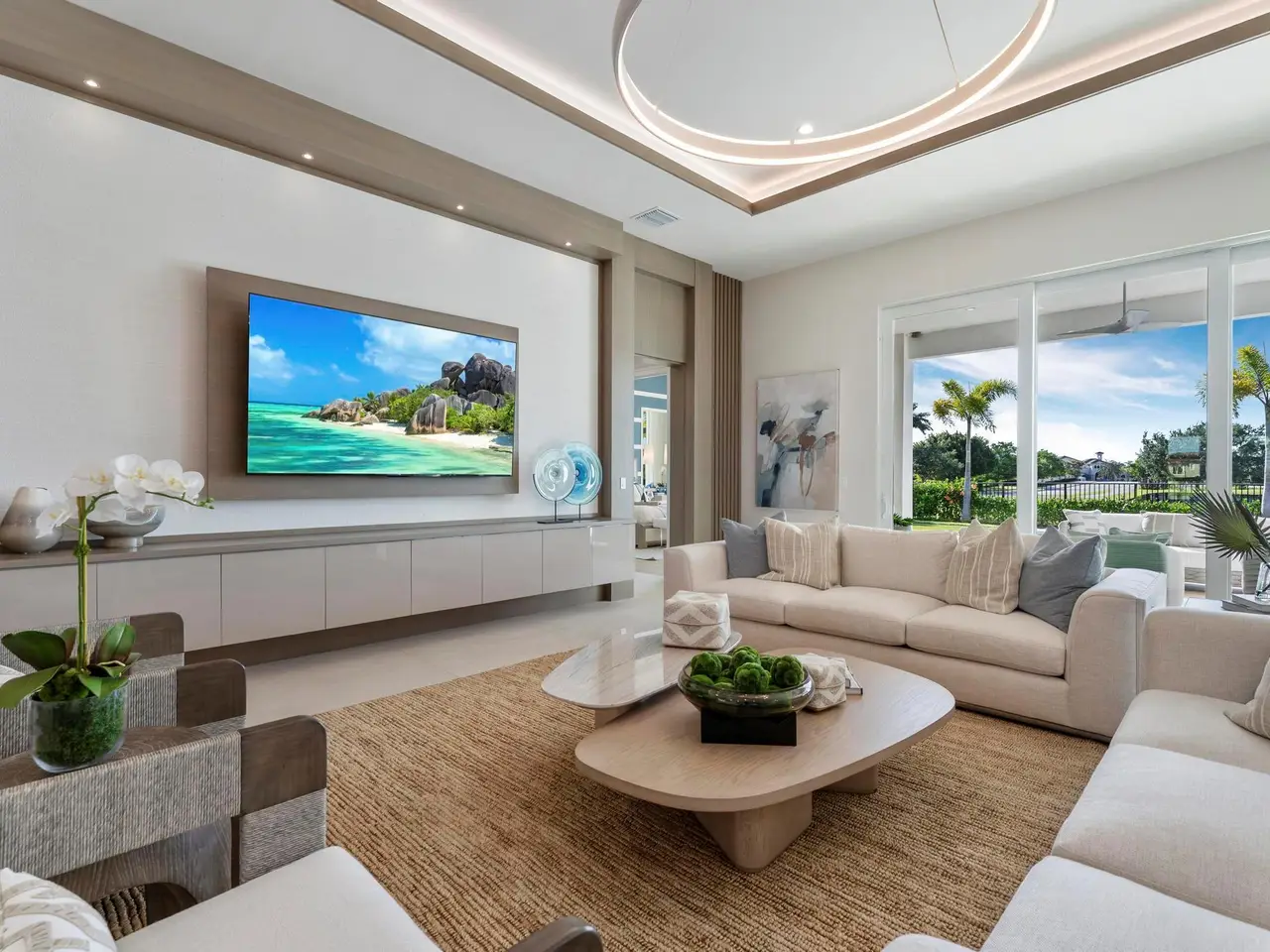 As you enter the gates of Tesoro, you are welcomed into a realm of luxury living. Elevate your lifestyle with a beautifully appointed model home from Ecclestone Signature Homes, featuring breathtaking views of the golf course and serene water. This residence offers three bedrooms, along with a den or flexible space, and is adorned with high-quality upgrades and finishes. The Coastal Modern Design promotes an open-concept layout with soaring ceilings, creating an ideal environment for entertaining. A spacious patio, complete with a custom-built TV wall, enhances outdoor living. With impact windows and doors throughout, homeownership is effortless. This residence has been meticulously decorated by one of South Florida's most esteemed designers, making it a true turnkey opportunity.
