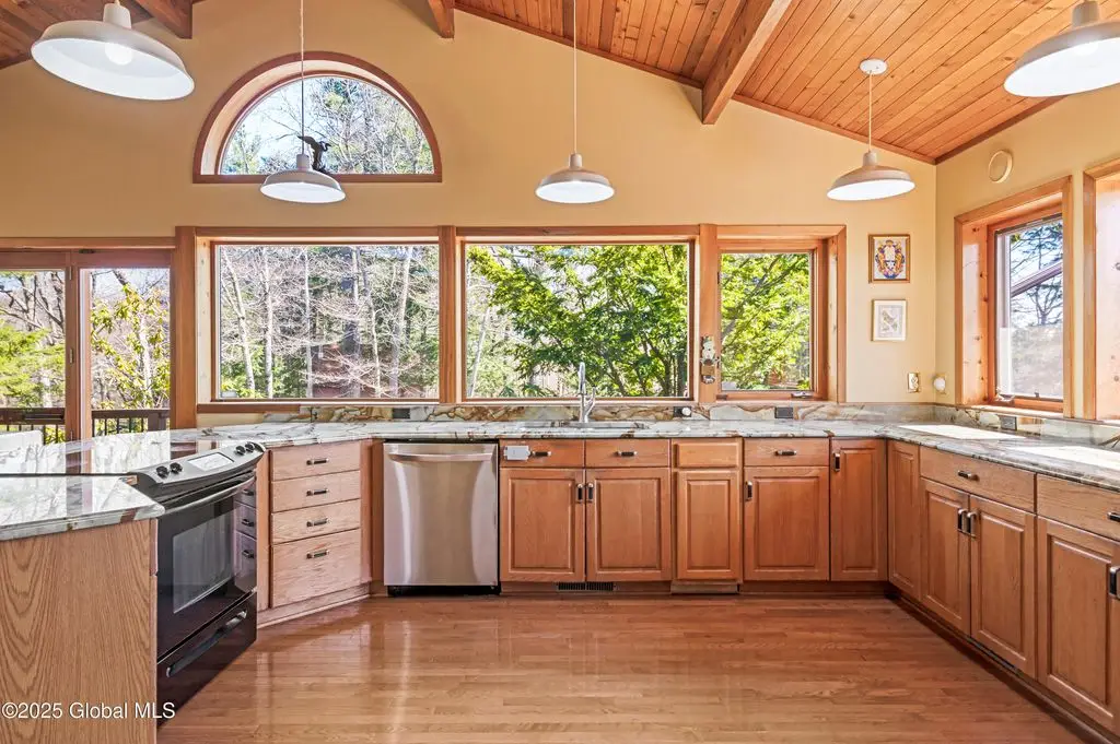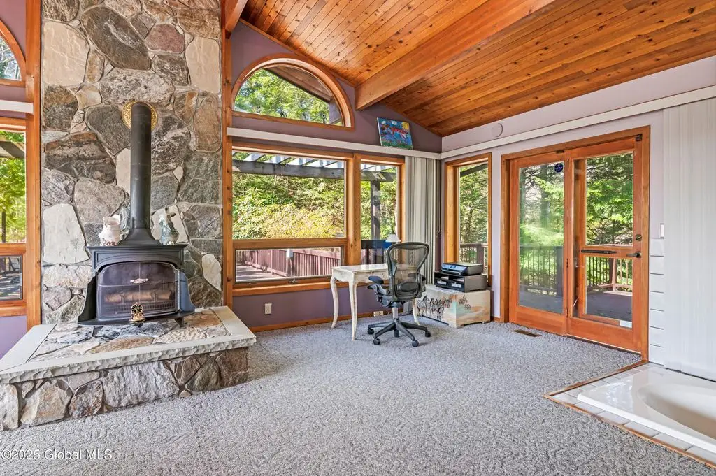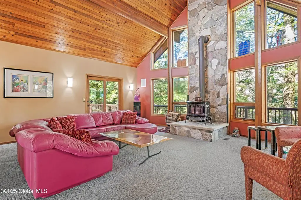 Escape to your private utopia in the heart of nature on 17.86 acres! This stunning 4-bedroom, 3-full bathroom retreat offers 4,361 square feet of living space across 3 levels. Panoramic lake views from almost every corner of this magnificent home! Step into a serene sanctuary with tongue-and-groove cedar ceilings, exposed wood beams, and arched doorways. Bask in natural light from copious windows, cathedral ceilings, and floor-to-ceiling stone surrounds. The kitchen features quartz counters, a walk-in pantry with built-in California Closet shelving and drawers, and an atrium glass door that leads out to the new wrap-around Trex deck. 2-car garage and an additional detached 2-car garage with storage above. This breathtaking property, boasting C/B?B= mile of shorefront, offers unparalleled relaxation and significant Airbnb potential. It is enveloped by lush greenery and scenic hiking trails. Unwind by Evans Lake, where nature's tranquility seamlessly blends with luxurious living.