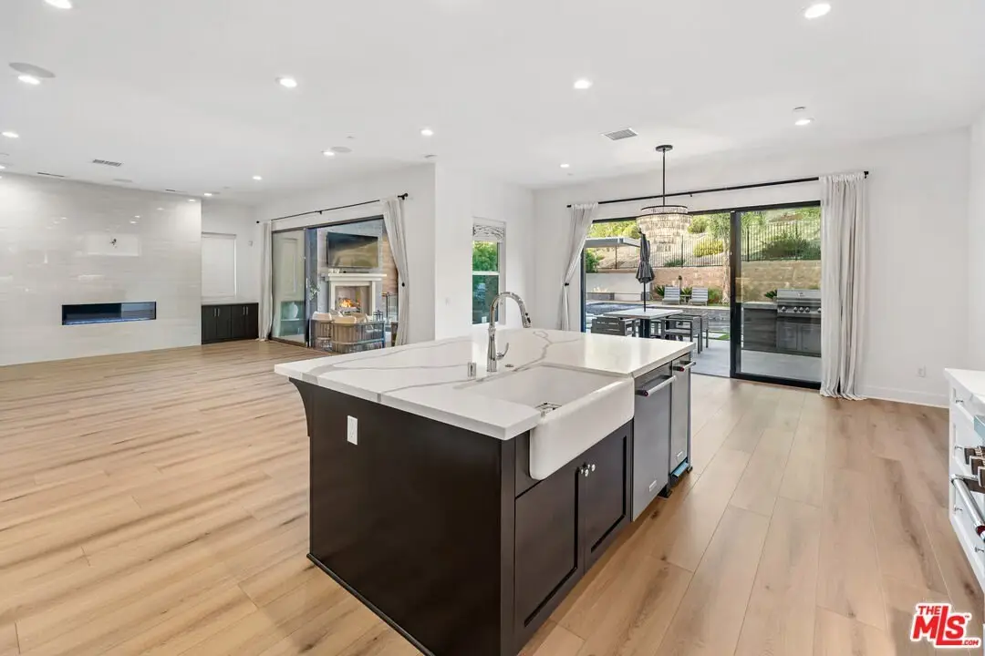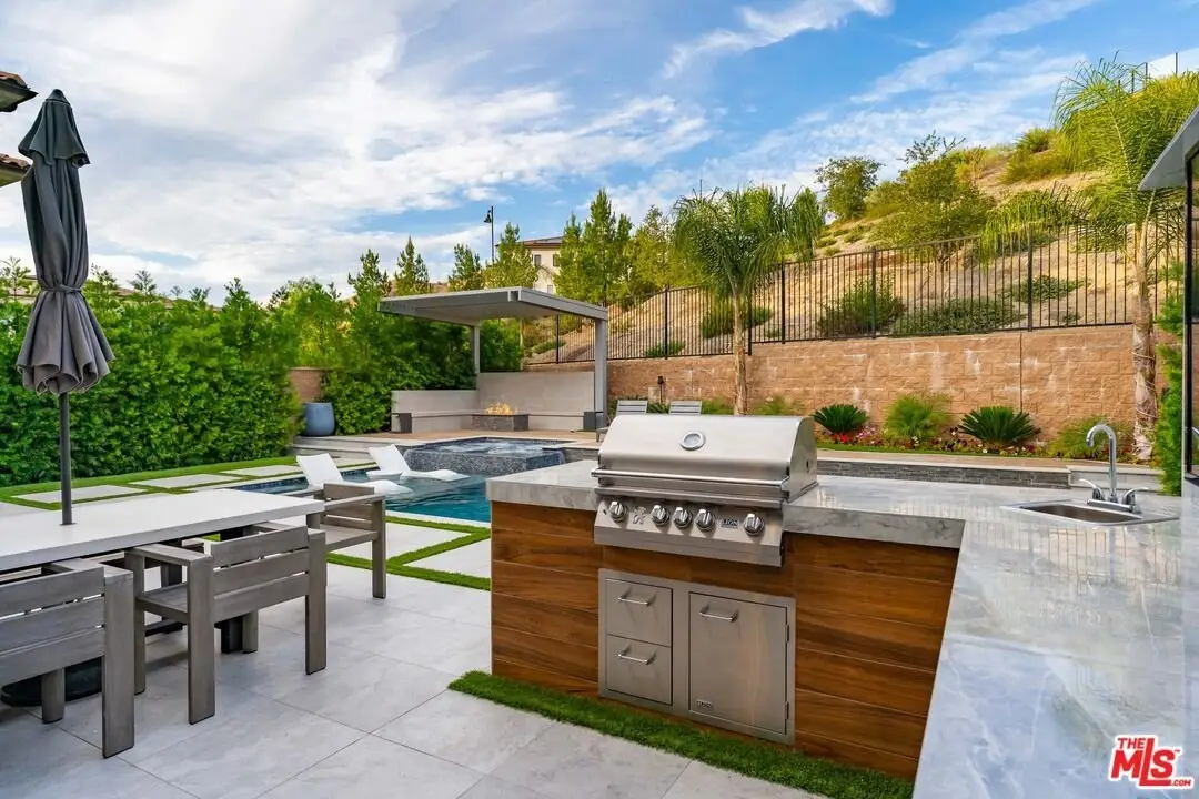 Introducing a rare opportunity in the prestigious guard-gated community of Hillcrest, a stunning 2022 build that blends luxury, comfort, and designer-level upgrades in every corner. Located on a quiet cul-de-sac with exceptional privacy, this home is in impeccable, move-in ready condition and lives like a modern resort. Step into an open, light-filled interior where the heart of the home is the chef-inspired kitchen, complete with a built-in refrigerator, side-by-side ovens, a 6-burner cooktop with griddle, a 48" professional vent hood, a built-in microwave, a large center island, and a walk-in pantry. The kitchen flows seamlessly into the family room, which highlights a sleek cosmo fireplace, custom wall treatment, and custom built-ins, and then expands outward through large stackable sliding glass doors to the extraordinary backyard. The outdoor living spaces are a true showpiece: a new Pebble Fina pool and spa, a built-in BBQ center with outdoor TV, a pergola with a gas firepit, and a covered outdoor lounge with its own fireplace. This stunning backyard is designed for year-round relaxation and entertaining. Inside, the first floor offers an expanded bedroom suite, ideal for flexible living needs. The first level also includes an extra bonus room - ideal for a home office or gym. Upstairs, the primary suite impresses with a massive walk-in closet featuring custom built-ins, and a spa-style bathroom with dual vanities, a free-standing soaking tub, and a spacious walk-in shower. The upper level also boasts a generous loft space, delivering additional versatility. A finished 2-car garage outfitted with car charging station, custom cabinets and epoxy flooring adds convenience and style. Located in one of Porter Ranch's most sought-after gated enclaves, this residence offers a rare blend of luxury, privacy, and contemporary design, and is located just moments from Porter Ranch Community Park, equestrian and hiking trails, The Vineyards shopping center, and Porter Ranch Town Center.