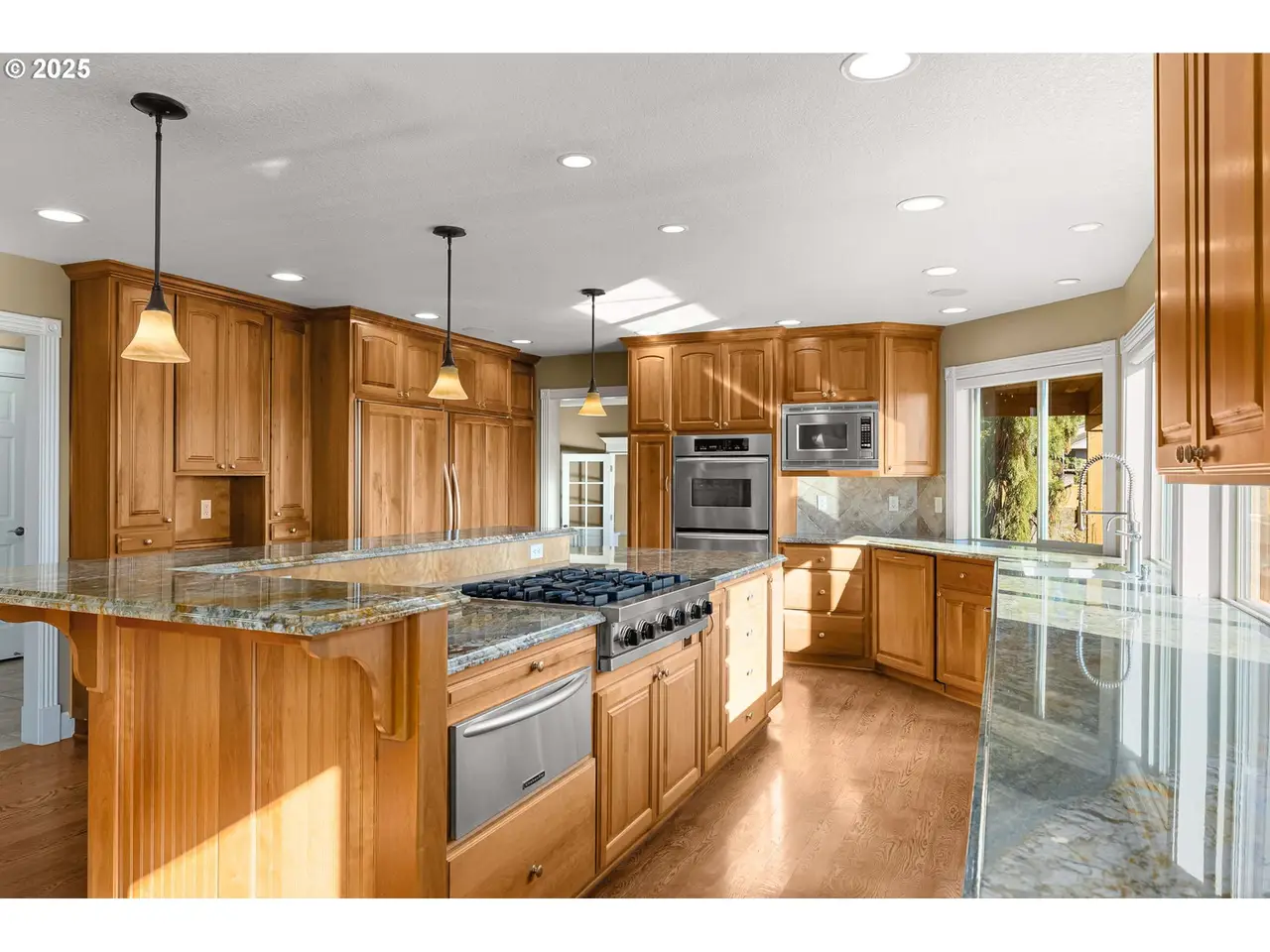 HALF ACRE LOT with 6000+ SF HOME AND 4-CAR/RV GARAGE! Outstanding Value for this incredible Multi-Generational Plan w/ space on main level to accommodate full guest quarters. This 5 Bedroom, 4.5 Bath home has room for everyone with a welcoming kitchen offering slab counters, high quality-custom cabinets, huge walk-in pantry, SUB-ZERO built-in fridge, DUAL Dishwashers, warming drawer! Spacious Living and Dining Room areas w/ adjacent den create multiple entertaining spaces for large gatherings. Newly finished Rec Room on lower level w/ wet bar and access to large backyard perfect for media, home gym or flex space. Primary Suite w/ french doors opening to private deck with gorgeous views, also offers a spa like bathroom and an enormous walk in closet! Recent updates include NEW EXTERIOR PAINT, NEW FENCING & NEW BACKYARD LANDSCAPING! Home is located in River Terrace Crossing and address may not map in GPS. DIRECTIONS: Take SW 150TH AVE to SW Woodhue St. turn LEFT on SW Peace Ave. Home just ahead on large corner lot. NO HOA DUES! Taxes are estimated. Tax records show year built 2004 when home was fully renovated. Original year built estimated to be 1985.