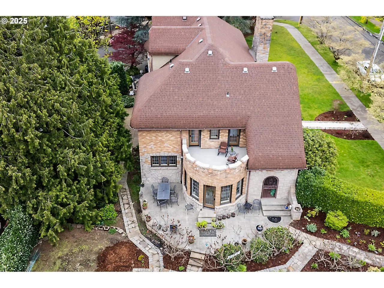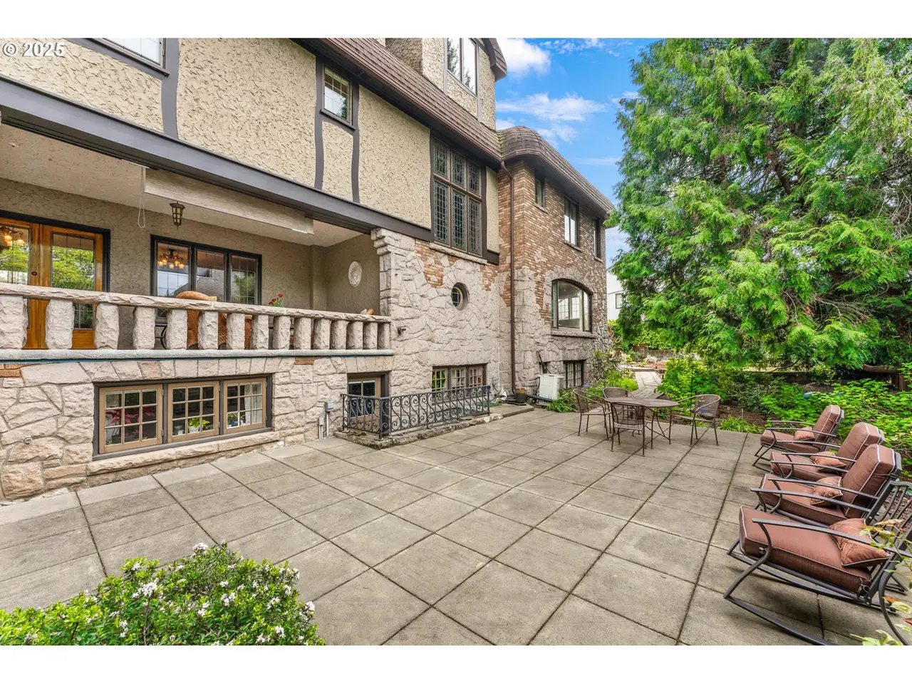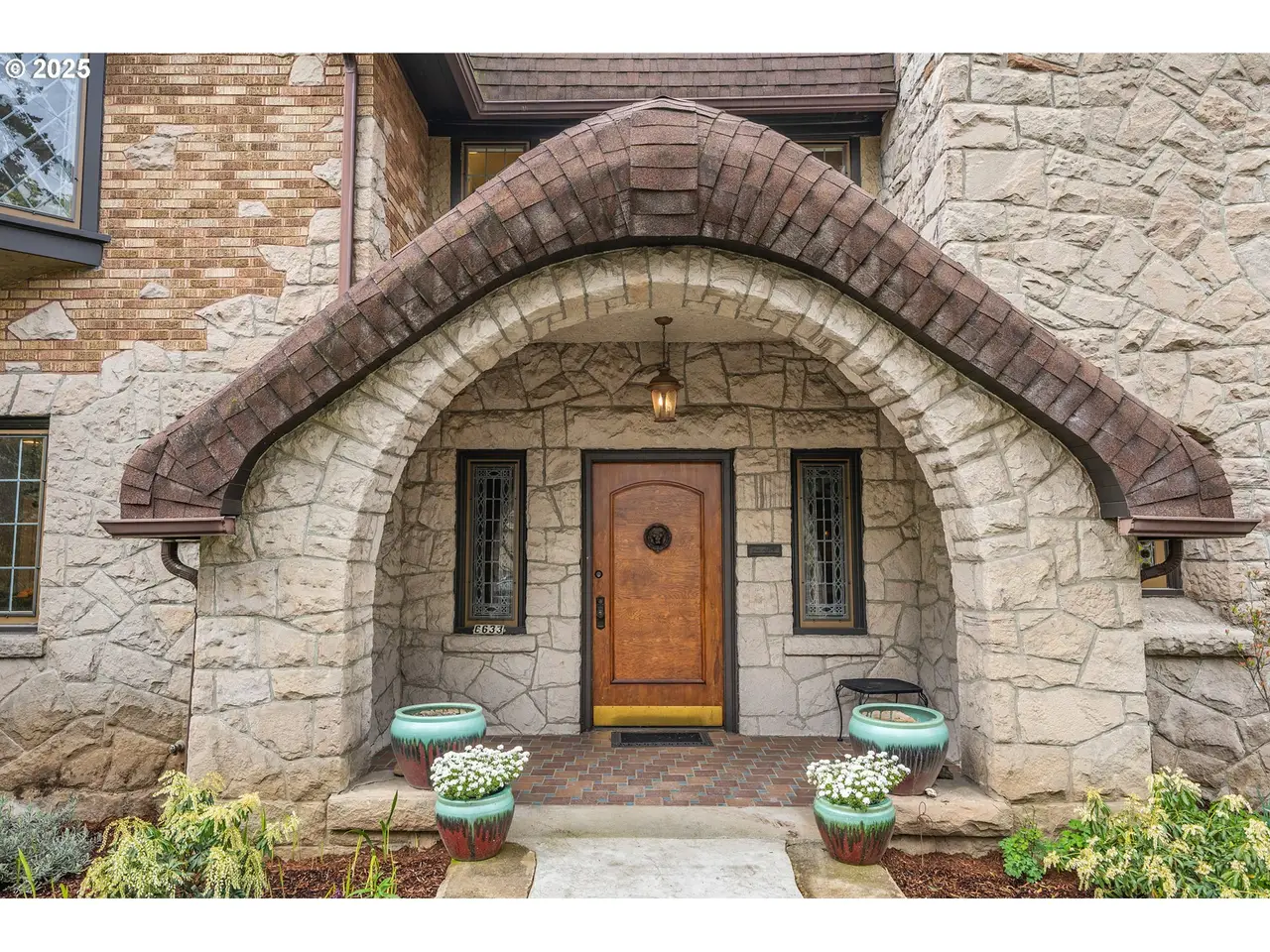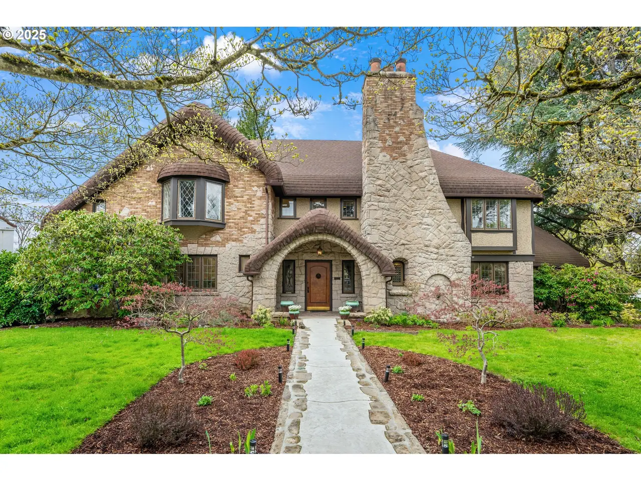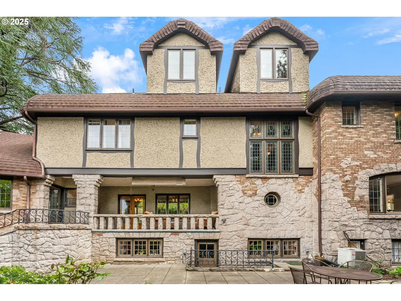 Yes, this is *that house*! Legendary Eastmoreland English Cottage with stunning stone, brick, & stucco exterior graced with an elaborate rolled roof. Pristine, honey-warm gumwood glows throughout the house, particularly astonishing in the fully paneled foyer and carved staircase/landing gallery with its three gorgeous leaded and stained glass windows. Designed for entertaining, the circular floor plan leads to a 20 x 25 living room with sculptural stone fireplace and French doors to a covered patio, expanding your gathering space. Explore the exquisite library with its vaulted ceilings, extensive built-ins, & cozy fireplace; greet the day in the brilliant morning room which is the lower level of the remarkable architectural turret. Period-sensitive, incredibly practical chef's kitchen w/handmade tile, pillowed marble flooring, granite countertops and island, huge gas range with pot-filler; carry your creations through to the long, gracious dining room where there is always room for one more at table. Everyone has their own retreat with four ensuite bedrooms on the second level, each with a delightful Art Deco-inspired Pratt & Larson full tile bath; the primary bedroom has a huge rooftop deck on top of the turret, with a beautiful view. The finished top level provides home office, media, game, & casual relaxation space, with its own heating/cooling system for ideal comfort. On the sleek, spacious lower level you'll find a wine cellar, storage, laundry, a bath with dog wash/gardener shower, & a full 1 BR/1BA apartment with its own entrance. The 14,900 SF lot provides gardening spaces as well as an extensive patio to enjoy the magisterial presence of the castle-like west side of the home. Shopping and dining are nearby in Woodstock and Sellwood/Moreland; you're also blocks from Eastmoreland Golf Course, Reed College, and MAX Orange Line.Located on a coveted street in SE Portland's premier destination neighborhood, this is more than a house: it's an experience. [Home Energy Score = 1]