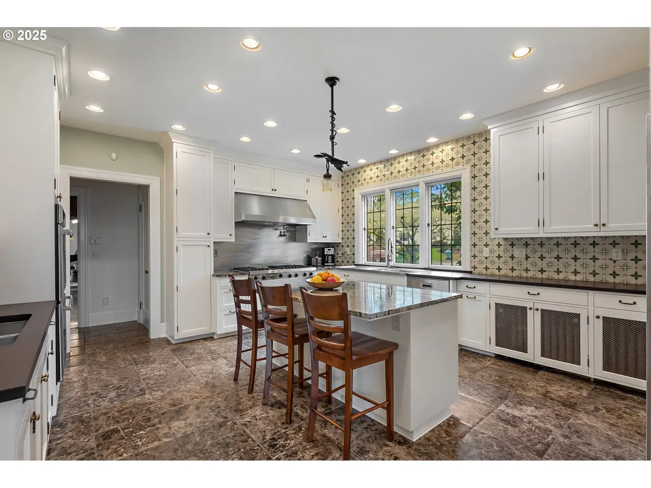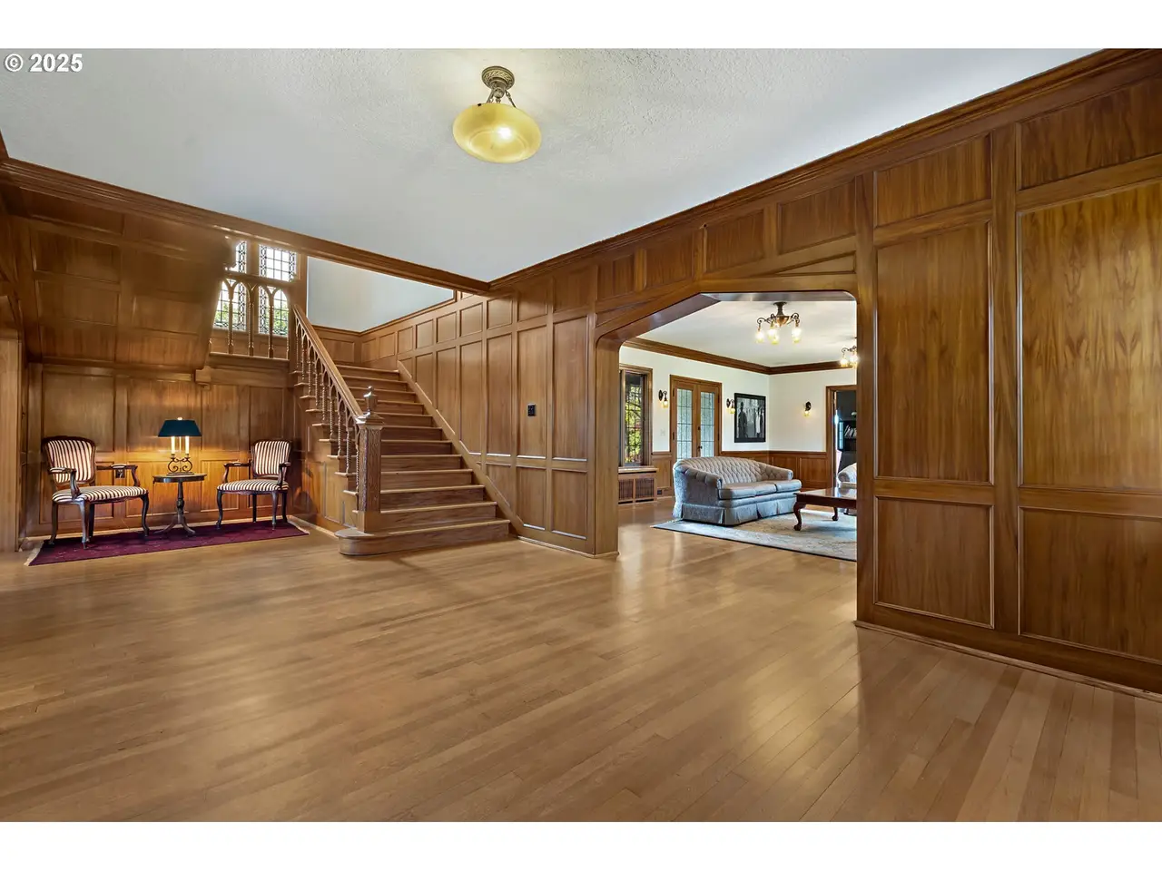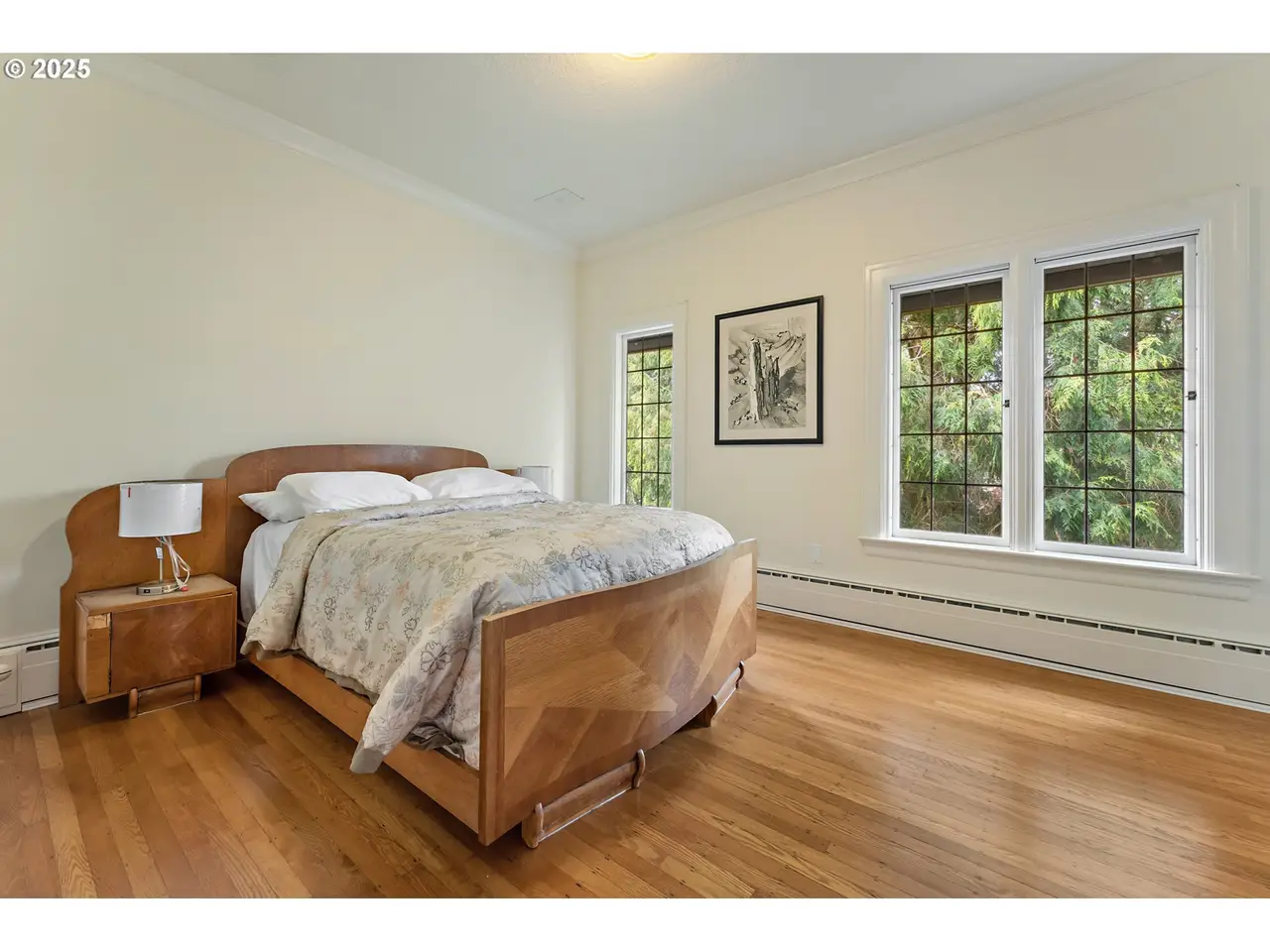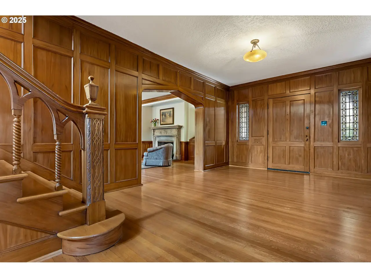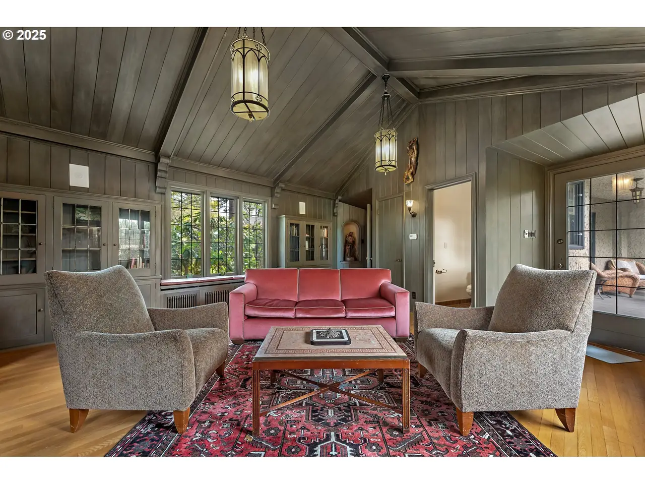 Yes, this is *that house*! Legendary Eastmoreland English Cottage with stunning stone, brick, & stucco exterior graced with an elaborate rolled roof. Pristine, honey-warm gumwood glows throughout the house, particularly astonishing in the fully paneled foyer and carved staircase/landing gallery with its three gorgeous leaded and stained glass windows. Designed for entertaining, the circular floor plan leads to a 20 x 25 living room with sculptural stone fireplace and French doors to a covered patio, expanding your gathering space. Explore the exquisite library with its vaulted ceilings, extensive built-ins, & cozy fireplace; greet the day in the brilliant morning room which is the lower level of the remarkable architectural turret. Period-sensitive, incredibly practical chef's kitchen w/handmade tile, pillowed marble flooring, granite countertops and island, huge gas range with pot-filler; carry your creations through to the long, gracious dining room where there is always room for one more at table. Everyone has their own retreat with four ensuite bedrooms on the second level, each with a delightful Art Deco-inspired Pratt & Larson full tile bath; the primary bedroom has a huge rooftop deck on top of the turret, with a beautiful view. The finished top level provides home office, media, game, & casual relaxation space, with its own heating/cooling system for ideal comfort. On the sleek, spacious lower level you'll find a wine cellar, storage, laundry, a bath with dog wash/gardener shower, & a full 1 BR/1BA apartment with its own entrance. The 14,900 SF lot provides gardening spaces as well as an extensive patio to enjoy the magisterial presence of the castle-like west side of the home. Shopping and dining are nearby in Woodstock and Sellwood/Moreland; you're also blocks from Eastmoreland Golf Course, Reed College, and MAX Orange Line.Located on a coveted street in SE Portland's premier destination neighborhood, this is more than a house: it's an experience. [Home Energy Score = 1]