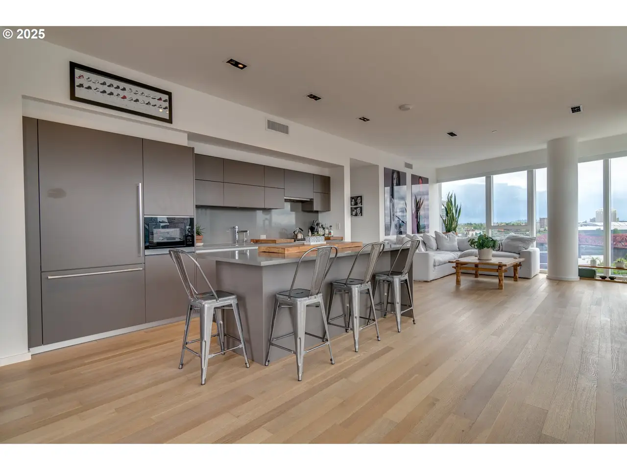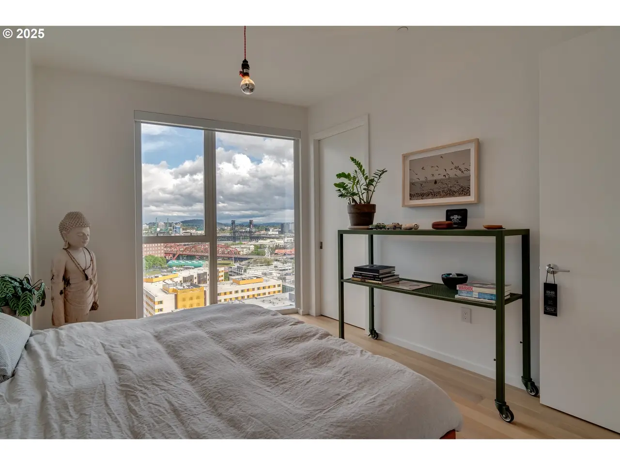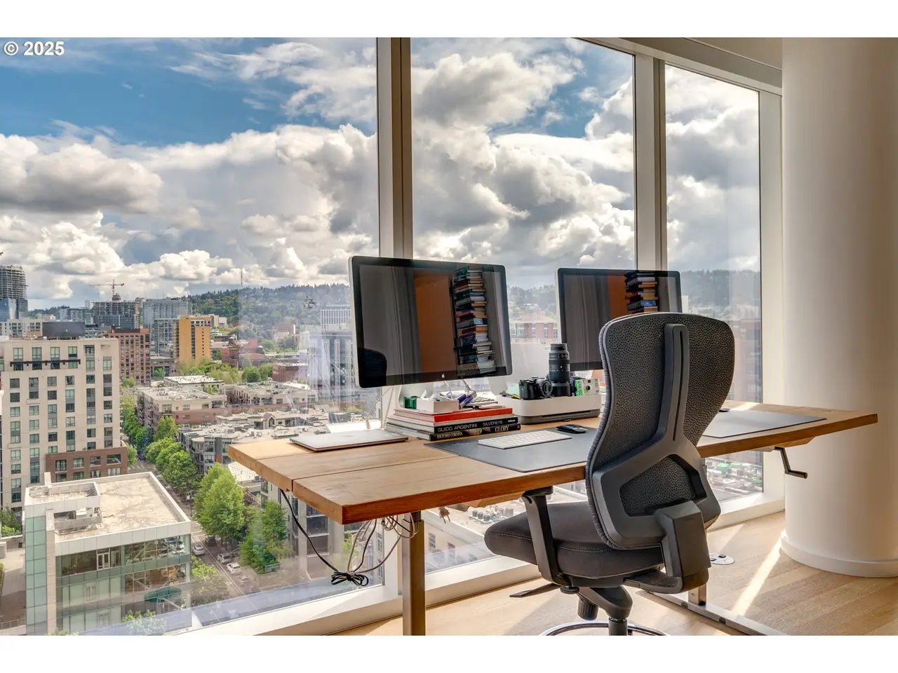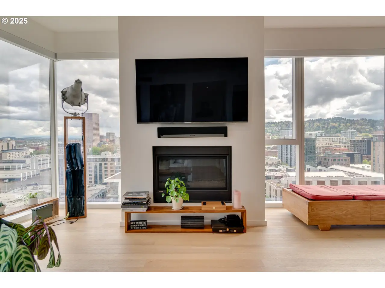 Breathtaking views of Mt. Hood and exceptional natural light define this rare three-bedroom, two-bathroom corner unit in the luxurious Cosmopolitan. Truly one of a kind, this home features expansive floor-to-ceiling windows and a stunning chef's kitchen with Miele appliances and a pristine quartz island overlooking the city. Thoughtful upgrades throughout include wide-plank hardwood floors, electric blinds on all windows, and blackout electric blinds in the bedroom. The primary suite offers a customized walk-in closet, while the versatile den has been enlarged and enclosed with sliding doors to function as a true third bedroom. For added comfort and privacy, the guest room includes an additional entry door. Whether you're enjoying morning coffee on the private covered deck or unwinding by the gas fireplace in the open living area, every space balances comfort with style. Additional highlights include main-floor tandem parking, deeded storage, and access to premium amenities such as a 24/7 concierge, fitness center, and elegant common areas. Nestled between parks, galleries, and top-rated restaurants in Portland's vibrant Pearl District, this is elevated urban living at its finest!