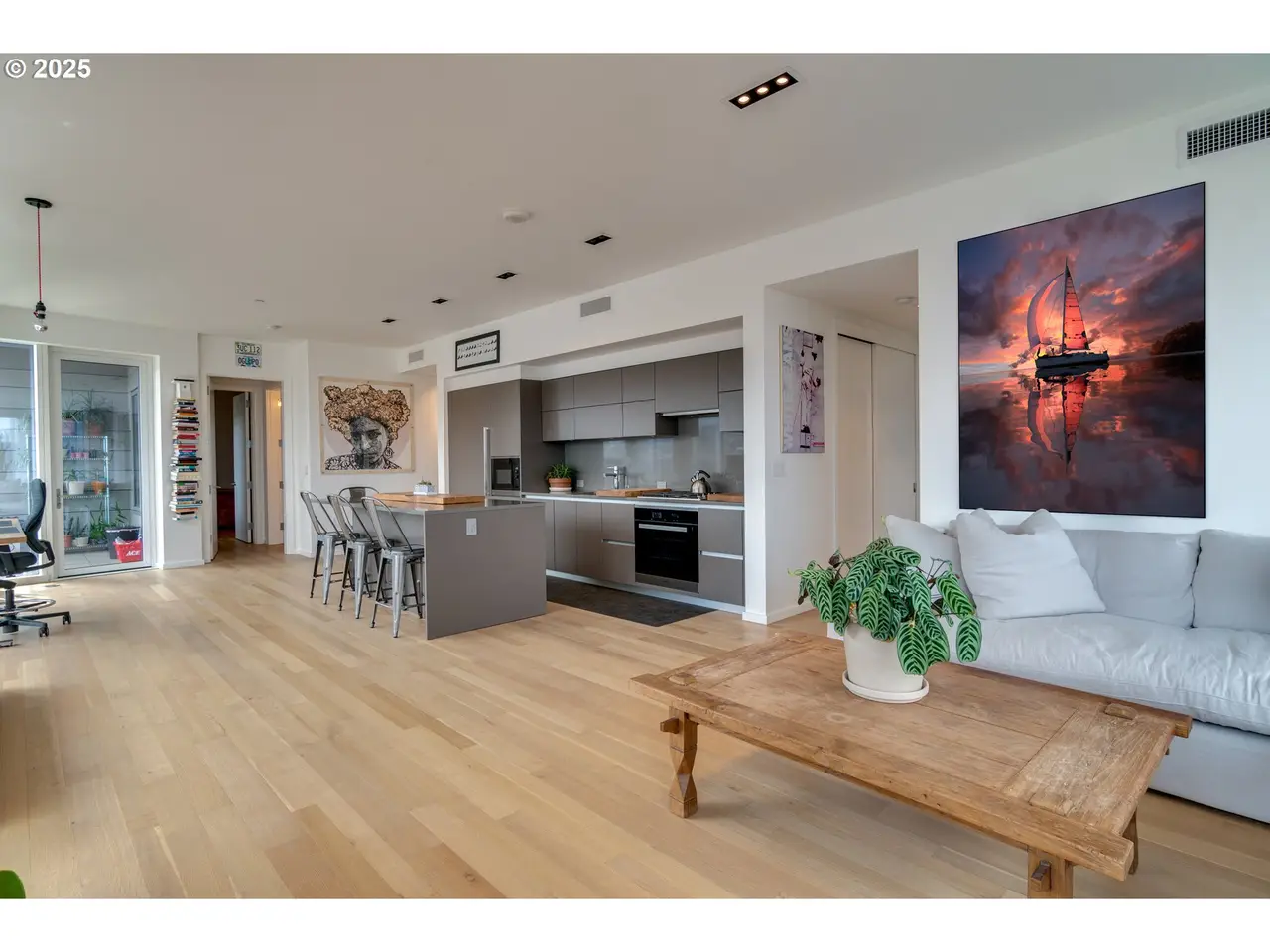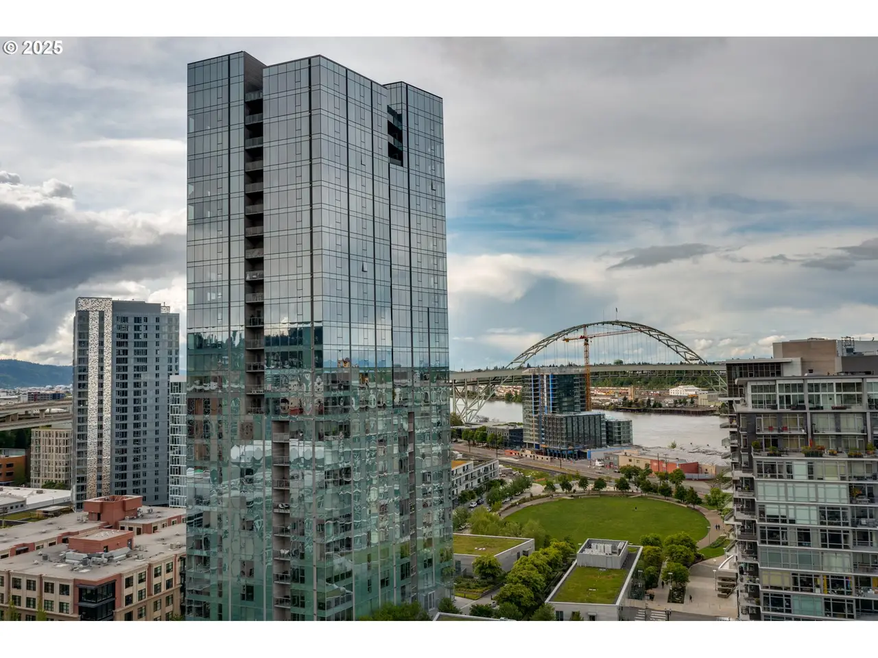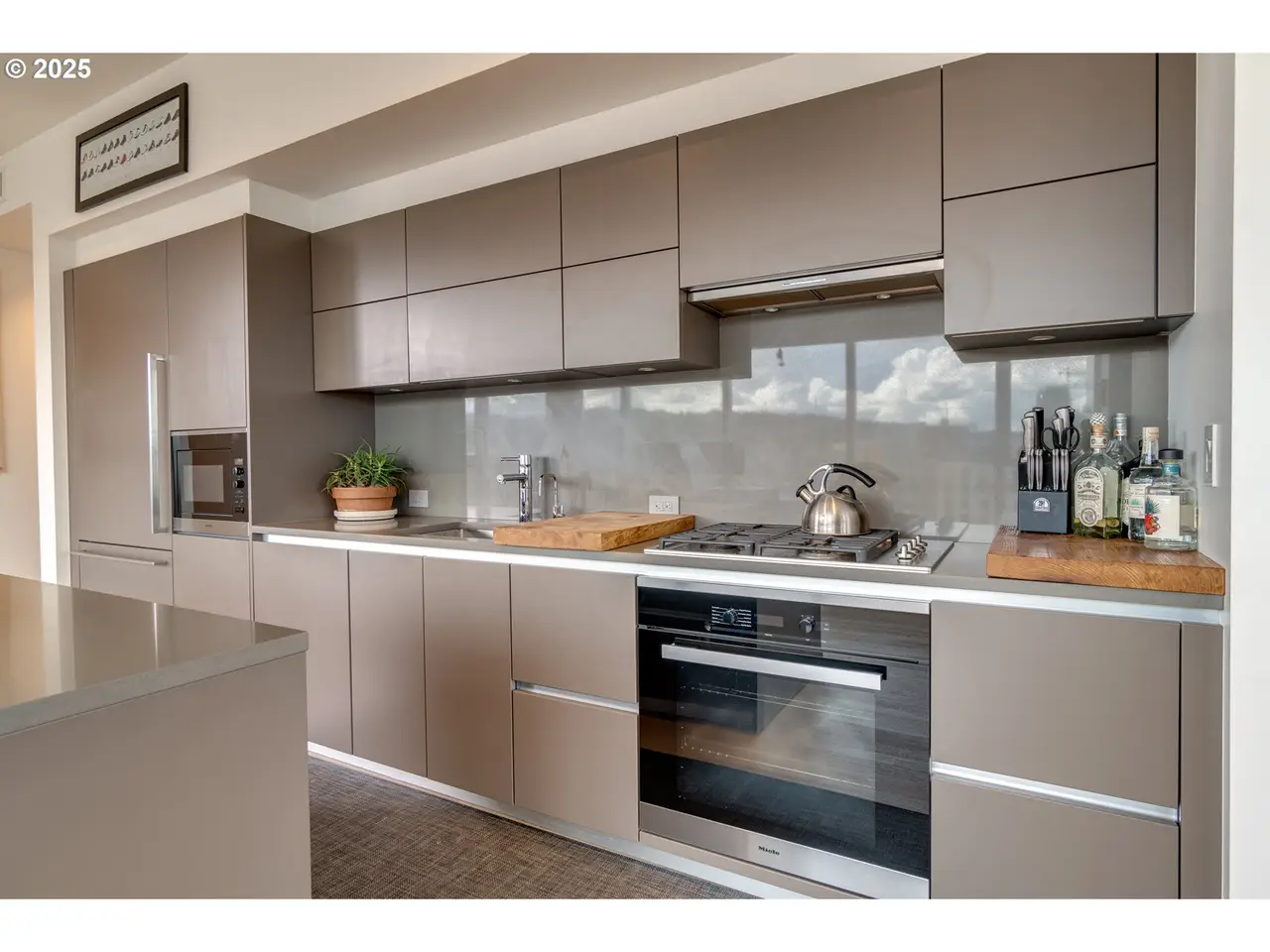 Breathtaking views of Mt. Hood and exceptional natural light define this rare three-bedroom, two-bathroom corner unit in the luxurious Cosmopolitan. Truly one of a kind, this home features expansive floor-to-ceiling windows and a stunning chef's kitchen with Miele appliances and a pristine quartz island overlooking the city. Thoughtful upgrades throughout include wide-plank hardwood floors, electric blinds on all windows, and blackout electric blinds in the bedroom. The primary suite offers a customized walk-in closet, while the versatile den has been enlarged and enclosed with sliding doors to function as a true third bedroom. For added comfort and privacy, the guest room includes an additional entry door. Whether you're enjoying morning coffee on the private covered deck or unwinding by the gas fireplace in the open living area, every space balances comfort with style. Additional highlights include main-floor tandem parking, deeded storage, and access to premium amenities such as a 24/7 concierge, fitness center, and elegant common areas. Nestled between parks, galleries, and top-rated restaurants in Portland's vibrant Pearl District, this is elevated urban living at its finest!