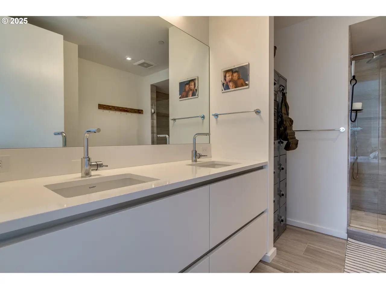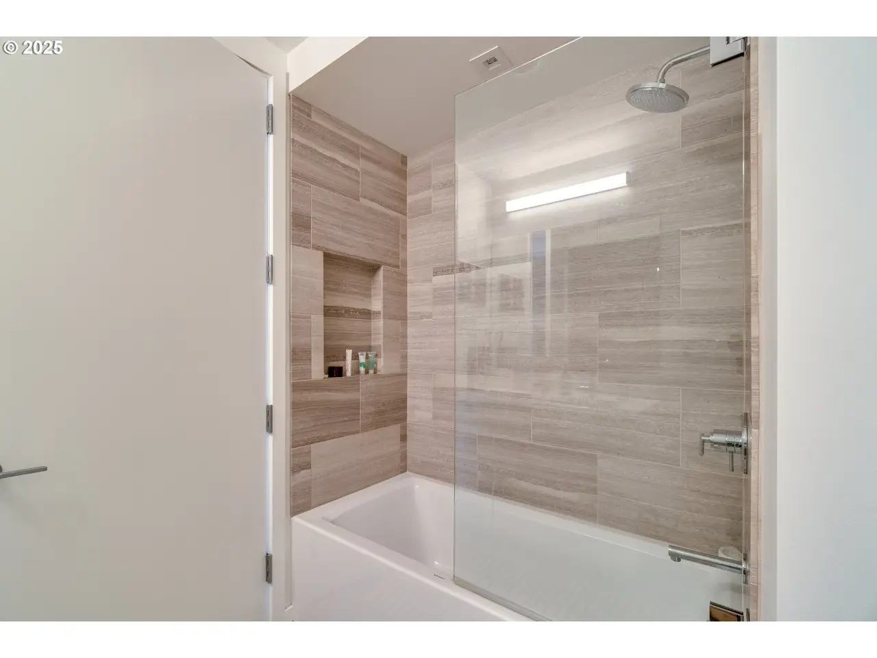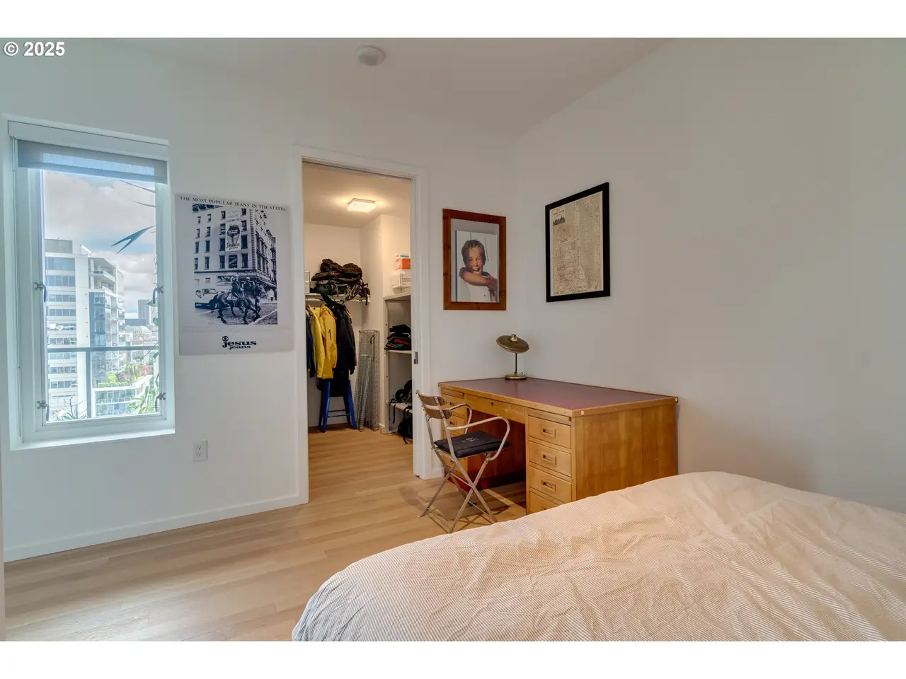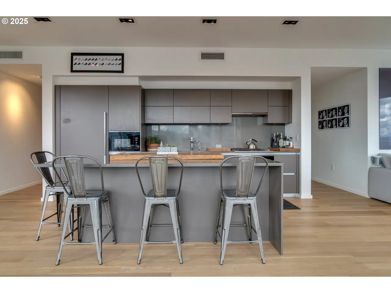Breathtaking views of Mt. Hood and exceptional natural light define this rare three-bedroom, two-bathroom corner unit in the luxurious Cosmopolitan. Truly one of a kind, this home features expansive floor-to-ceiling windows and a stunning chef's kitchen with Miele appliances and a pristine quartz island overlooking the city. Thoughtful upgrades throughout include wide-plank hardwood floors, electric blinds on all windows, and blackout electric blinds in the bedroom. The primary suite offers a customized walk-in closet, while the versatile den has been enlarged and enclosed with sliding doors to function as a true third bedroom. For added comfort and privacy, the guest room includes an additional entry door. Whether you're enjoying morning coffee on the private covered deck or unwinding by the gas fireplace in the open living area, every space balances comfort with style. Additional highlights include main-floor tandem parking, deeded storage, and access to premium amenities such as a 24/7 concierge, fitness center, and elegant common areas. Nestled between parks, galleries, and top-rated restaurants in Portland's vibrant Pearl District, this is elevated urban living at its finest!