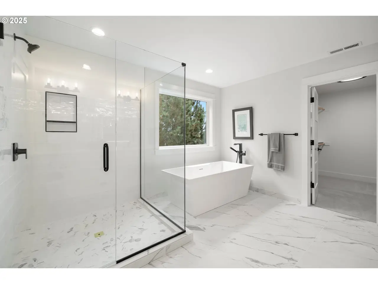 Elegant Primary Suite with Glass Shower and Pedestal Tub