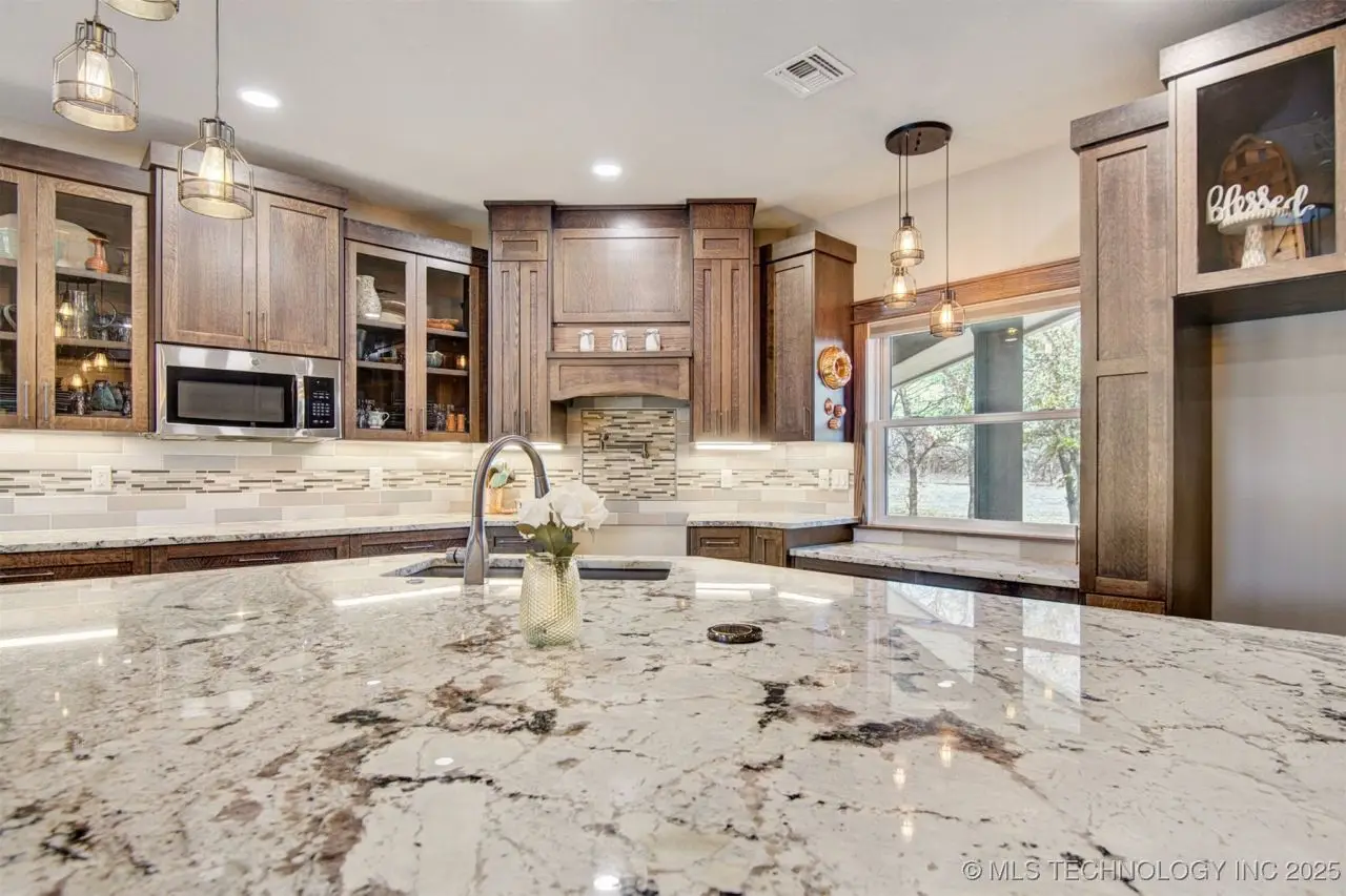 Dream country estate! 5-bedroom, 3.5-bath, 5,060 sq ft (AP) home built in 2020 combines luxury and tranquility. Gourmet kitchen with stainless steel appliances, granite counters, a large island, and a spacious breakfast nook with garden views. Set on 10 park-like acres with an additional 70 acres available. Open living with gas fireplace flows into a 2nd dining room. Primary suite includes a spa-like bath with heated slate floors, an oversized jetted tub, a large shower with dual heads, and an office/studio that opens to a covered patio with serene views. Upstairs, 3 spacious bedrooms and a large game room above the garage offer privacy and flexibility. Main level also offers a guest/in-law suite, safe room, and oversized laundry/wet room. For the hobbyist or business owner, the 80x50 fully insulated shop includes 1,360 sq ft of living quarters, perfect for a studio or office. It is equipped with concrete floors, a 500 sq ft barn loft, 4 electric pull-through bay doors, and 220V wiring. The property also features a carport, cross-fencing, cattle pens, and 2 ponds. Enjoy outdoor living with an above-ground pool, rustic cabana-style pool house, pull-through circle drive, and breathtaking views. Additional acreage available, prime for hunting and recreation.