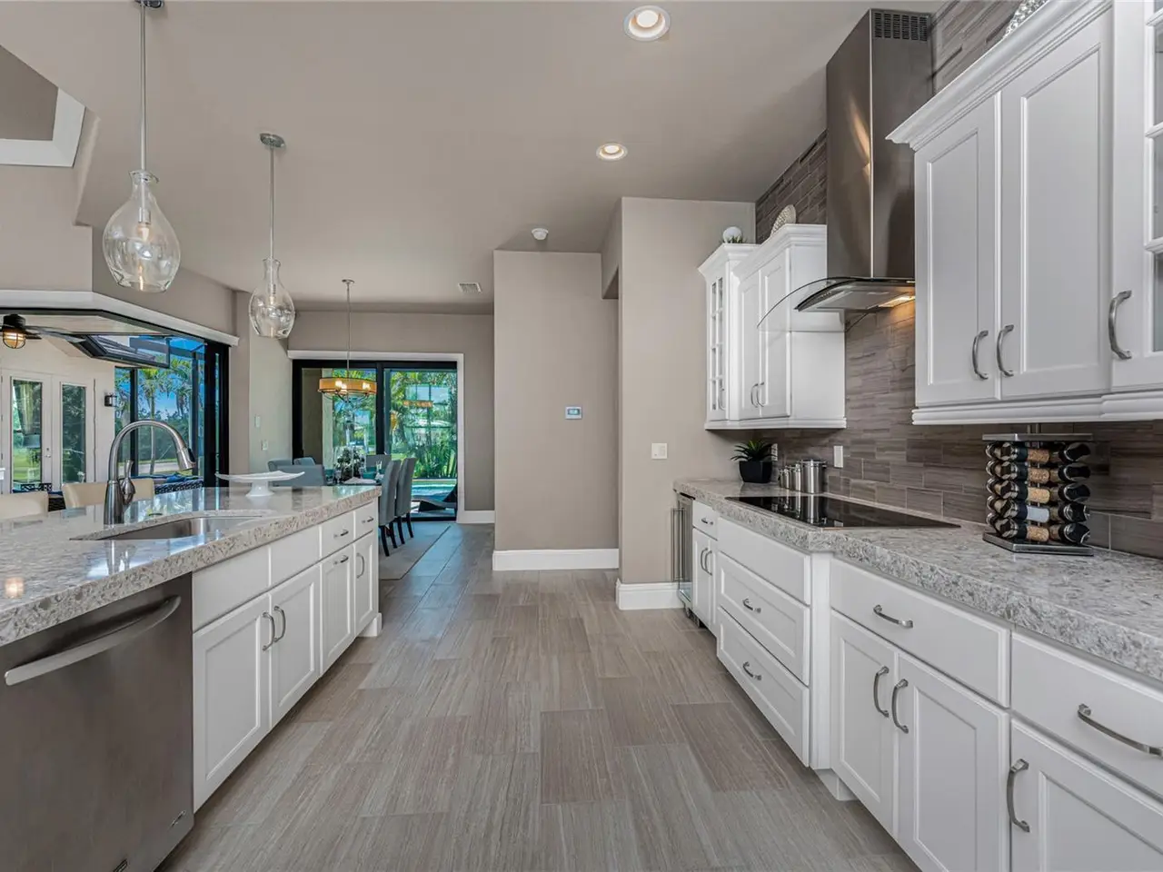 Welcome to your dream home! This former builder's model, crafted by award-winning PGI Homes in 2014, blends comfort, style, and luxury. Offered turnkey furnished (with some exclusions), this 3-bedroom, 2-bath home with an office spans 2,680 sq. ft. features an oversized lanai and pool area. A circular paver driveway with lush landscaping leads to an elegant double-door entry. Inside, soaring ceilings with crown molding, an open-concept design and abundant natural light highlight the beautifully furnished space. The great room features a coffered ceiling, while the dining room showcases a unique architectural ceiling. The gourmet kitchen boasts a large 4" Silestone quartz countertop with the center island seating for four, a striking tile backsplash, KitchenAid stainless steel appliances, an induction cooktop with a sleek hood, and ample storage in classic white cabinetry. The luxurious primary suite includes a sitting area, French doors to the pool, a tray ceiling, and elegant lighting. Two walk-in closets lead to a spa-like bath with a crystal chandelier, soaking tub, Roman shower with dual heads, and dual vanities with Silestone counters. The guest wing offers two spacious bedrooms and a pool-access bath with custom tile and a glass-walled shower. A standout 3-car garage features wood flooring, crown molding, recessed lighting, and independent climate control ideal for vehicles or a home gym. Smart home features include a Z-Wave system, security cameras, & a Nuvo sound system with built-in speakers. Disappearing sliders open to a wood-ceilinged lanai, summer kitchen, and wall-mounted TV. The expansive travertine pool deck boasts a heated pool with fountains, a sun platform, a submerged granite bar, and multiple lounging area all overlooking a gorgeous lake view. Close to Ponce de Leon Park and minutes to Fishermen's Village - THIS IS YOUR DREAM HOME!