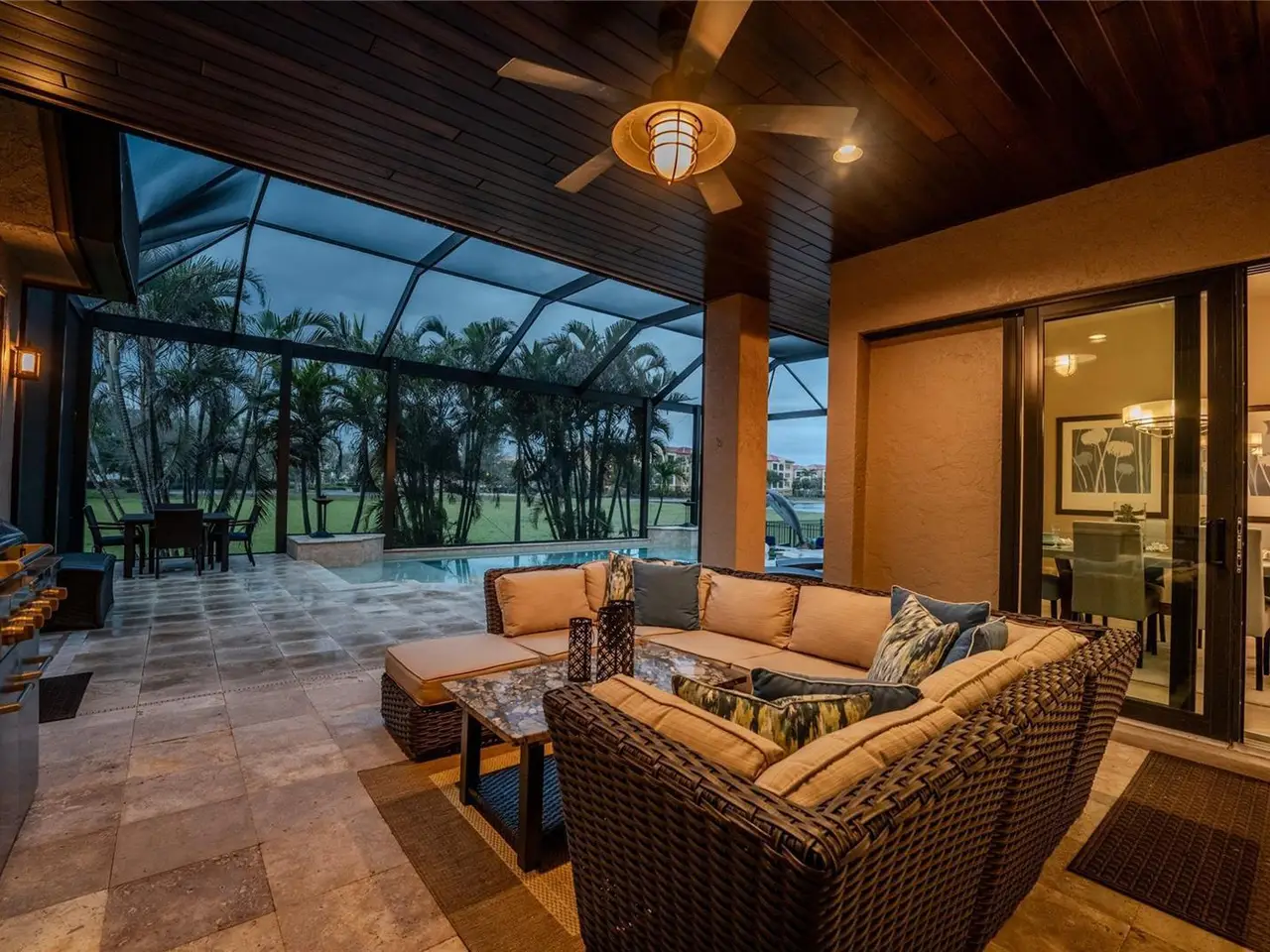 • Wood-ceilinged lanai with summer kitchen