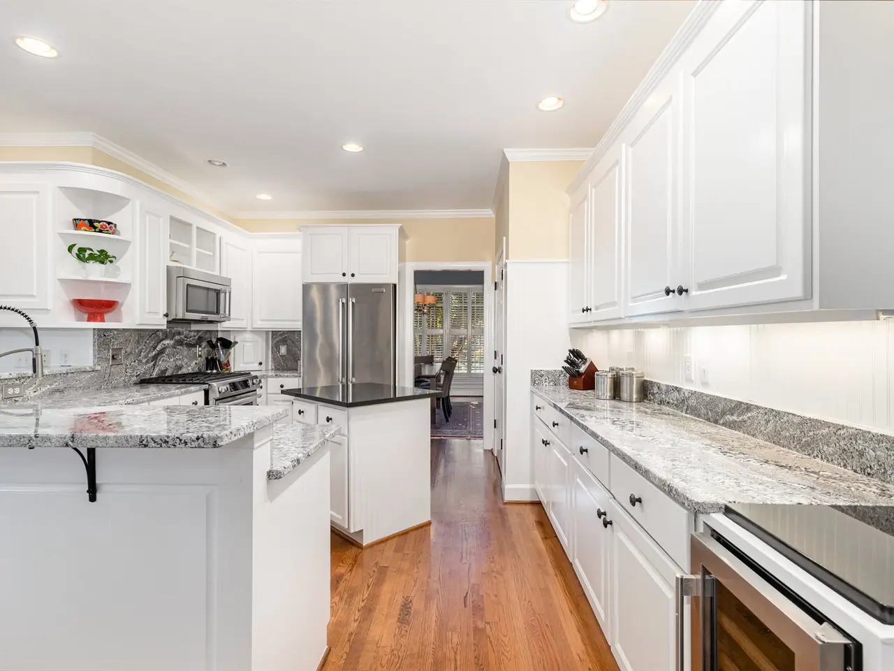 Stunning home in the highly sought-after Wentworth Park neighborhood! Elegant North Raleigh Home with Designer Upgrades & Outdoor Oasis. This residence features brand-new granite kitchen countertops, renovated spa-like Master Bath (new tile floors, new walk-in shower, new light fixtures and mirrors), and freshly painted interior, creating a bright and welcoming space. Hardwood floors, crown molding, custom cabinetry, updated guest baths, and formal living and dining rooms blend sophistication with warmth.The family room offers a cozy fireplace, while the bright eat-in kitchen and spacious upstairs bonus room with rear staircase provide plenty of space to gather.Step outside to enjoy the screened-in porch, an expansive full-length deck, and a park-like backyard with lighted pathways. Perfectly located in North Raleigh, just minutes from top restaurants and shopping.
