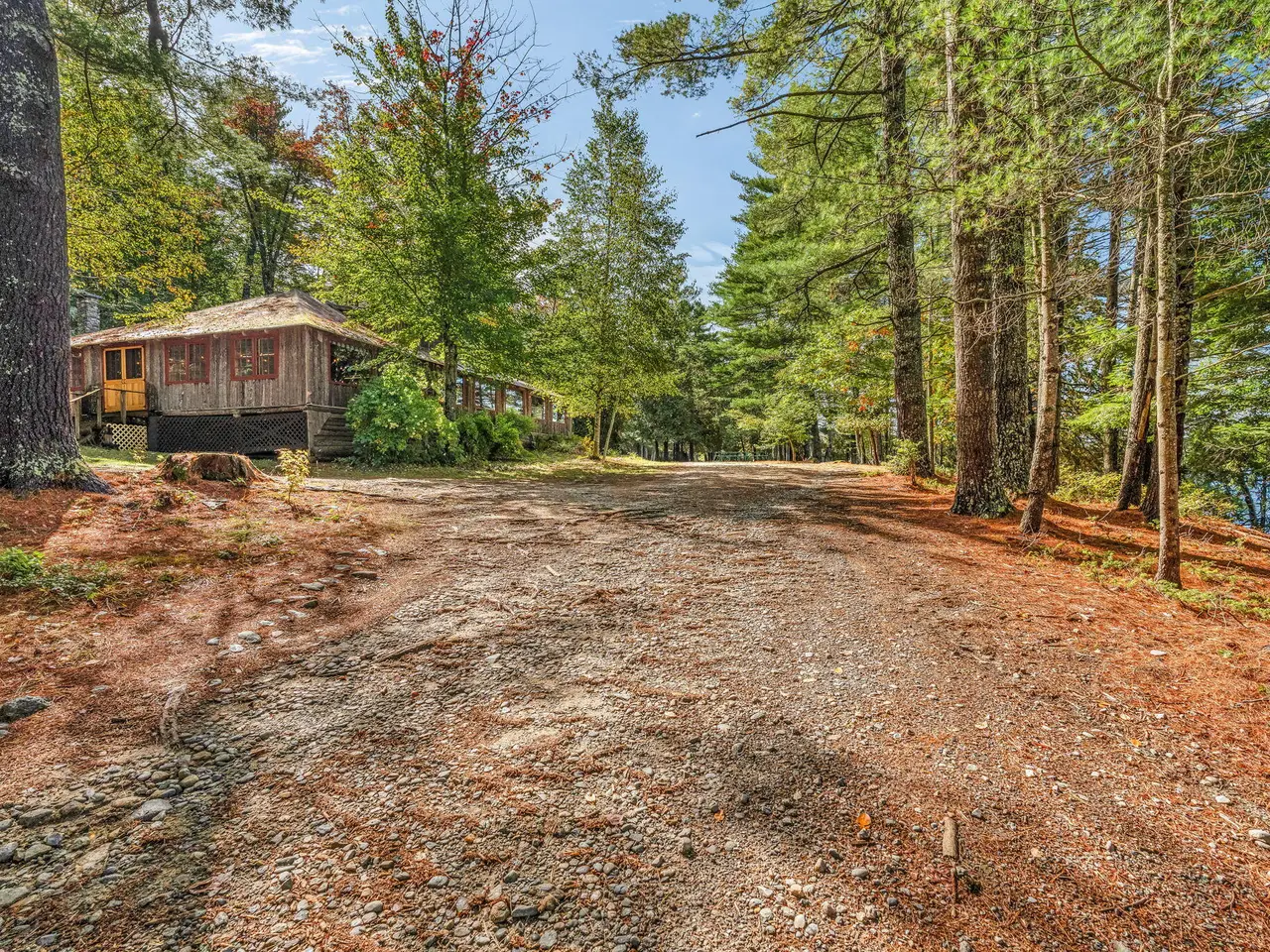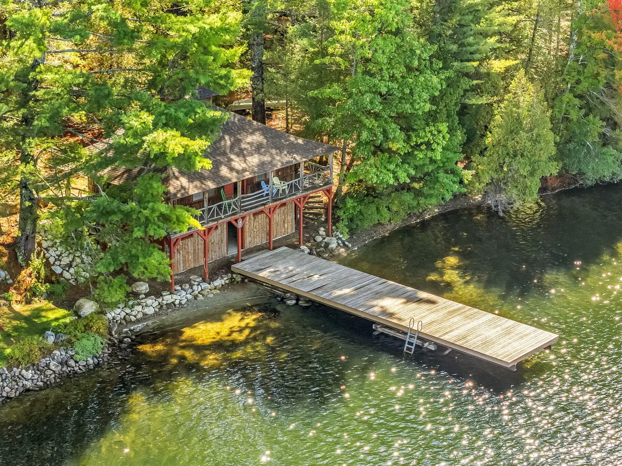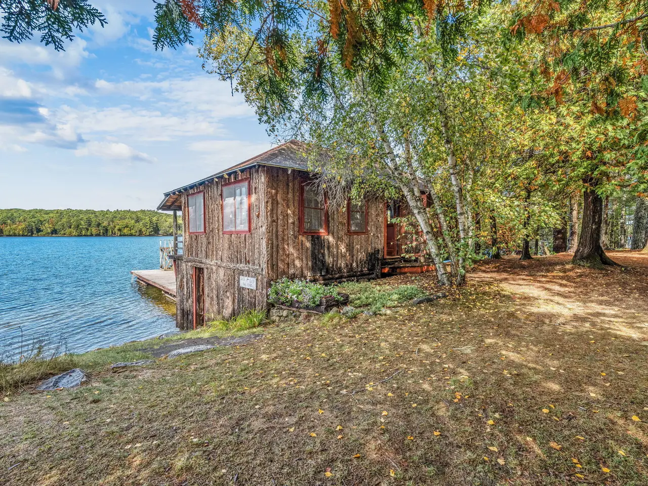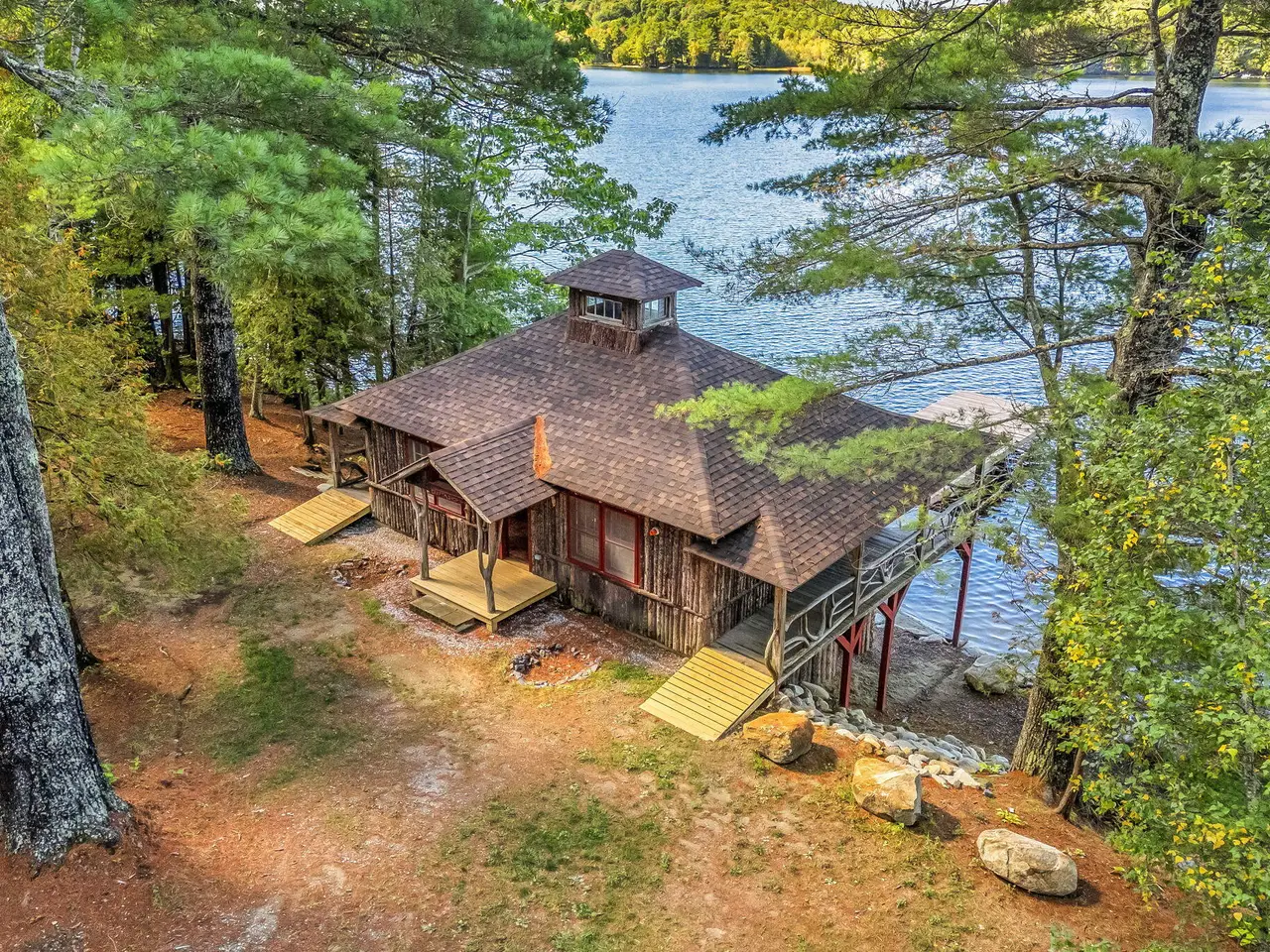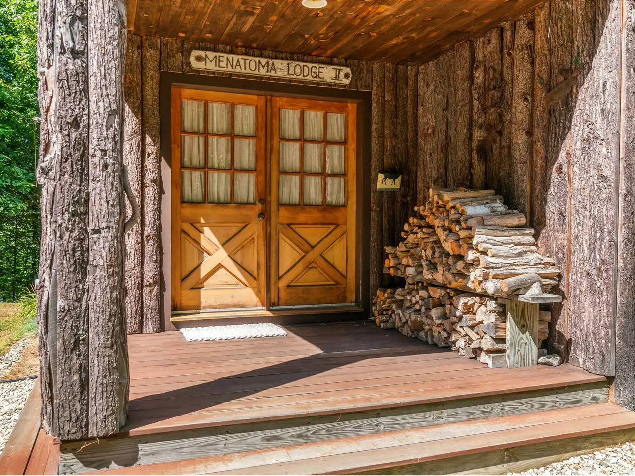 LOVEJOY POND Magnificent custom built Maine lodge architecturally designed to provide that classic, rustic feel with all the modern day amenities & system! Originally the Menatoma Camp ''Lodge'' sadly destroyed in a fire, this 2001 structure was built to encompass everything it means to be in nature at the lake with loved ones! The central living room is a wonderful place to gather around the gorgeous natural stone fireplace that reaches to a lofty ceiling with grand staircases on each side. Open game room & two dedicated dining areas adjacent to a fully equipped kitchen is ideal for entertaining large groups. Office/den & laundry room with half bath complete the main level, while 4 spacious bedrooms, two full baths, 2 walk-in linen closets & a nice sitting area complete the second level. Outside is a covered porch, 2 open decks & a wonderful screen porch allowing you to enjoy the outdoors while listening to the loons. The property is made up of 2 separate lots with 400' of beautiful lakefront with a gently sloping, pebble bottom swim area & private dock which can be accessed by a park-like walking path through the woods, or your own private road. While surrounded by woodlands on 3.74 acres, the rest of the association's amenities next door can easily be accessed by footpath or road. Dues include access to over 36 acres, 770' of shared lakefront with a sandy beach, protected swimming area with float, 2 large permanent docks, swim float & diving platform, Dining Hall, Laundry Building, Craft Shop, Tennis/Basketball/Pickleball Courts, Baseball Field, dumpster, grounds & tree service. Lovejoy is a beautiful lake with no public boat ramp, no invasive aquatic plants & excellent sport fishing with breeding pairs of loons that raise chicks on the lake each year! Lodge is fully insulated, has an 18 panel solar array supporting all needs, private septic system & access high speed internet if desired. Welcome to a comfortable, easy life at the lake with room for all!