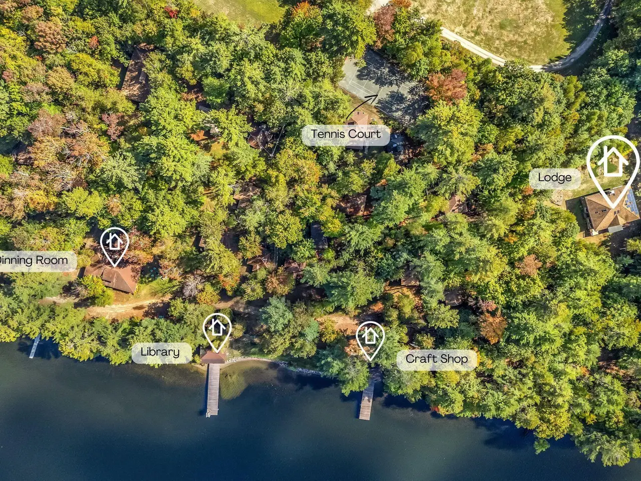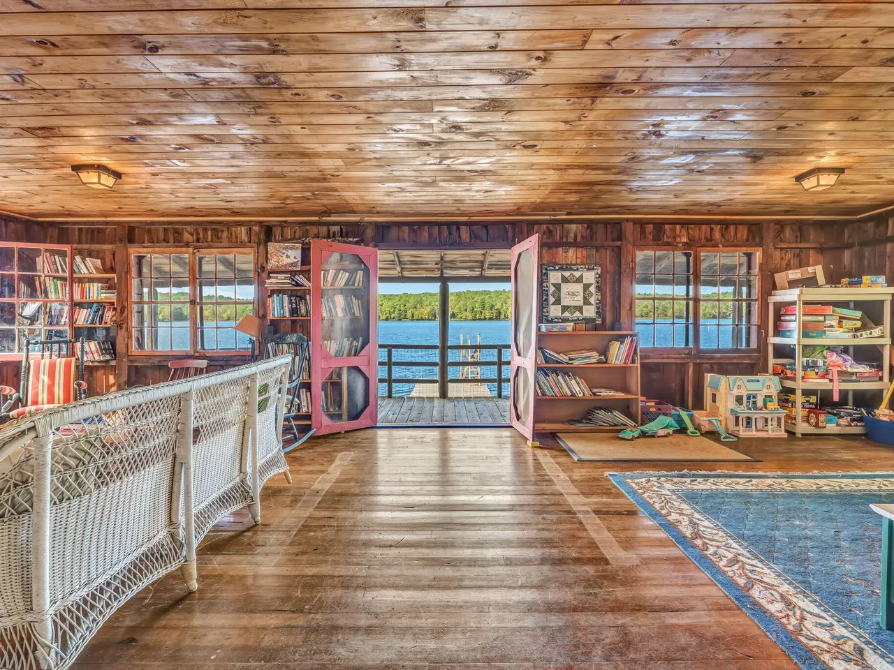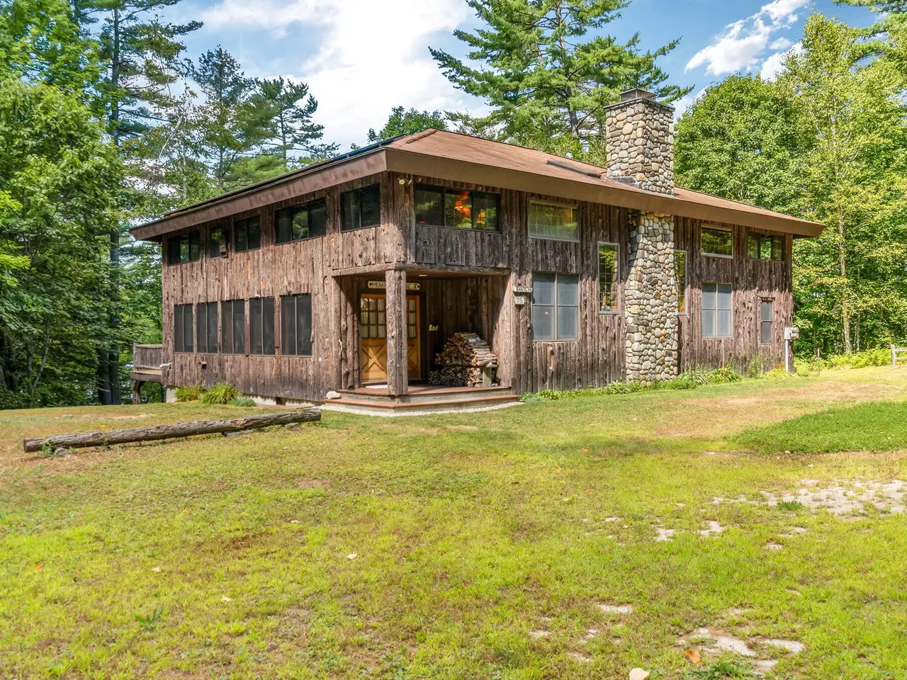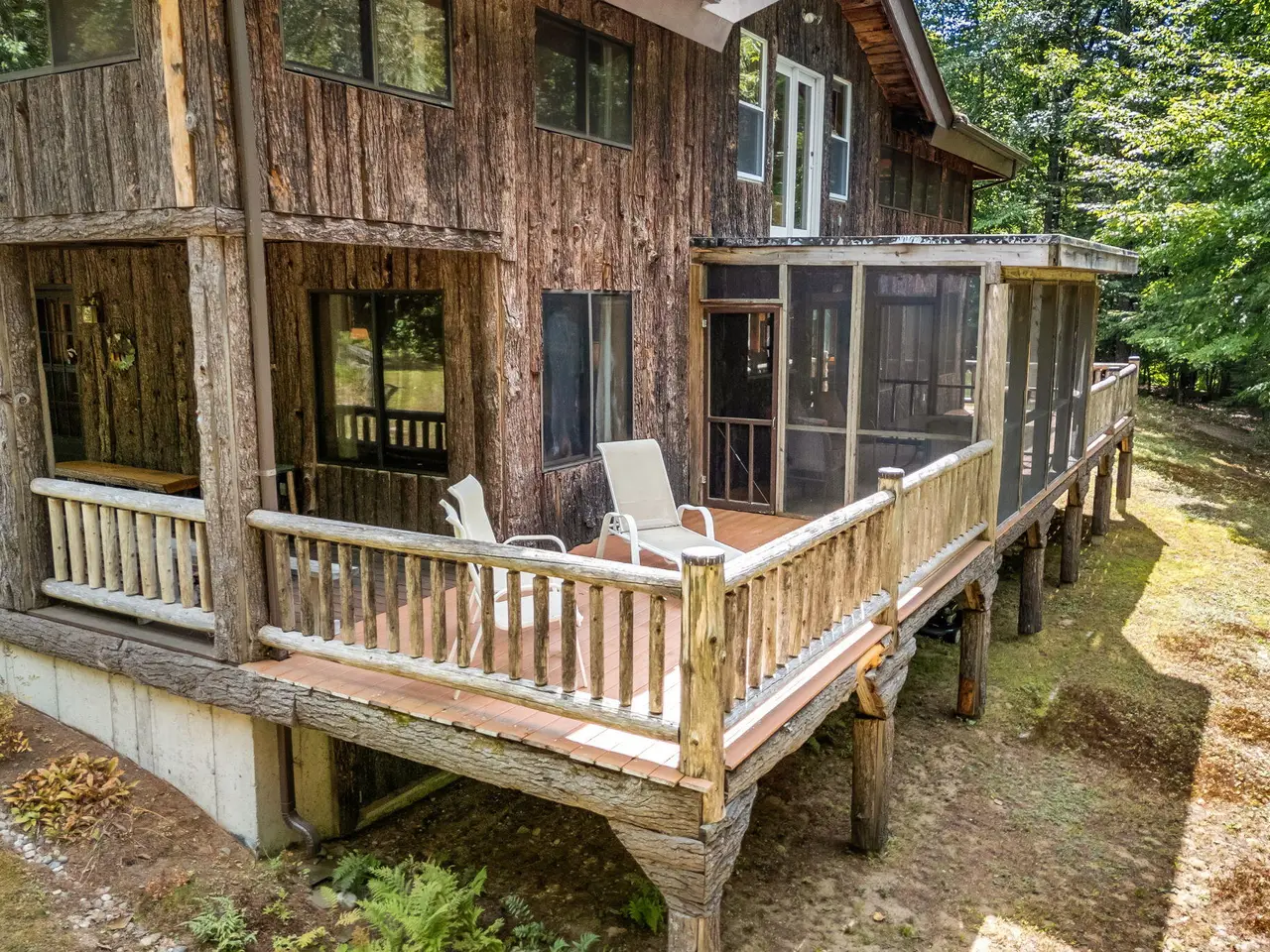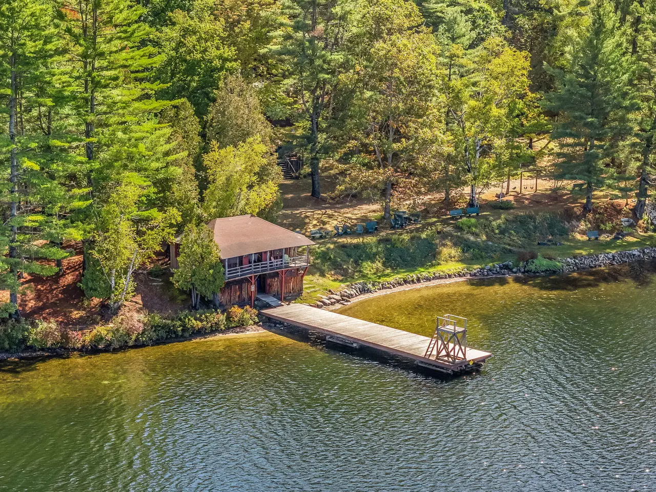 LOVEJOY POND Magnificent custom built Maine lodge architecturally designed to provide that classic, rustic feel with all the modern day amenities & system! Originally the Menatoma Camp ''Lodge'' sadly destroyed in a fire, this 2001 structure was built to encompass everything it means to be in nature at the lake with loved ones! The central living room is a wonderful place to gather around the gorgeous natural stone fireplace that reaches to a lofty ceiling with grand staircases on each side. Open game room & two dedicated dining areas adjacent to a fully equipped kitchen is ideal for entertaining large groups. Office/den & laundry room with half bath complete the main level, while 4 spacious bedrooms, two full baths, 2 walk-in linen closets & a nice sitting area complete the second level. Outside is a covered porch, 2 open decks & a wonderful screen porch allowing you to enjoy the outdoors while listening to the loons. The property is made up of 2 separate lots with 400' of beautiful lakefront with a gently sloping, pebble bottom swim area & private dock which can be accessed by a park-like walking path through the woods, or your own private road. While surrounded by woodlands on 3.74 acres, the rest of the association's amenities next door can easily be accessed by footpath or road. Dues include access to over 36 acres, 770' of shared lakefront with a sandy beach, protected swimming area with float, 2 large permanent docks, swim float & diving platform, Dining Hall, Laundry Building, Craft Shop, Tennis/Basketball/Pickleball Courts, Baseball Field, dumpster, grounds & tree service. Lovejoy is a beautiful lake with no public boat ramp, no invasive aquatic plants & excellent sport fishing with breeding pairs of loons that raise chicks on the lake each year! Lodge is fully insulated, has an 18 panel solar array supporting all needs, private septic system & access high speed internet if desired. Welcome to a comfortable, easy life at the lake with room for all!