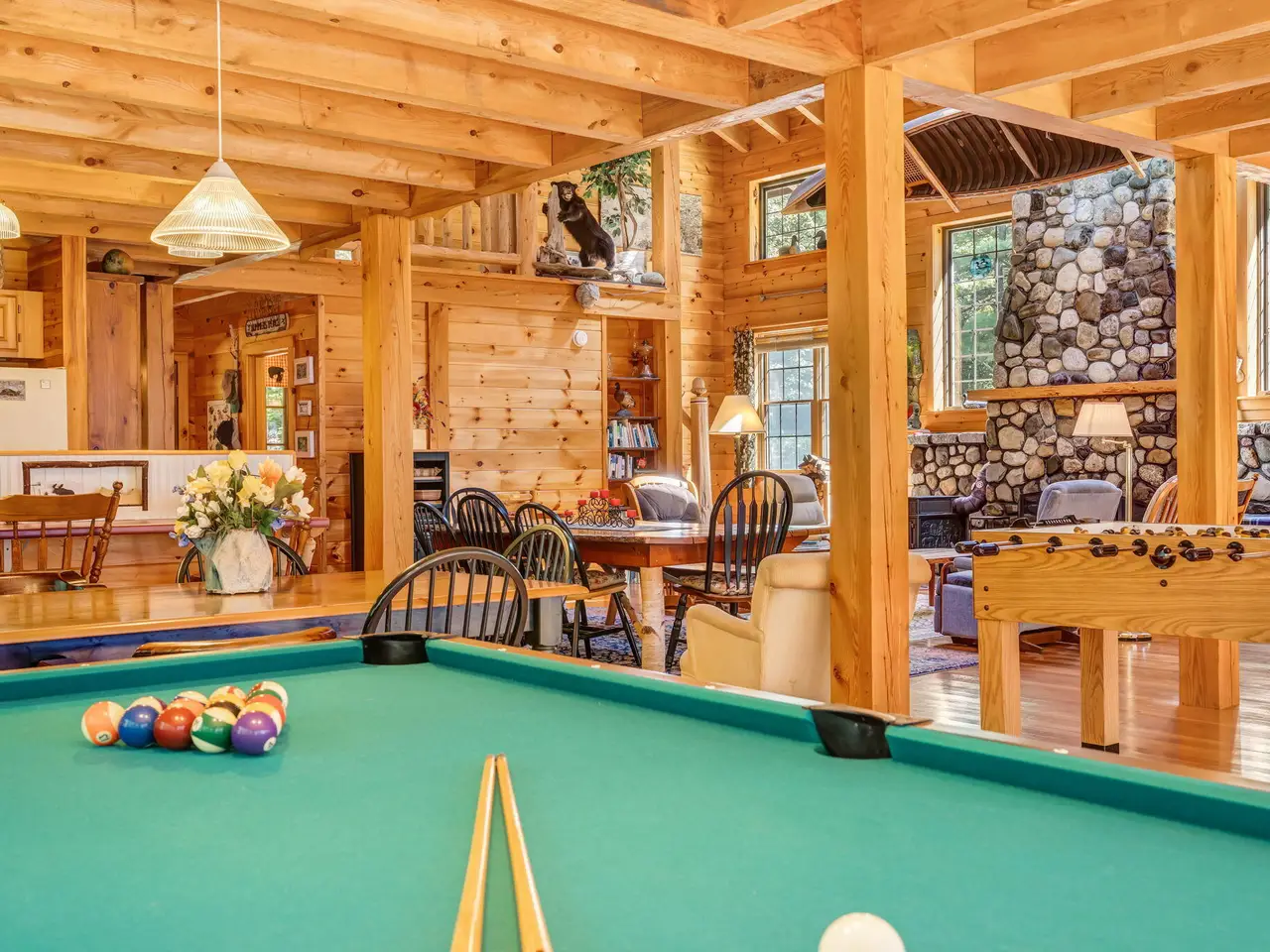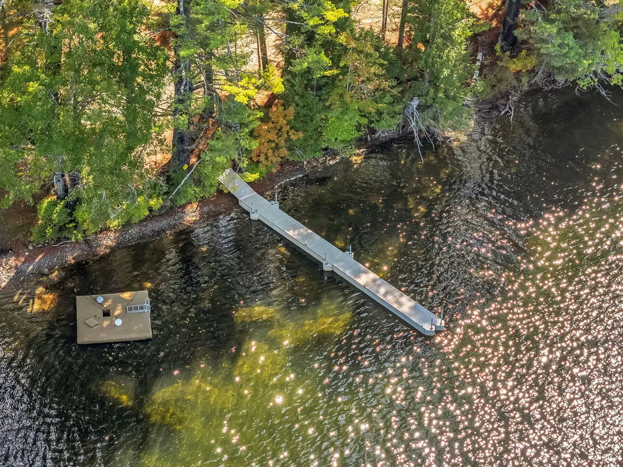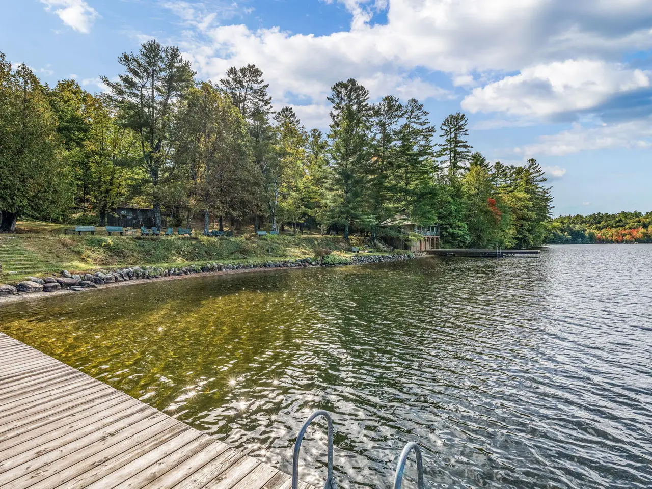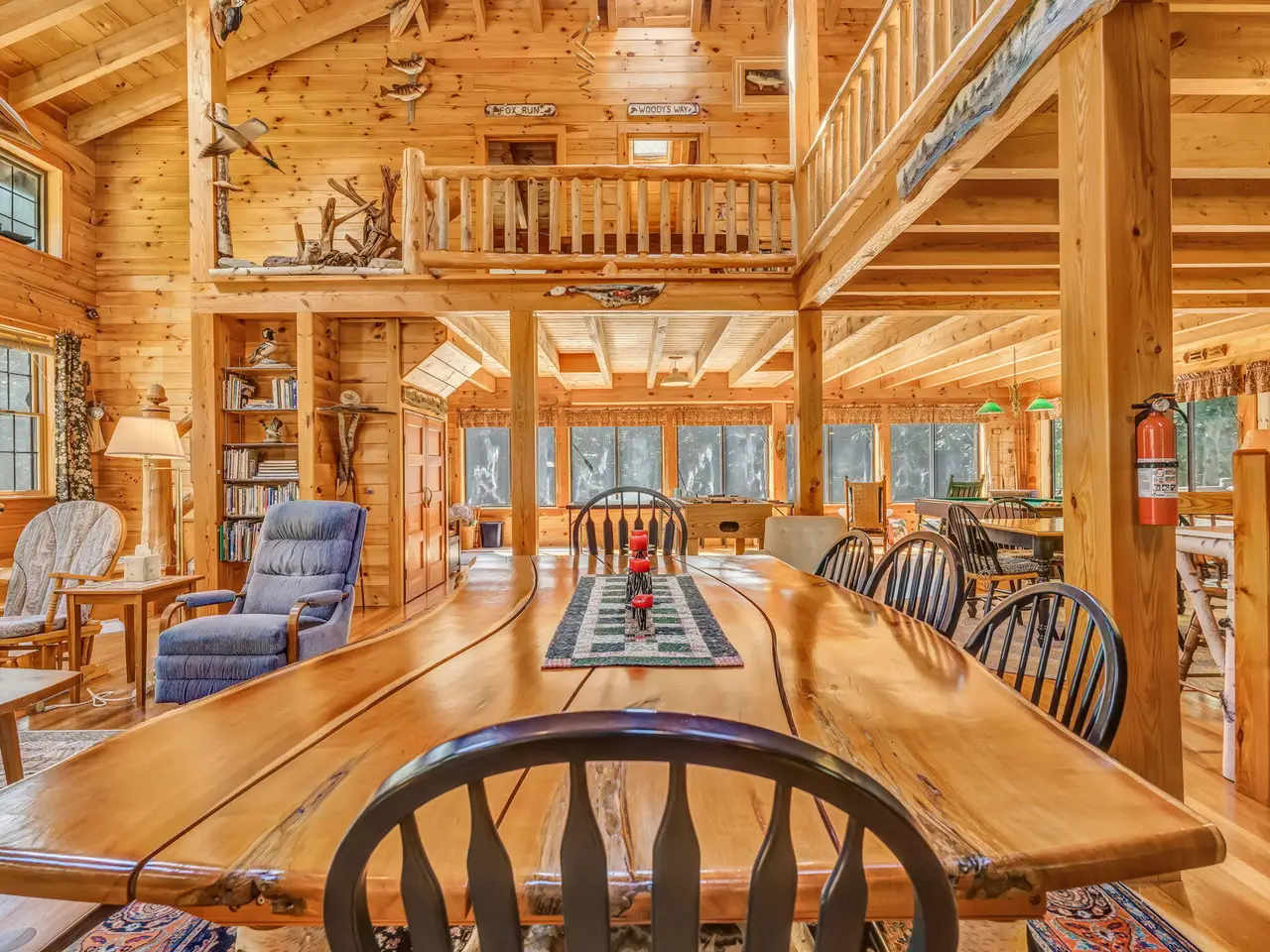 LOVEJOY POND Magnificent custom built Maine lodge architecturally designed to provide that classic, rustic feel with all the modern day amenities & system! Originally the Menatoma Camp ''Lodge'' sadly destroyed in a fire, this 2001 structure was built to encompass everything it means to be in nature at the lake with loved ones! The central living room is a wonderful place to gather around the gorgeous natural stone fireplace that reaches to a lofty ceiling with grand staircases on each side. Open game room & two dedicated dining areas adjacent to a fully equipped kitchen is ideal for entertaining large groups. Office/den & laundry room with half bath complete the main level, while 4 spacious bedrooms, two full baths, 2 walk-in linen closets & a nice sitting area complete the second level. Outside is a covered porch, 2 open decks & a wonderful screen porch allowing you to enjoy the outdoors while listening to the loons. The property is made up of 2 separate lots with 400' of beautiful lakefront with a gently sloping, pebble bottom swim area & private dock which can be accessed by a park-like walking path through the woods, or your own private road. While surrounded by woodlands on 3.74 acres, the rest of the association's amenities next door can easily be accessed by footpath or road. Dues include access to over 36 acres, 770' of shared lakefront with a sandy beach, protected swimming area with float, 2 large permanent docks, swim float & diving platform, Dining Hall, Laundry Building, Craft Shop, Tennis/Basketball/Pickleball Courts, Baseball Field, dumpster, grounds & tree service. Lovejoy is a beautiful lake with no public boat ramp, no invasive aquatic plants & excellent sport fishing with breeding pairs of loons that raise chicks on the lake each year! Lodge is fully insulated, has an 18 panel solar array supporting all needs, private septic system & access high speed internet if desired. Welcome to a comfortable, easy life at the lake with room for all!