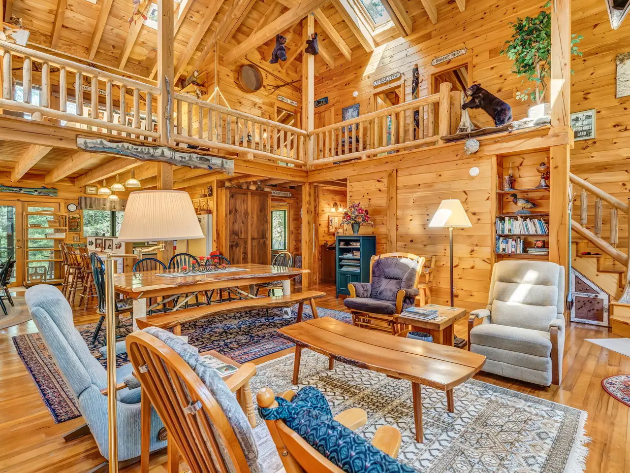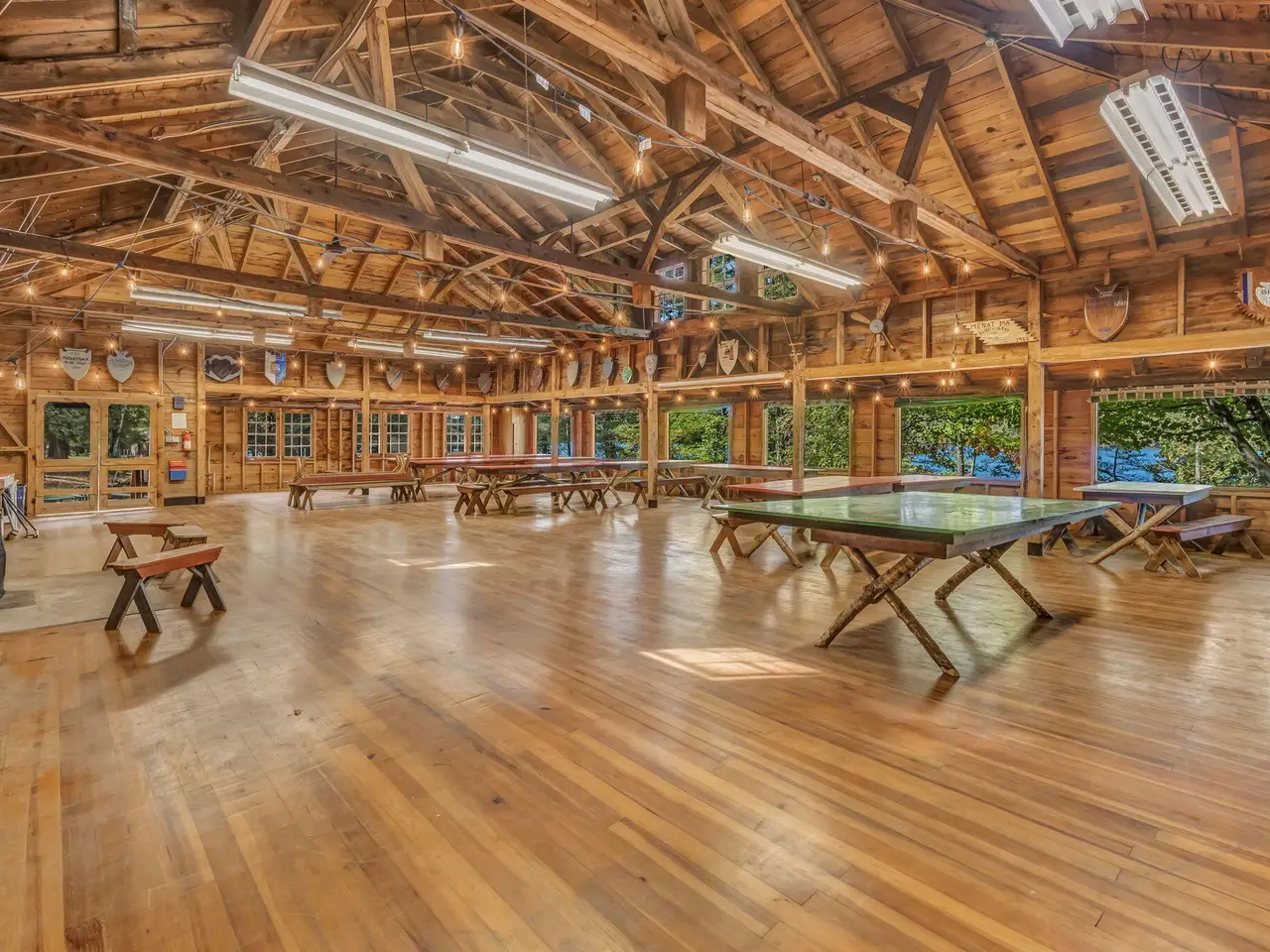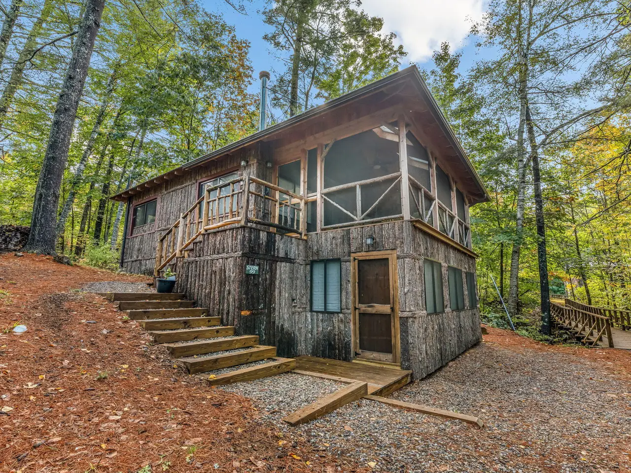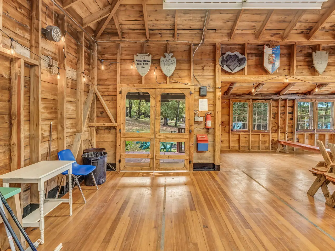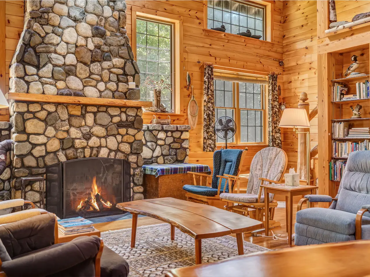 LOVEJOY POND Magnificent custom built Maine lodge architecturally designed to provide that classic, rustic feel with all the modern day amenities & system! Originally the Menatoma Camp ''Lodge'' sadly destroyed in a fire, this 2001 structure was built to encompass everything it means to be in nature at the lake with loved ones! The central living room is a wonderful place to gather around the gorgeous natural stone fireplace that reaches to a lofty ceiling with grand staircases on each side. Open game room & two dedicated dining areas adjacent to a fully equipped kitchen is ideal for entertaining large groups. Office/den & laundry room with half bath complete the main level, while 4 spacious bedrooms, two full baths, 2 walk-in linen closets & a nice sitting area complete the second level. Outside is a covered porch, 2 open decks & a wonderful screen porch allowing you to enjoy the outdoors while listening to the loons. The property is made up of 2 separate lots with 400' of beautiful lakefront with a gently sloping, pebble bottom swim area & private dock which can be accessed by a park-like walking path through the woods, or your own private road. While surrounded by woodlands on 3.74 acres, the rest of the association's amenities next door can easily be accessed by footpath or road. Dues include access to over 36 acres, 770' of shared lakefront with a sandy beach, protected swimming area with float, 2 large permanent docks, swim float & diving platform, Dining Hall, Laundry Building, Craft Shop, Tennis/Basketball/Pickleball Courts, Baseball Field, dumpster, grounds & tree service. Lovejoy is a beautiful lake with no public boat ramp, no invasive aquatic plants & excellent sport fishing with breeding pairs of loons that raise chicks on the lake each year! Lodge is fully insulated, has an 18 panel solar array supporting all needs, private septic system & access high speed internet if desired. Welcome to a comfortable, easy life at the lake with room for all!