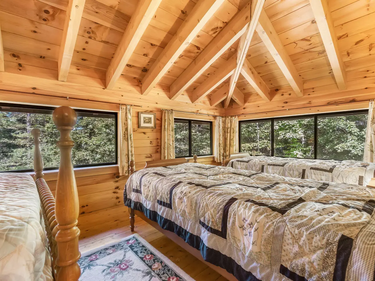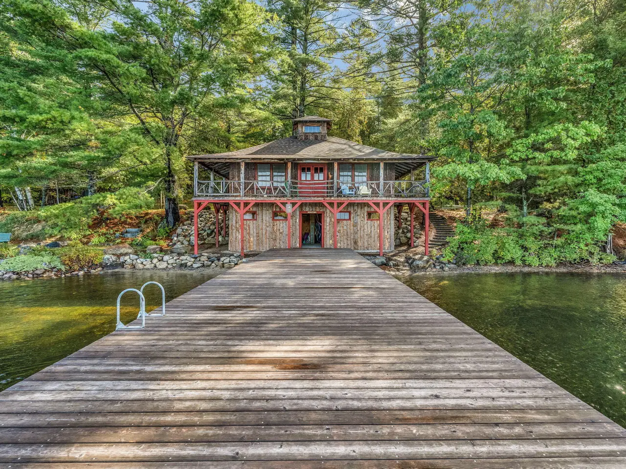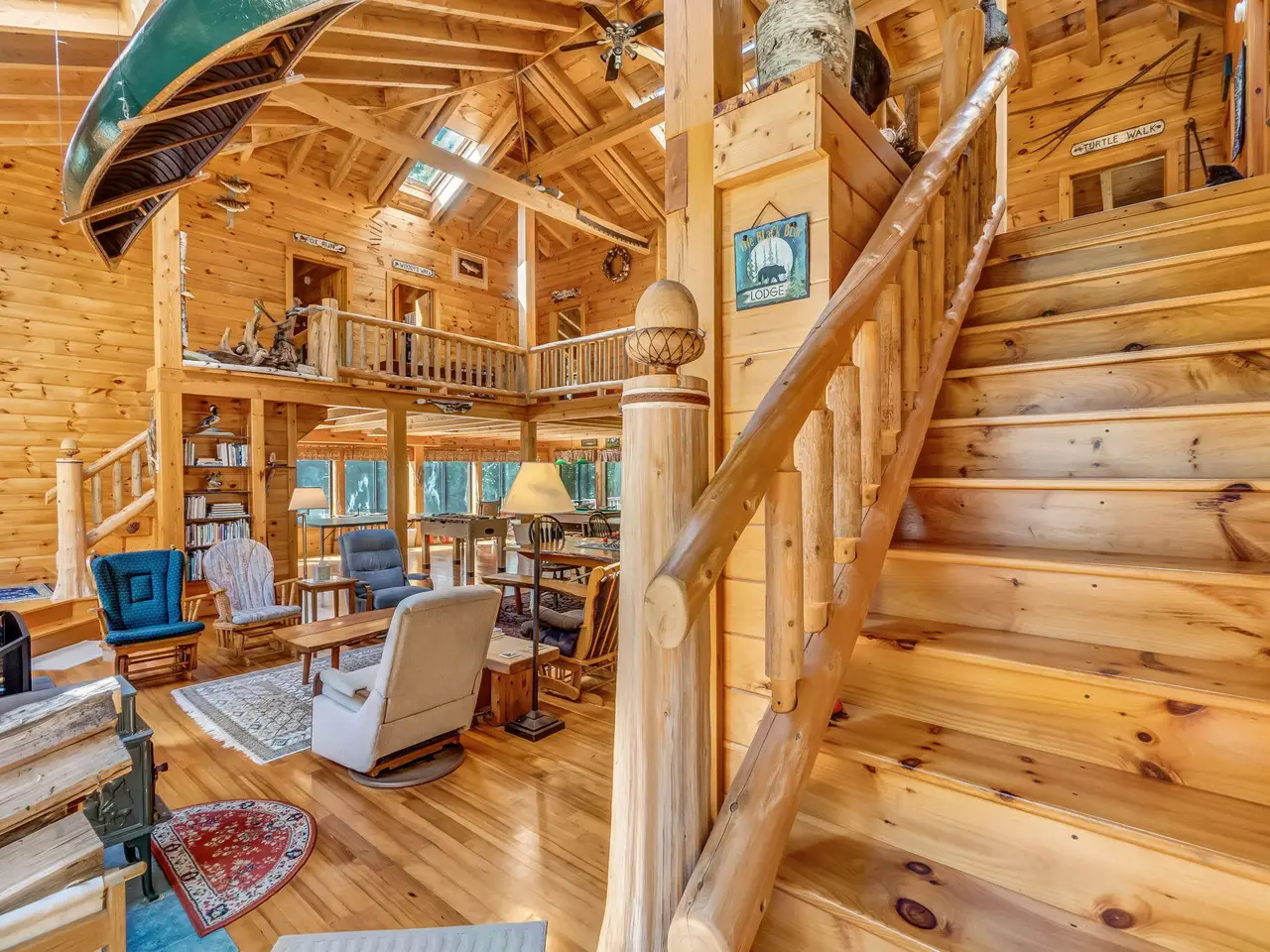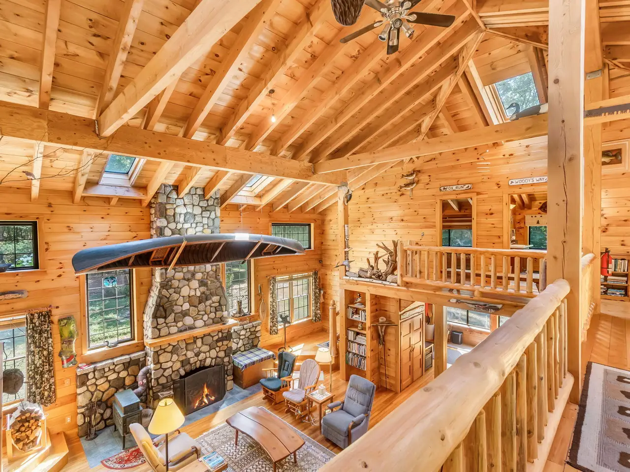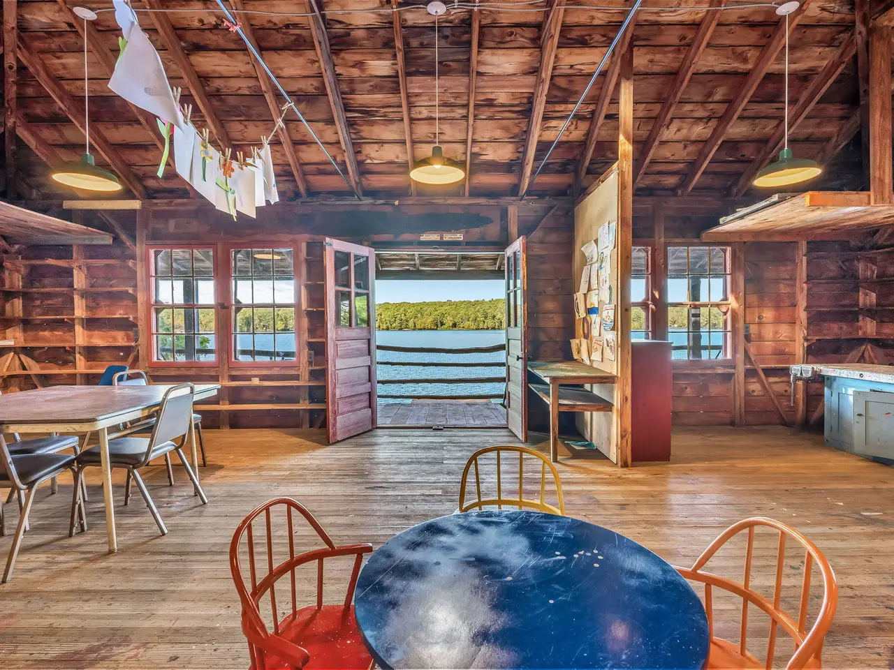 LOVEJOY POND Magnificent custom built Maine lodge architecturally designed to provide that classic, rustic feel with all the modern day amenities & system! Originally the Menatoma Camp ''Lodge'' sadly destroyed in a fire, this 2001 structure was built to encompass everything it means to be in nature at the lake with loved ones! The central living room is a wonderful place to gather around the gorgeous natural stone fireplace that reaches to a lofty ceiling with grand staircases on each side. Open game room & two dedicated dining areas adjacent to a fully equipped kitchen is ideal for entertaining large groups. Office/den & laundry room with half bath complete the main level, while 4 spacious bedrooms, two full baths, 2 walk-in linen closets & a nice sitting area complete the second level. Outside is a covered porch, 2 open decks & a wonderful screen porch allowing you to enjoy the outdoors while listening to the loons. The property is made up of 2 separate lots with 400' of beautiful lakefront with a gently sloping, pebble bottom swim area & private dock which can be accessed by a park-like walking path through the woods, or your own private road. While surrounded by woodlands on 3.74 acres, the rest of the association's amenities next door can easily be accessed by footpath or road. Dues include access to over 36 acres, 770' of shared lakefront with a sandy beach, protected swimming area with float, 2 large permanent docks, swim float & diving platform, Dining Hall, Laundry Building, Craft Shop, Tennis/Basketball/Pickleball Courts, Baseball Field, dumpster, grounds & tree service. Lovejoy is a beautiful lake with no public boat ramp, no invasive aquatic plants & excellent sport fishing with breeding pairs of loons that raise chicks on the lake each year! Lodge is fully insulated, has an 18 panel solar array supporting all needs, private septic system & access high speed internet if desired. Welcome to a comfortable, easy life at the lake with room for all!