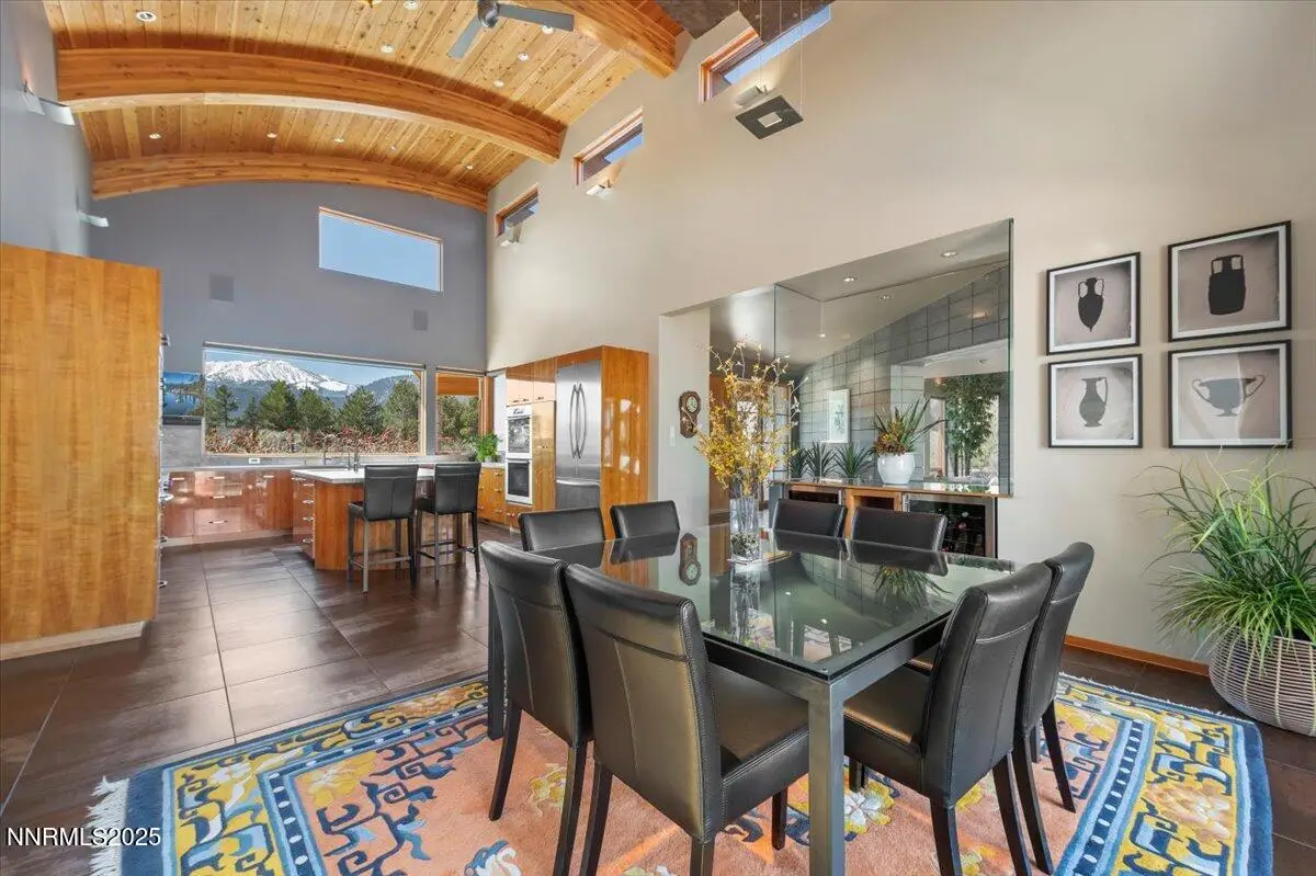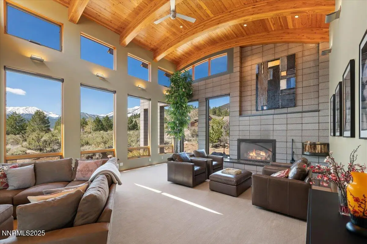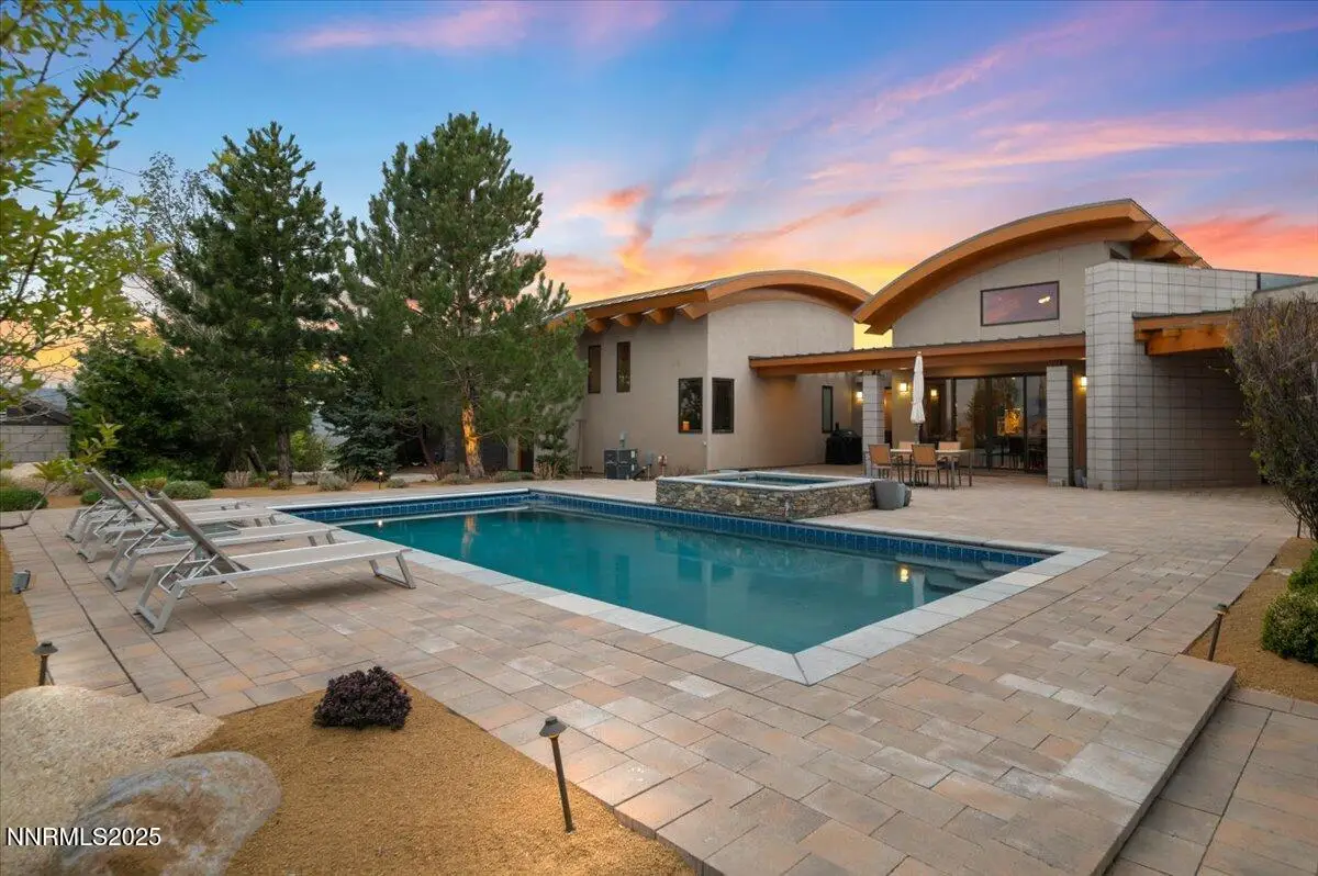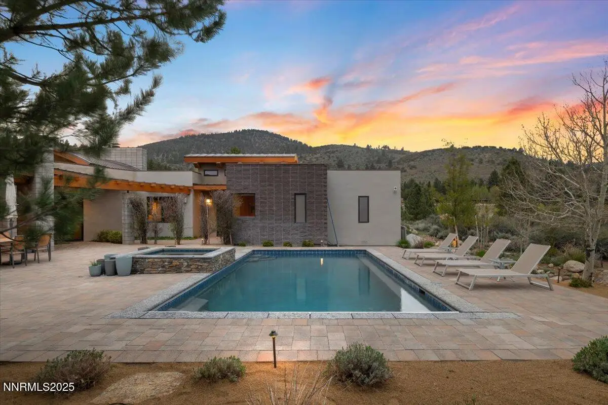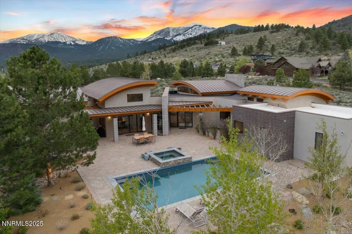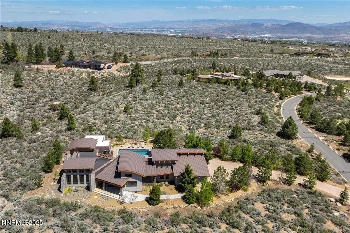 An Architectural Masterpiece in Legend Trails. An architectural phenomenon in design and craftsmanship, this stunning residence is unlike anything else in the area. Thoughtfully sited on over two acres within the gated Legend Trails community, the home offers serenity, privacy, and awe-inspiring mountain views from every room—all just minutes from Mt. Rose Ski Area, Lake Tahoe, and Reno-Tahoe International Airport. Designed to harmonize with the land, the residence blends modern clean lines with natural elements of wood and stone. Inside, radius-curved Douglas Fir ceilings with exposed beams and tongue-and-groove planks soar above expansive living spaces, framed by large rectangular windows that capture panoramic vistas of the Sierras and Virginia Range. Quarter-sawn cherry Heritage cabinetry, and a suite of Miele, Wolf, & Thermador appliances—including a built-in Thermador coffee system and warming drawer—make the kitchen a chef's dream. Recent upgrades include new counters and plumbing fixtures (in the Kitchen and Primary), automatic blinds, customized lighting, and refreshed finishes throughout. The home features two luxurious bedroom suites—a serene primary suite with fireplace, oversized walk-in closet, curved ceiling, and spa-inspired bath with steam shower and jetted tub, along with a spacious secondary suite perfect for family or guests. There is also a flex space loft, with access via a spiral staircase in the secondary Bedroom. A large bonus room offers flexibility as an office, gym, or media space. Outdoors, the property is equally remarkable. The backyard is a private retreat designed for relaxation and entertaining, featuring a sparkling pool, soothing spa, expansive patios, and unobstructed views. Backing to open space, the home enjoys unmatched privacy and a seamless connection to the natural landscape. With nearly two acres of sunny outdoor living and inspired design throughout, 6615 Legend Vista delivers an extraordinary lifestyle in one of Reno's most coveted locations.