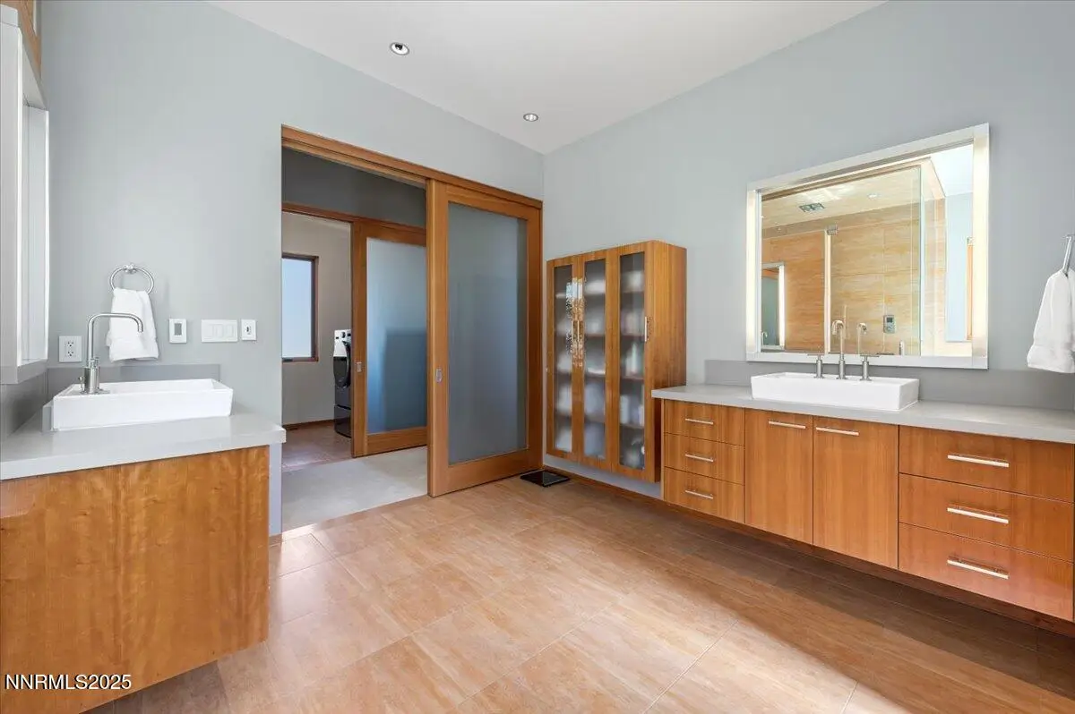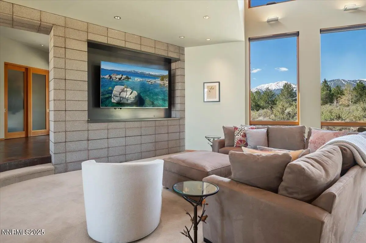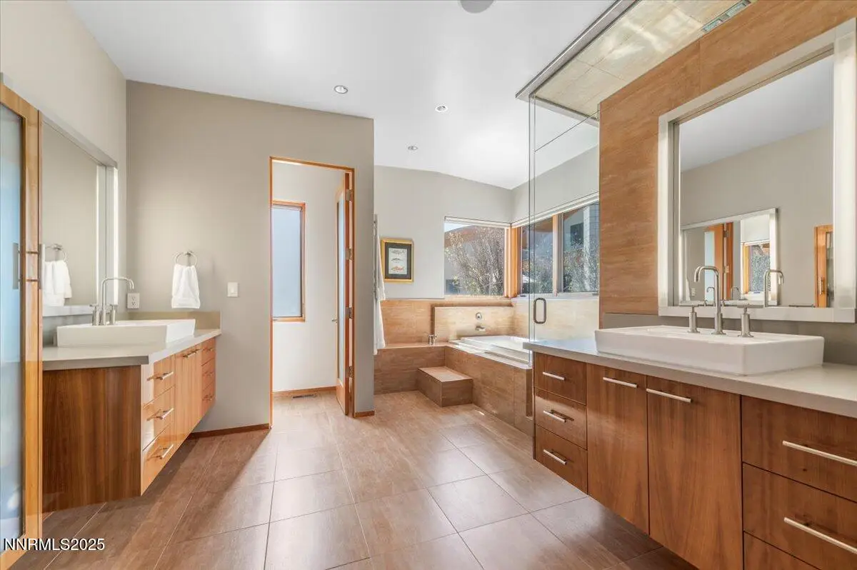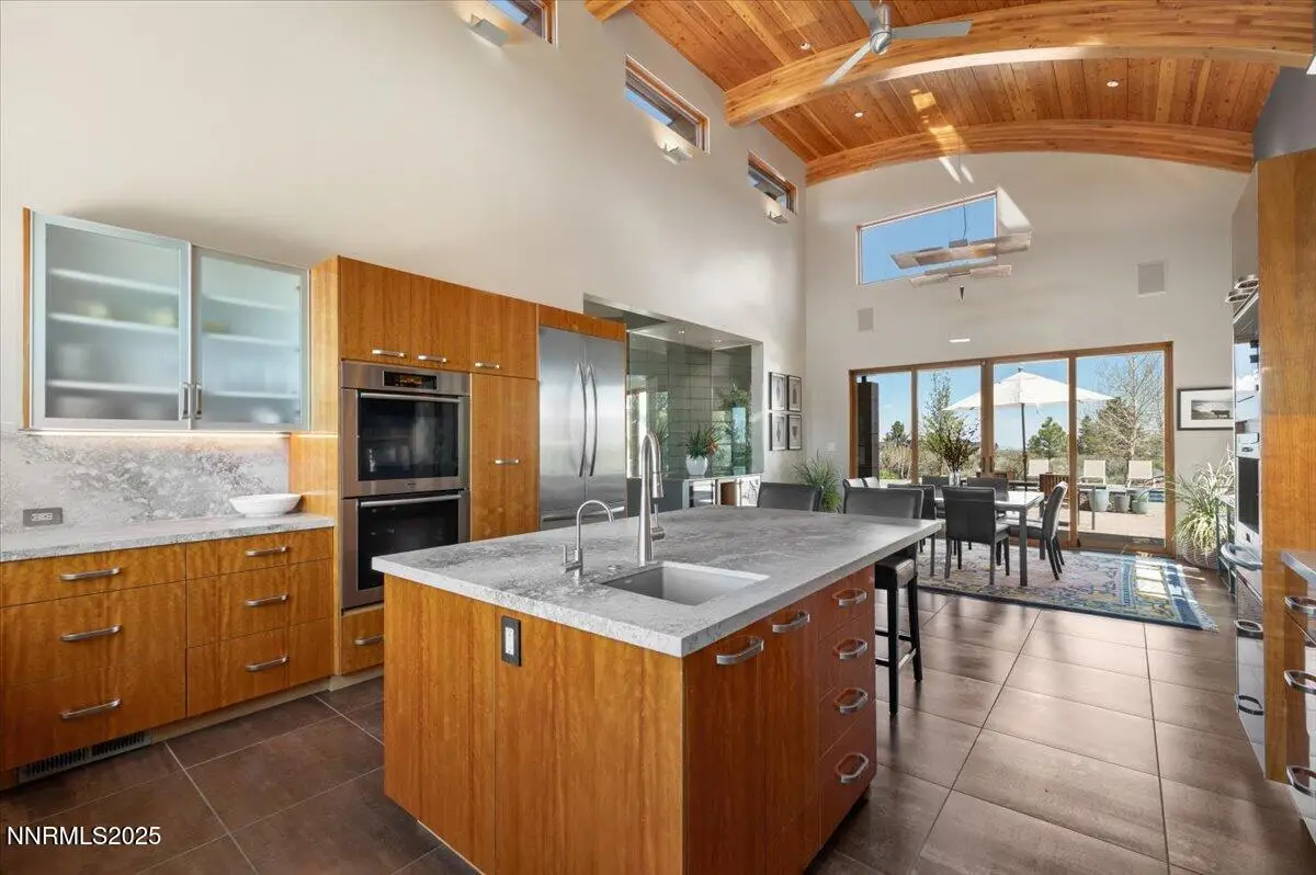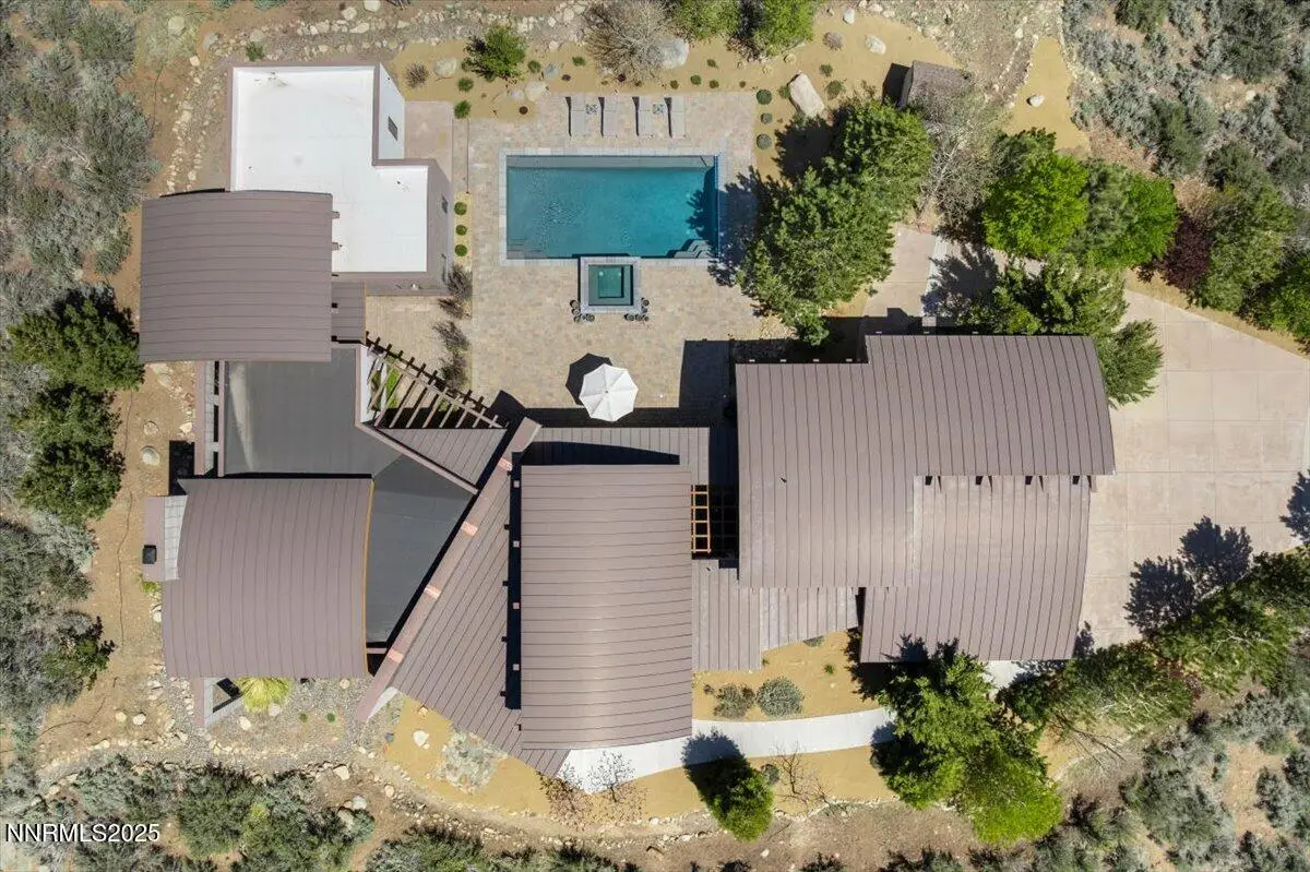 An Architectural Masterpiece in Legend Trails. An architectural phenomenon in design and craftsmanship, this stunning residence is unlike anything else in the area. Thoughtfully sited on over two acres within the gated Legend Trails community, the home offers serenity, privacy, and awe-inspiring mountain views from every room—all just minutes from Mt. Rose Ski Area, Lake Tahoe, and Reno-Tahoe International Airport. Designed to harmonize with the land, the residence blends modern clean lines with natural elements of wood and stone. Inside, radius-curved Douglas Fir ceilings with exposed beams and tongue-and-groove planks soar above expansive living spaces, framed by large rectangular windows that capture panoramic vistas of the Sierras and Virginia Range. Quarter-sawn cherry Heritage cabinetry, and a suite of Miele, Wolf, & Thermador appliances—including a built-in Thermador coffee system and warming drawer—make the kitchen a chef's dream. Recent upgrades include new counters and plumbing fixtures (in the Kitchen and Primary), automatic blinds, customized lighting, and refreshed finishes throughout. The home features two luxurious bedroom suites—a serene primary suite with fireplace, oversized walk-in closet, curved ceiling, and spa-inspired bath with steam shower and jetted tub, along with a spacious secondary suite perfect for family or guests. There is also a flex space loft, with access via a spiral staircase in the secondary Bedroom. A large bonus room offers flexibility as an office, gym, or media space. Outdoors, the property is equally remarkable. The backyard is a private retreat designed for relaxation and entertaining, featuring a sparkling pool, soothing spa, expansive patios, and unobstructed views. Backing to open space, the home enjoys unmatched privacy and a seamless connection to the natural landscape. With nearly two acres of sunny outdoor living and inspired design throughout, 6615 Legend Vista delivers an extraordinary lifestyle in one of Reno's most coveted locations.