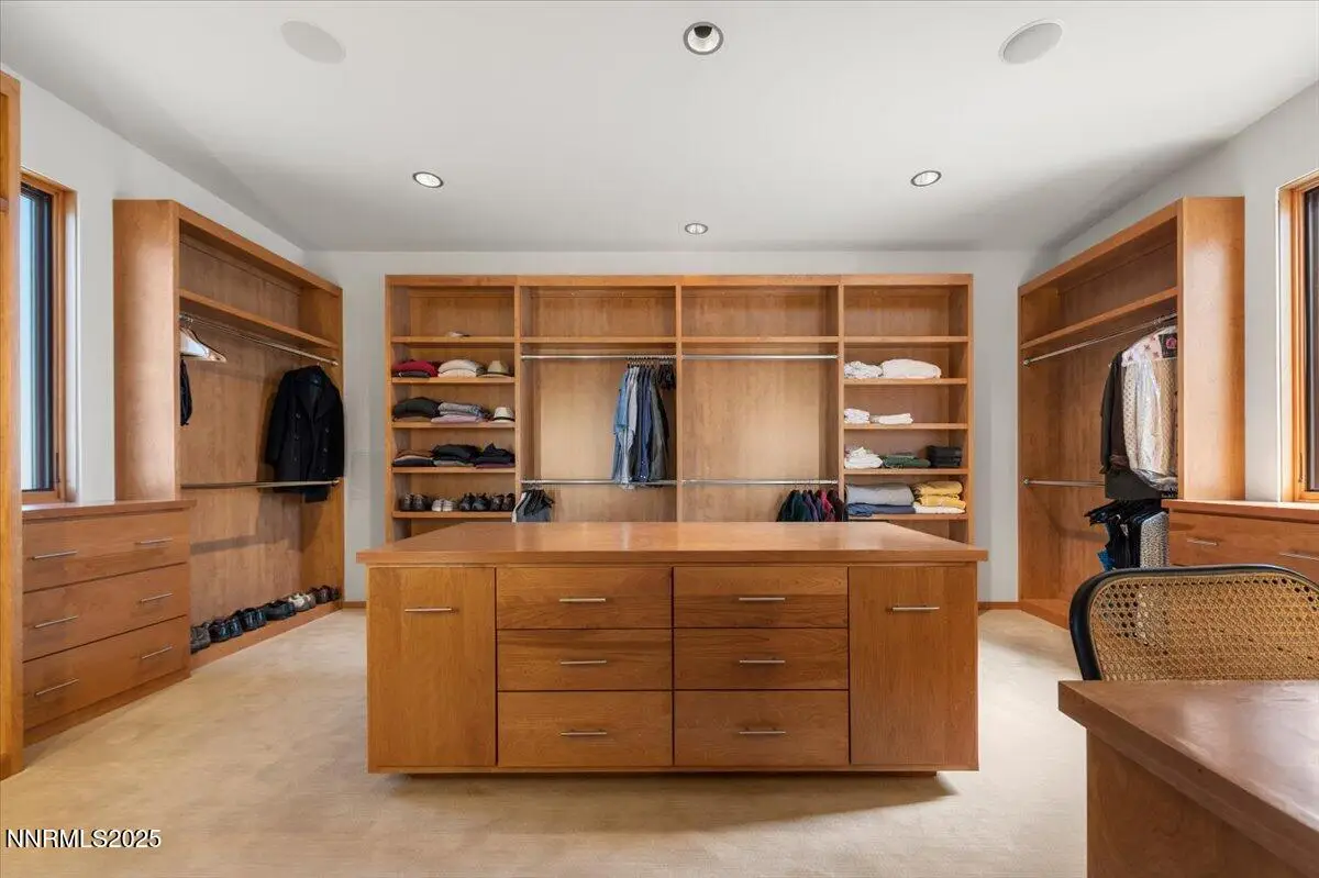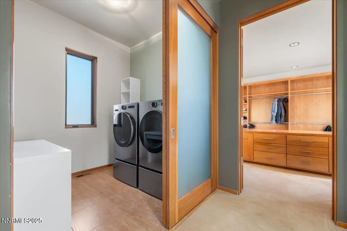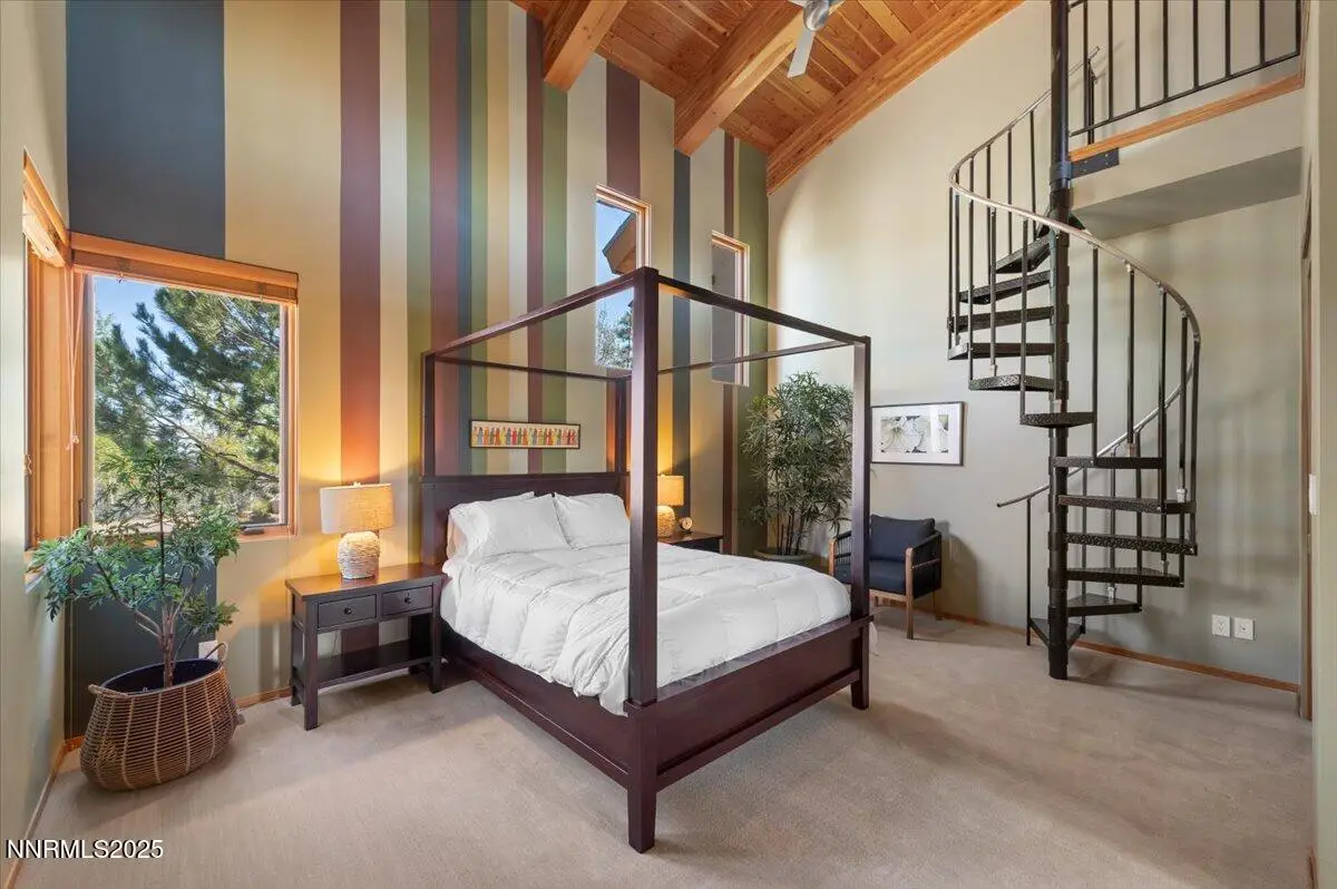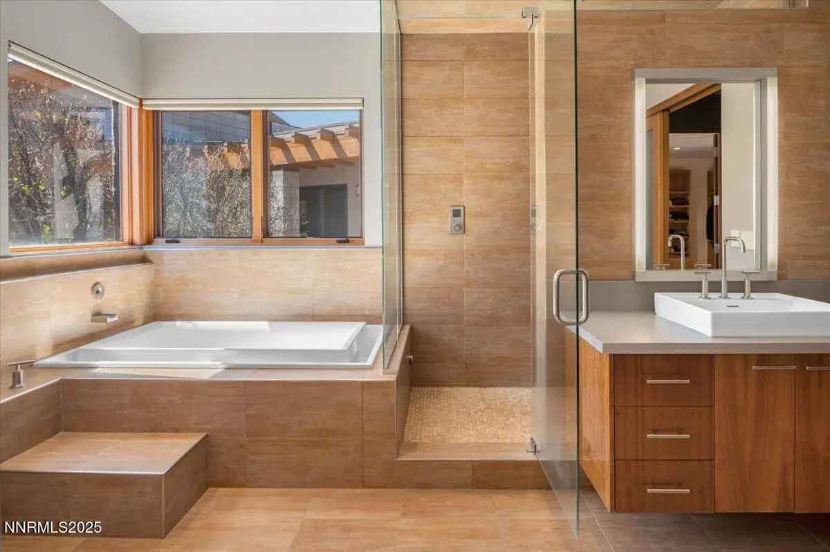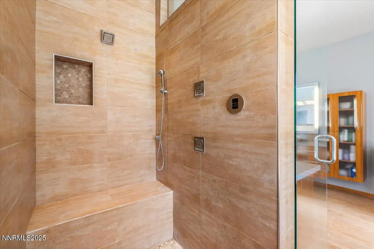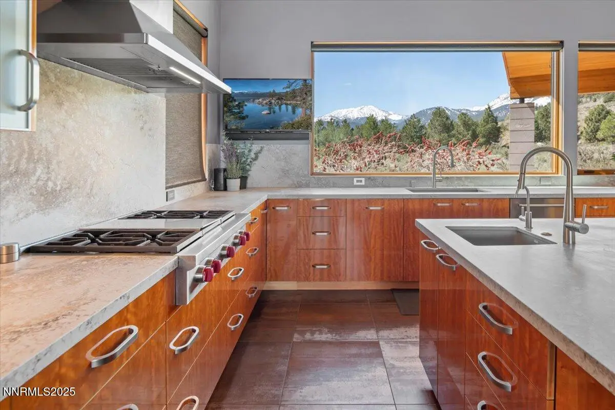 An Architectural Masterpiece in Legend Trails. An architectural phenomenon in design and craftsmanship, this stunning residence is unlike anything else in the area. Thoughtfully sited on over two acres within the gated Legend Trails community, the home offers serenity, privacy, and awe-inspiring mountain views from every room—all just minutes from Mt. Rose Ski Area, Lake Tahoe, and Reno-Tahoe International Airport. Designed to harmonize with the land, the residence blends modern clean lines with natural elements of wood and stone. Inside, radius-curved Douglas Fir ceilings with exposed beams and tongue-and-groove planks soar above expansive living spaces, framed by large rectangular windows that capture panoramic vistas of the Sierras and Virginia Range. Quarter-sawn cherry Heritage cabinetry, and a suite of Miele, Wolf, & Thermador appliances—including a built-in Thermador coffee system and warming drawer—make the kitchen a chef's dream. Recent upgrades include new counters and plumbing fixtures (in the Kitchen and Primary), automatic blinds, customized lighting, and refreshed finishes throughout. The home features two luxurious bedroom suites—a serene primary suite with fireplace, oversized walk-in closet, curved ceiling, and spa-inspired bath with steam shower and jetted tub, along with a spacious secondary suite perfect for family or guests. There is also a flex space loft, with access via a spiral staircase in the secondary Bedroom. A large bonus room offers flexibility as an office, gym, or media space. Outdoors, the property is equally remarkable. The backyard is a private retreat designed for relaxation and entertaining, featuring a sparkling pool, soothing spa, expansive patios, and unobstructed views. Backing to open space, the home enjoys unmatched privacy and a seamless connection to the natural landscape. With nearly two acres of sunny outdoor living and inspired design throughout, 6615 Legend Vista delivers an extraordinary lifestyle in one of Reno's most coveted locations.