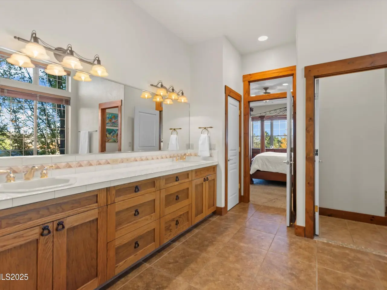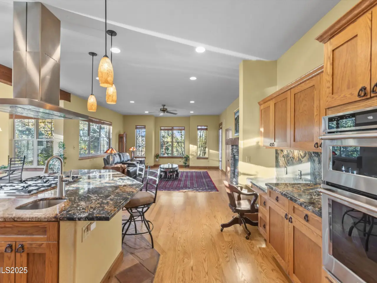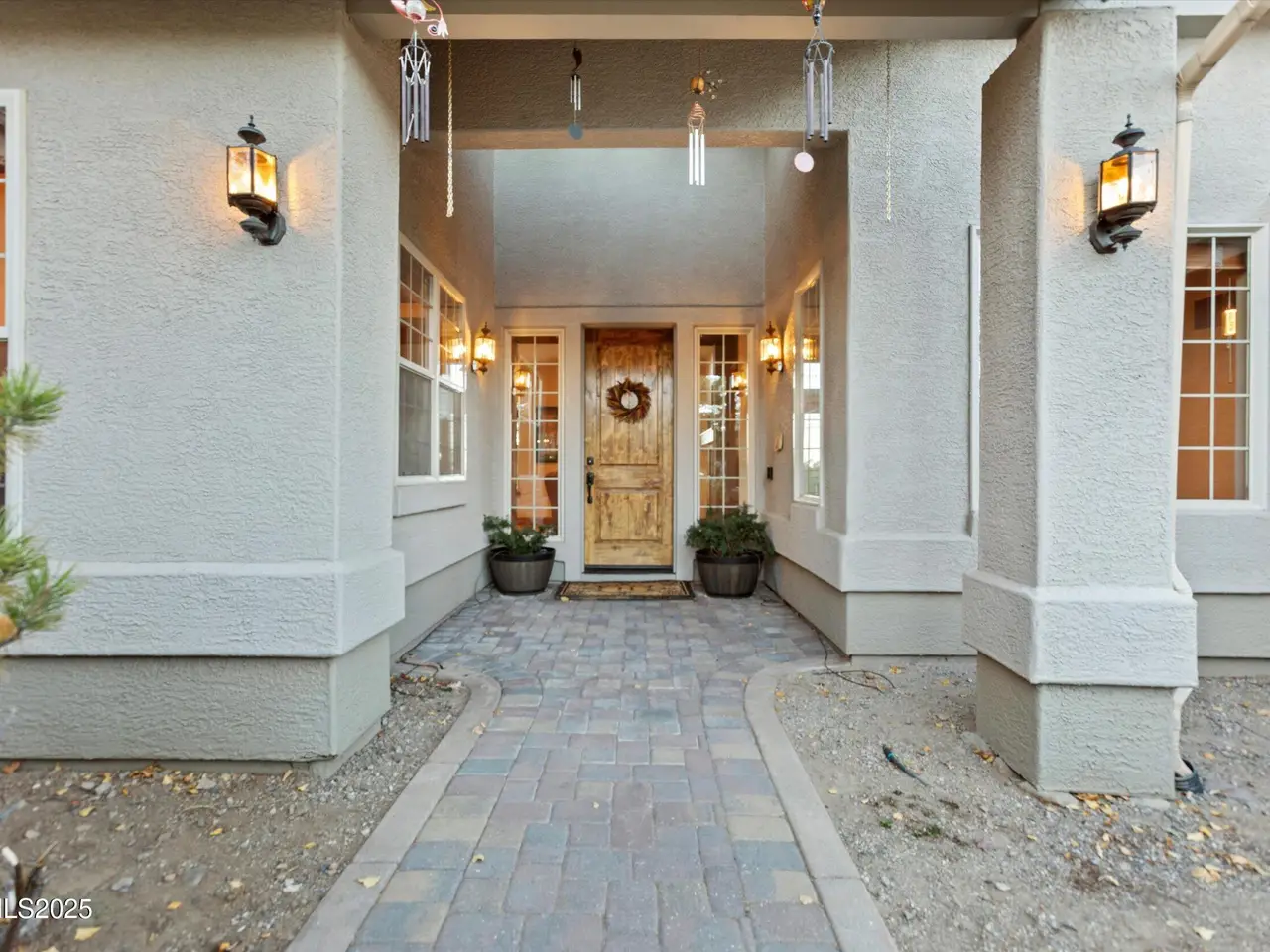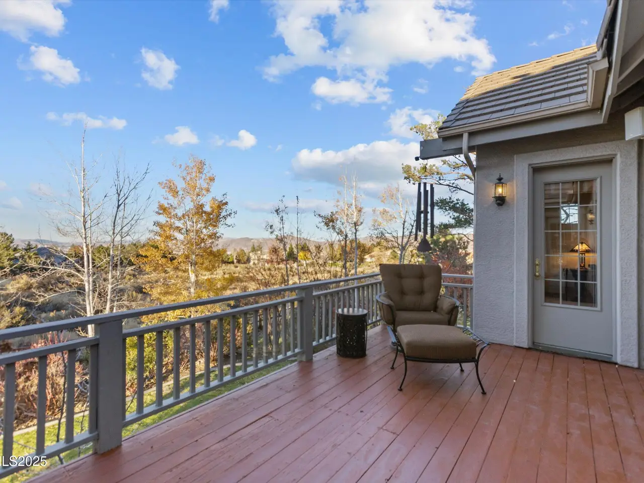 Private cul-de-sac living in Saddlehorn with wide views of Mt. Rose, the Sierra, and the Reno skyline. This custom home blends timeless architecture with a peaceful, elevated setting. Historic reclaimed wood beams from old railroad tunnels deliver distinctive Nevada character. Main-level living features formal living and dining rooms, a welcoming family room, and a well-appointed kitchen with custom cabinetry and excellent storage. The primary suite is also on this level for comfort and ease. Downstairs, two additional bedrooms and a large bonus/media room open to outdoor living areas surrounded by mature landscaping and natural scenery. Saddlehorn parkland borders the property on two sides, providing added privacy, improved sun exposure, and enhanced views. A rare 4-car garage offers outstanding space for vehicles and gear. Residents enjoy walking trails, parks, and community recreation close by, with Galena hiking and shopping minutes away. Mt. Rose Ski Area is just 11 miles up the road. A quiet, scenic location paired with respected custom design. Strong architecture. Everyday convenience. Ready for what's next.