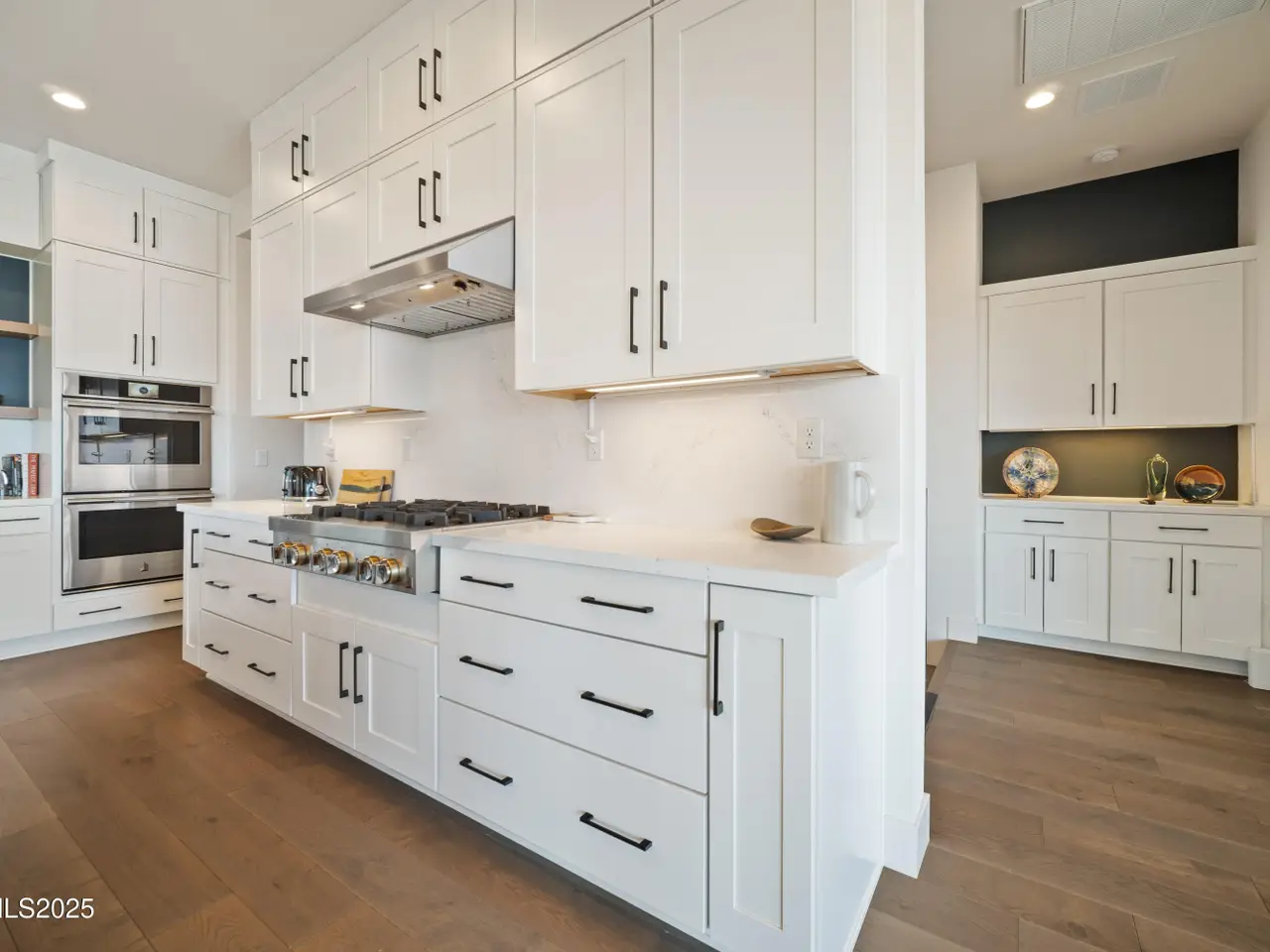Stunning Modern Home in The Cliffs at Somersett. Discover luxury living in this exquisite 5-bedroom, 5.5-bathroom home located in the prestigious Cliffs community of Somersett. Perched on a premium 180-degree view lot, this meticulously designed residence boasts breathtaking mountain views, sophisticated architecture, and high-end finishes throughout. Enter through a private front courtyard into a spacious open floor plan highlighted by floor-to-ceiling picture windows, hand-troweled walls, and a striking rolled steel fireplace with I-beam detail. The custom glass and metal staircase sets a contemporary tone, while 7" white oak plank flooring adds warmth and elegance. The entertainer's kitchen is a showstopper, featuring a massive 9-foot quartz island, Sub-Zero refrigerator, JennAir appliances, double ovens, a walk-in pantry, and soft-close dovetail cabinetry. Designer light fixtures, black matte hardware, and Italian porcelain surfaces complete the sophisticated design. The walk-out basement includes a second fireplace with Italian tile surround, covered patio, and an in-ground hot tub overlooking stunning mountain vistas. Upstairs, enjoy seamless indoor-outdoor living with a multi-panel corner sliding door leading to a large deck—perfect for entertaining. The luxurious primary suite offers a cozy fireplace, spa-like walk-in shower, double vanities, and a spacious walk-in closet. Additional highlights include dual-zone HVAC with two furnaces and water heaters, smart home security, insulated interior walls for soundproofing, never-freeze roof de-icing system, TV/data smurf tubes, a pure water softener, and professionally designed WaterSense landscaping. With a 3-car garage, large laundry/mud room, and exceptional craftsmanship throughout, this home offers comfort, style, and functionality in one of Reno's most sought-after communities.