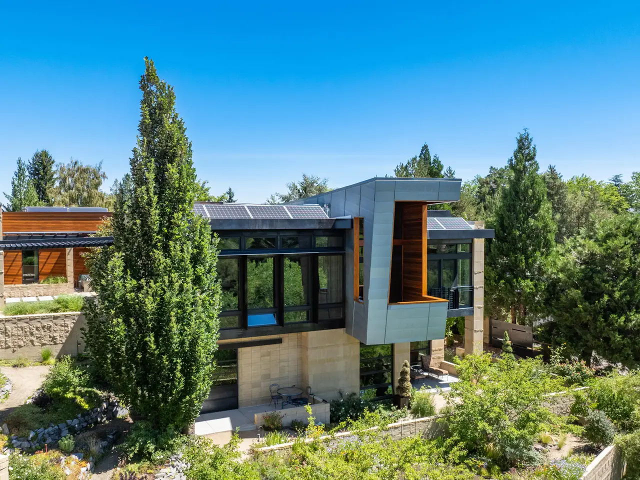 This architecturally significant home, constructed with concrete, metal, and wood siding elements, harmonizes modern design with its natural surroundings. Its state-of-the-art systems include hydronic heating powered by solar energy and evaporative cooling, offering both comfort and sustainability. The seamless connection between indoor and outdoor spaces is a defining feature, with the courtyard and pool creating a tranquil retreat. Art lovers and architecture enthusiasts alike will appreciate the home's thoughtful design and integration with the environment. This remarkable home extends its artistry into the landscape with extensive, curated gardens featuring custom metal fencing, sculptures, and a serene lily pond. A dedicated gardening room makes maintaining this outdoor sanctuary a pleasure. Additional features include a mudroom, outdoor shower, and a gym for an active lifestyle. Inside, cutting-edge technology enhances daily living, with high-tech LED lighting perfect for art displays, automated shades, and a full house automation system controlling audio, visual, and security systems seamlessly.