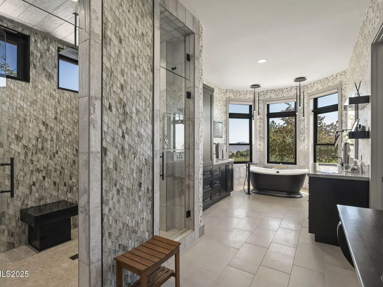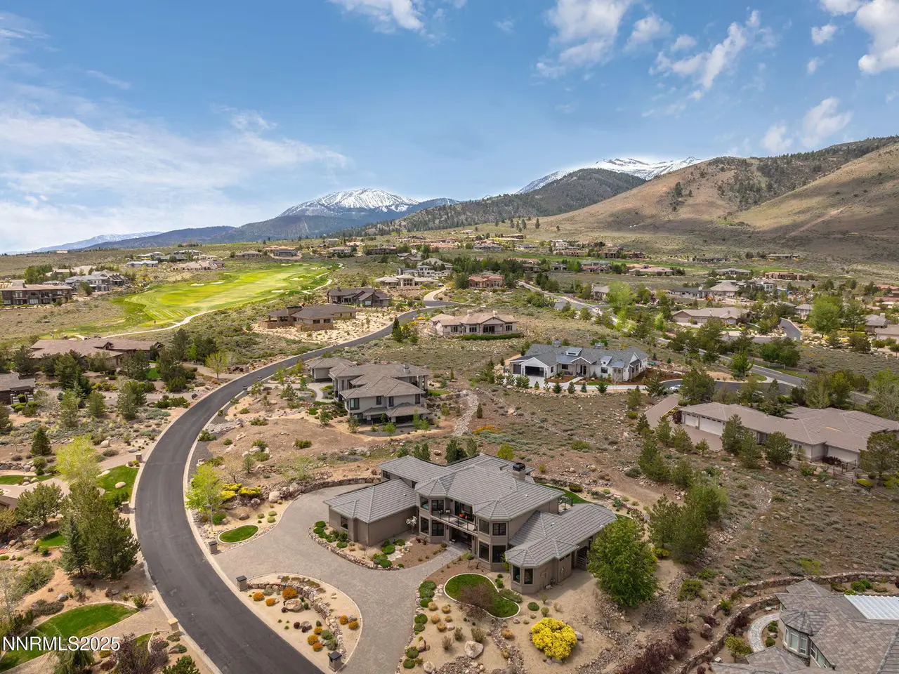 Step into 6177 North Featherstone, a residence reimagined from the ground up to embody the sophistication of design and the effortless grace of High Desert living. Nestled within the prestigious ArrowCreek community, this fully remodeled estate offers 5,586 square feet of inspired living on a full acre. With sweeping views across the Sierra Nevada and Mt. Rose mountains, lush golf fairways, and sparkling city lights, every angle of this home tells a story of elegance and connection to its surroundings. The owners began their remodel with purpose: to create a seamless flow, where form meets function and every detail enhances life, leisure, and entertaining. Walls were softened, pillars removed, and spaces reimagined to capture natural light and open sightlines. Modern finishes and thoughtful design balance grandeur with comfort. A finished basement and upstairs library added 312 square feet, expanding versatility without sacrificing intimacy. Arrival makes an unforgettable impression with a custom 9x6 steel pivot door by Modern Steel Doors of Arizona. Inside, a light-filled foyer leads to an expanded balcony, where sweeping golf course and city views set the stage for sunrise coffee or starlit evenings. At the heart of the home, the Dining Room has been elevated into a dramatic entertaining space with soaring two-story ceilings and a two-sided fireplace connecting indoors and outdoors. Andersen sliding doors open to patios and gardens, while striking Sonneman fixtures and art lighting create ambiance. Whether hosting holidays or intimate dinners, the space adapts with ease. The Main En Suite is a private retreat, complete with custom California Closets, cove lighting, and remote-controlled Hunter Douglas shades. The spa-inspired bath showcases a freestanding soaking tub beneath chandeliers, a dual-entry steam shower with rain head and sprayers, natural stone floors, shimmering glass tile, and custom cabinetry with quartz counters and lighted mirrors. The Great Room centers on a custom travertine fireplace with black quartz mantel, complemented by wood-grain tile floors, a Minka Aire fan, and integrated Sonos audio. The Kitchen and Nook feature a Wolf 48" range, Sub-Zero refrigerator, and a central island with seating. The Games Room delights with Hubbardton Forge lighting, speakers, and motorized shades. A dramatic staircase of black-stained oak and iron railings rises beneath a cascading Sonneman chandelier. Upstairs, the new Library offers custom bookcases, club seating, and a 12-foot Andersen glass wall opening to a balcony with panoramic views. Four additional en suite bedrooms provide privacy, storage, and character. Outdoors, multiple patios, a two-sided fireplace, and landscaped grounds enhanced with solar lighting create serene gathering spaces. Modern systems include central HVAC with three units, radiant heated floors, Tesla solar panels, Cat-6 wiring, Sonos audio, and a four-car garage with EV charger. This estate is more than a home—it is a lifestyle. From morning coffee on the balcony to wine in the library at dusk, from quiet family nights to grand celebrations, this residence harmonizes elegance, comfort, and versatility. Every space has been thoughtfully crafted, every view a reminder of Reno's beauty. This is a rare opportunity to own a fully realized vision of home, where luxury and ease coexist seamlessly.