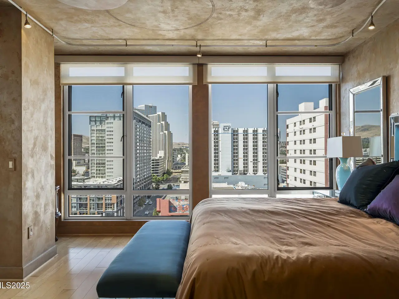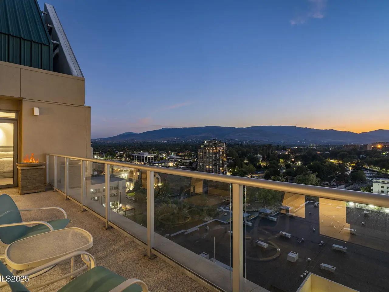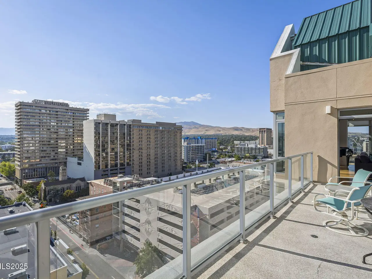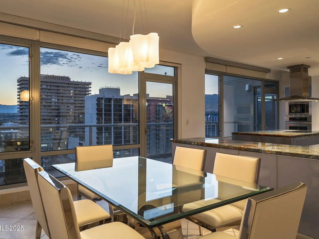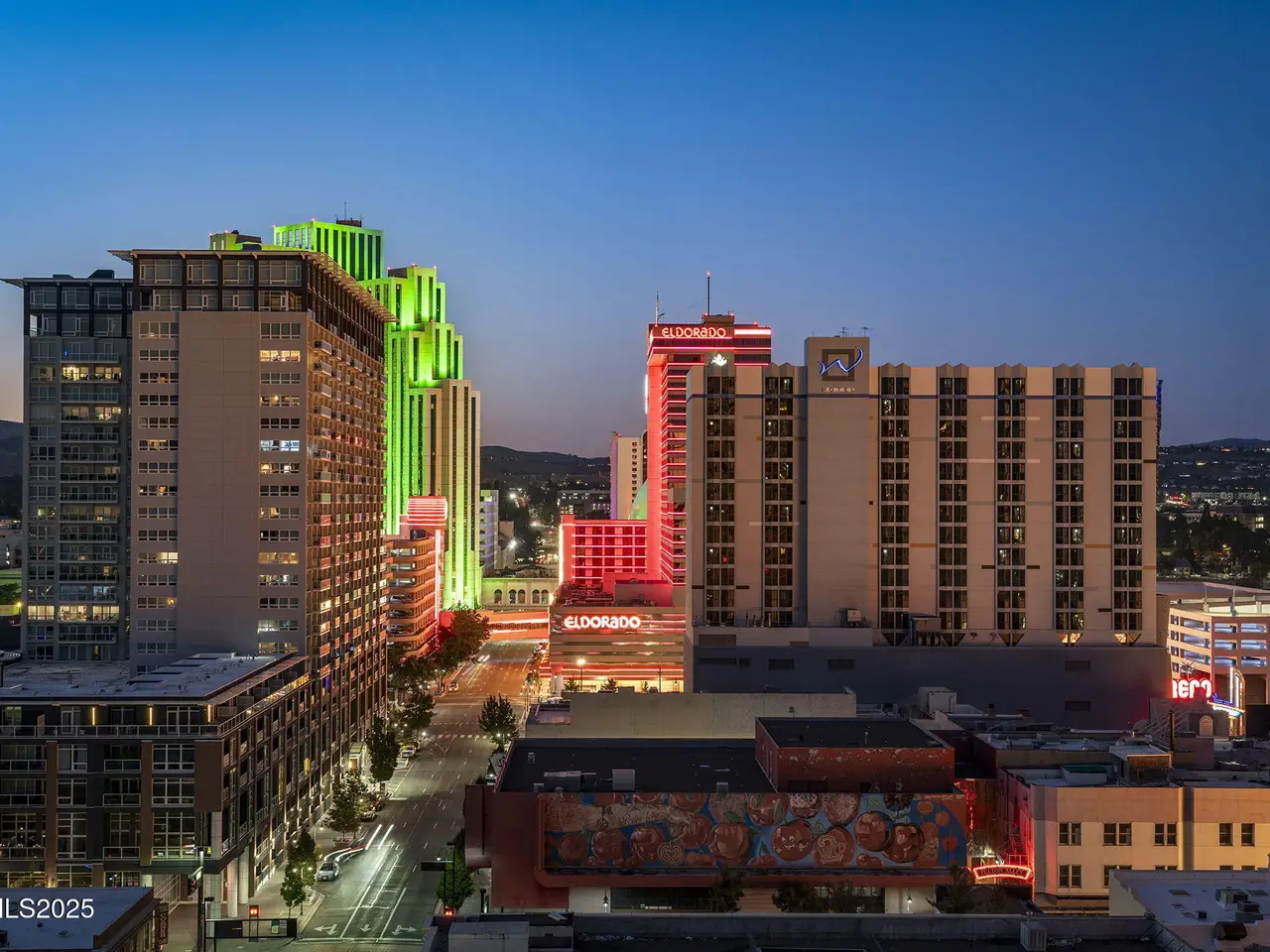 Where space meets sky: this penthouse at The Palladio offers a rare combination of size, privacy, and views seldom seen in downtown Reno. Available for the first time in nearly 20 years and one of only four penthouses in the building, this 3,066 sq ft residence blends genuine single-family scale with the convenience of lock-and-leave living. The great room at 50 N Sierra St PH13 sets the tone with maple floors, custom wood details, and a fireplace wrapped in striking Blue Louise granite—both a stunning feature and a cozy hearth. Walls of glass reach full height, bringing the horizon indoors and turning sunrises, sunsets, and city lights into part of everyday life. Two terraces extend the living space skyward, showcasing a sweeping panorama from Sierra peaks to the Truckee River and the glowing city lights. The dining room flows seamlessly from this central gathering area. Framed by windows and opening onto the terrace, it's spacious enough for long tables and celebrations, yet warm enough for daily meals. Bathed in natural light, the room invites gatherings to move easily between indoors and outdoors, with the city shimmering as a backdrop. The kitchen combines sleek design with professional-grade functionality. Italian Scavolini cabinets in a rare periwinkle hue pair with polished countertops and statement lighting. A Thermador induction cooktop, double ovens, a Miele dishwasher, and a vented hood deliver precision for the home chef. A walk-in pantry adds utility, while the oversized counter-height bar and bright breakfast nook support everything from quick mornings to dinner parties that linger. Beyond the kitchen, a dedicated wine and storage room highlights the home's exceptional livability. Here, a Sub-Zero dual-zone refrigerator holds 147 bottles, complemented by shelving and cabinetry, proving that penthouse living can offer the same capacity and practicality as a single-family home. Each ensuite bedroom is distinct. The primary suite combines comfort with elegance: heated marble floors, dual vanities, and a walk-in shower paired with a custom closet system. Wide windows frame the downtown skyline, anchoring the room in its urban setting. The secondary suite provides a peaceful retreat with a soaking tub, steam shower, dual vanities, and generous closet space. Expansive windows open to mountain views, filling the room with natural beauty. Beyond the main living areas, the home is designed for versatility and ease. A dedicated office offers built-in storage and abundant natural light, ideal for remote work or daily tasks. The laundry room features a side-by-side washer and dryer, deep cabinets, a utility sink—a practical space with thoughtful details. A powder bath with a vessel sink and rich finishes leaves a striking impression for guests. Throughout, motorized shades, integrated lighting controls, custom closets, and built-ins create a home that is both effortless and elegant. Life at The Palladio balances privacy with connectivity. With only 92 residences, the building was designed from the ground up as condominiums, featuring higher ceilings, true outdoor terraces, and thoughtful layouts. Residents enjoy secured entry with camera monitoring, two garage parking spaces accessible via fob, dedicated storage, and Reno's only infinity-edge pool suspended above the Truckee River. From this address, the best of the city is at your doorstep: Pioneer Center performances, river festivals, museums, Midtown dining, and café culture. Yet at home, quiet and privacy prevail. For buyers seeking a lock-and-leave lifestyle without sacrificing space or storage, this penthouse offers both. Beyond square footage or finishes, this residence grants a rare opportunity to live with mountain, river, and city views converging at your windows—a downtown home crafted for both ease and impact. Claim your place in Reno's skyline and experience a home where every horizon belongs to you.