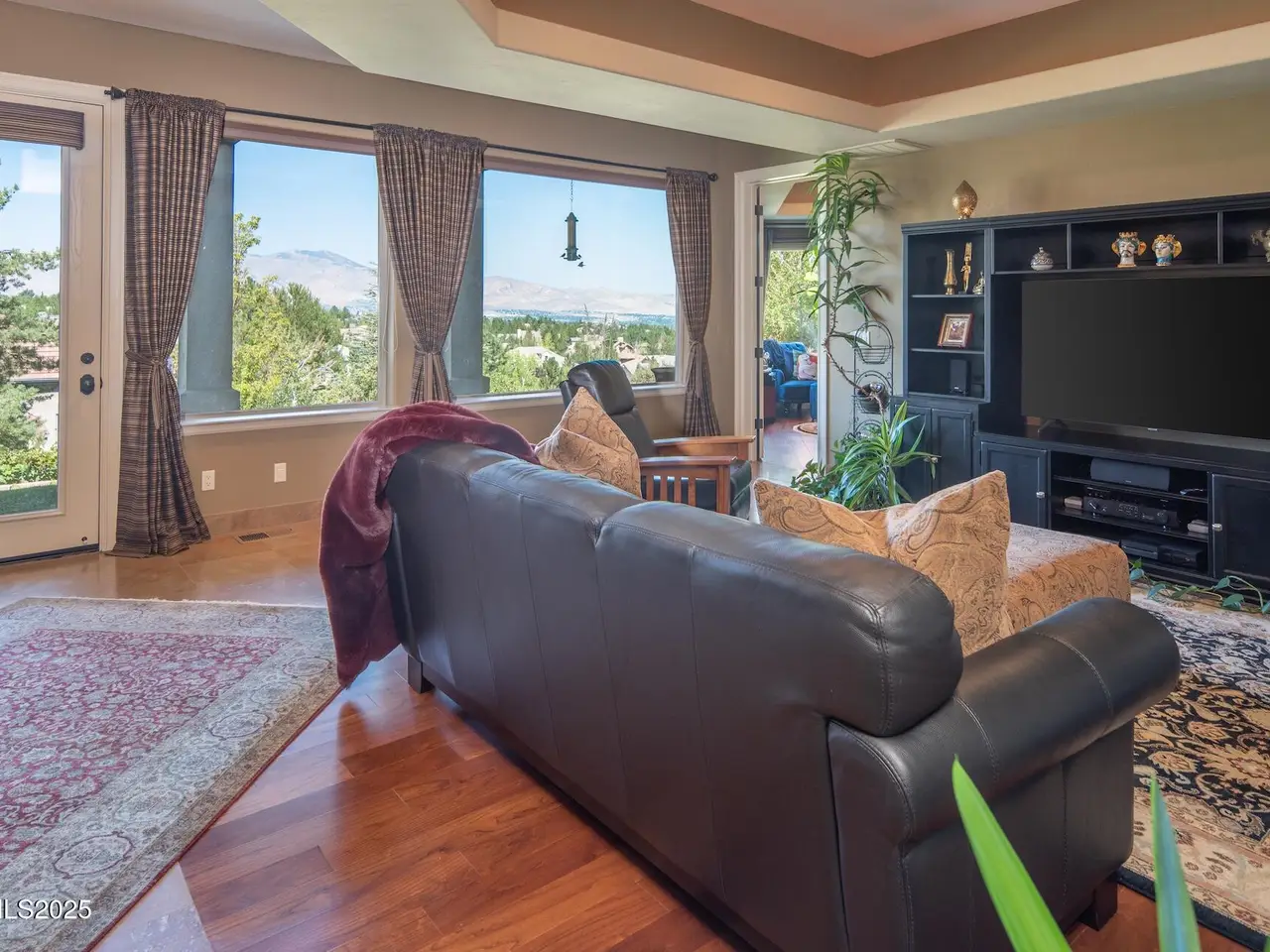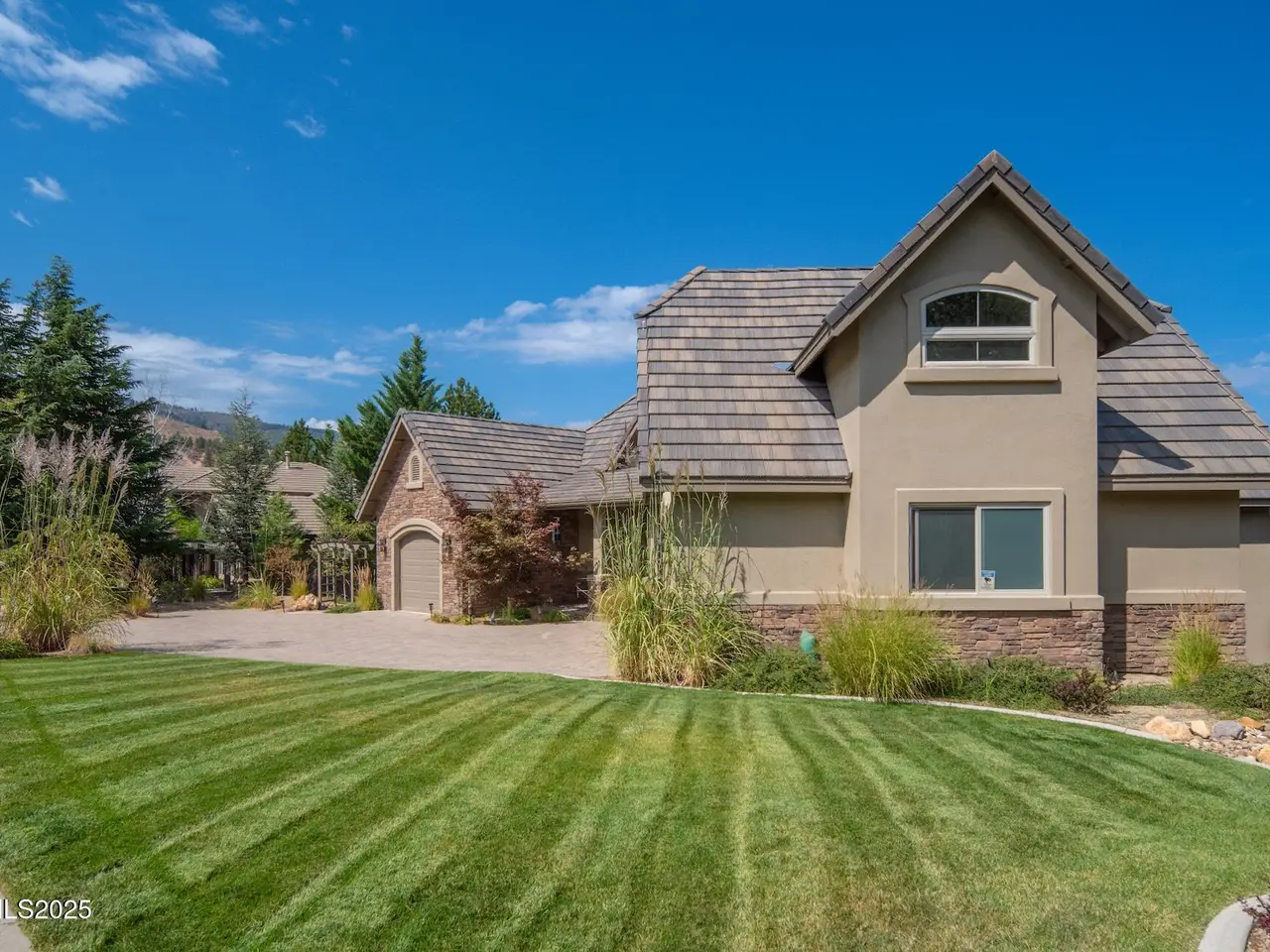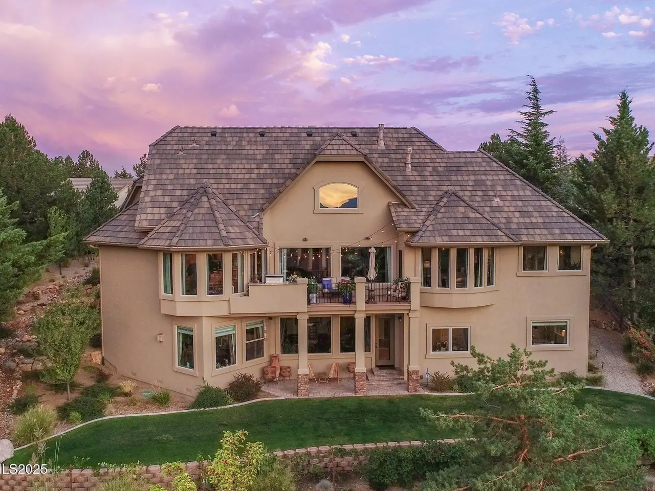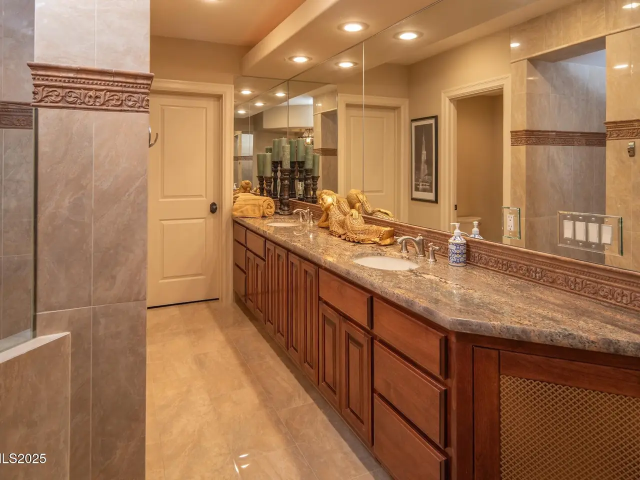 Perched above Reno behind the gates of Mountainshyre in the Caughlin Ranch community, 4905 Mountainshyre Road offers a lifestyle of elegance, security, and comfort. Completed in 2013, this 3904 sqft. custom home spans three levels and blends timeless architecture with modern conveniences, all while showcasing breathtaking views of the city skyline and surrounding mountains. You're instantly welcomed by the home's lush curb appeal, with its paver driveway that leads to the stone-accented exterior, fresh stucco finish, and quartzite steps, making a striking first impression. Inside, a travertine foyer welcomes you to soaring ceilings and windows that frame the panoramic views. The living room features a 20-foot vaulted ceiling, expansive windows, teak hardwood floors, and a dramatic three-sided gas fireplace. The dining room is defined by vaulted ceilings, faux columns, and an elegant chandelier. The open kitchen has slab granite counters, alder cabinetry, a six-burner Jenn-Air range, and paneled Jenn-Air refrigerator. A hexagonal breakfast nook offers unmatched morning views, while a large walk-in pantry with etched glass door provides ample storage. The first of two primary suites offers views from the private deck access, a stone fireplace, and beautiful travertine flooring. The spa-like bath features dual vanities, a soaking tub with mosaic surround, marble counters, and a custom-tiled shower. A large walk-in closet with alder built-ins leads to a reinforced safe room with keypad entry. The lower floor includes an entertainment room with recessed lighting, built in audio, and hardwood flooring with access to the outdoors. Down here, you'll find the second primary suite, currently being used as an office. It features hardwood flooring, blackout shades, and a sleek gas fireplace, and a warm wood paneled ceiling. The attached bath is just as luxurious as its upstairs counterpart and also features walk-in closets and second safe room. Three more downstairs bedrooms provide versatility, each with large closets for ample storage. They share a marble-appointed bathroom with alder cabinetry and walk-in shower. The top floor is dedicated to a home gym featuring commercial-grade flooring, mirrored walls, ceiling fans, and built-in audio. Step outside to a yard designed for year-round enjoyment. The expansive deck, accessed from the living room and primary suite, overlooks Reno's skyline and mountains. A built-in gas BBQ with granite counters makes it ideal for entertaining. The lower, covered patio provides a shaded outdoor retreat. Automatic sprinklers maintain the lush yard with apple, cherry, and plum trees, alongside the private vineyard with its 11 vines. The three oversized garages are finished with epoxy floors, built-in cabinets, and central vacuum outlets, and warm water hook ups for winter car washing. Behind its elegance, the home's advanced technical features include 3 Rheem HVAC units with individual zones, high-efficiency insulation, 75-gallon gas water heater plus 50-gallon electric tank with recirculating pump, hardwired Cat-6 internet and antenna system, 4 camera Lorex surveillance system with monitor, whole-house alarm and DrainVac central vacuum system. Much of this is tucked behind a 221 sqft utility room which is not included in the home's overall square footage. This estate represents a rare opportunity to own one of Reno's most distinctive properties, where craftsmanship, security, and beauty converge.