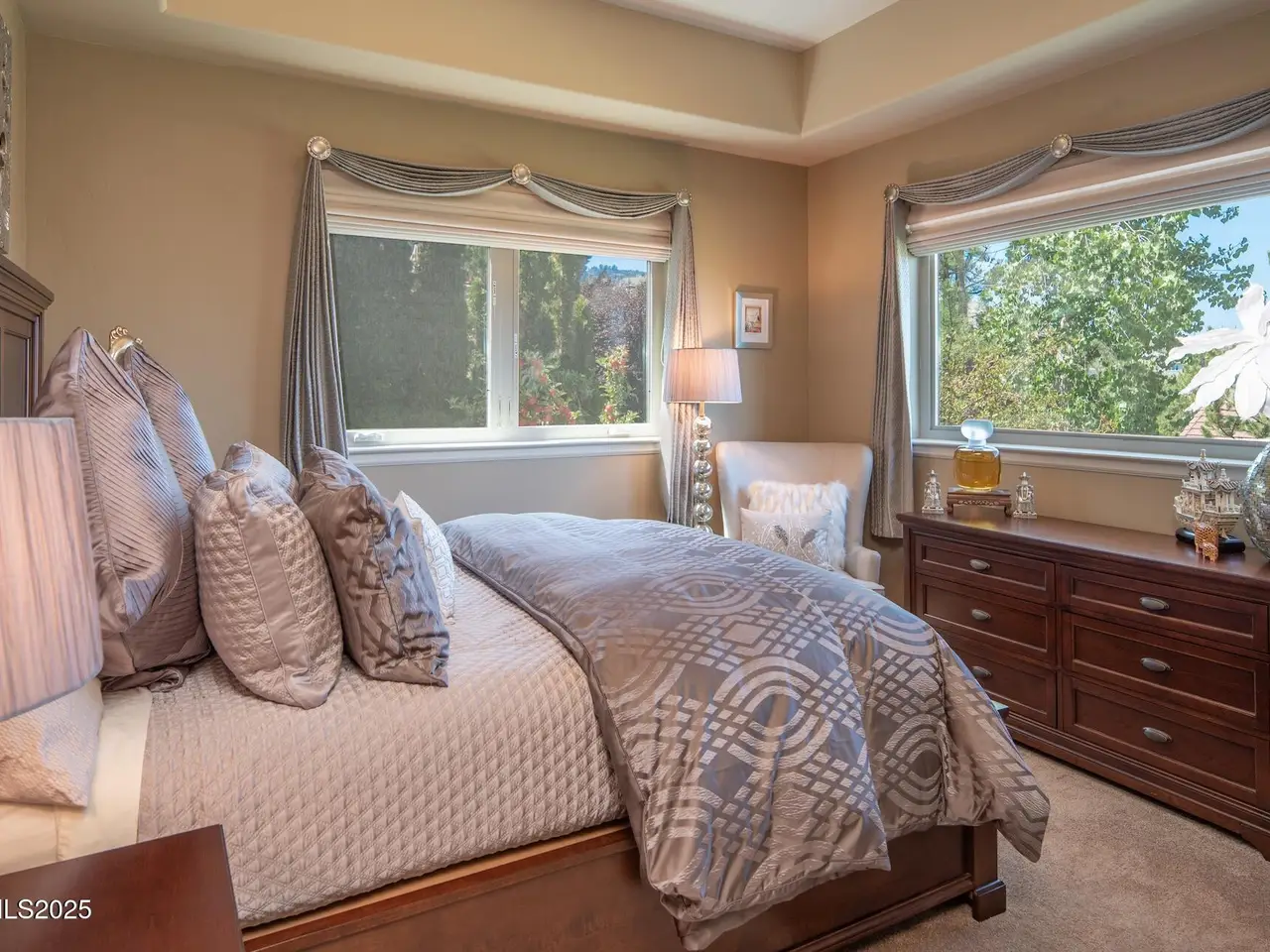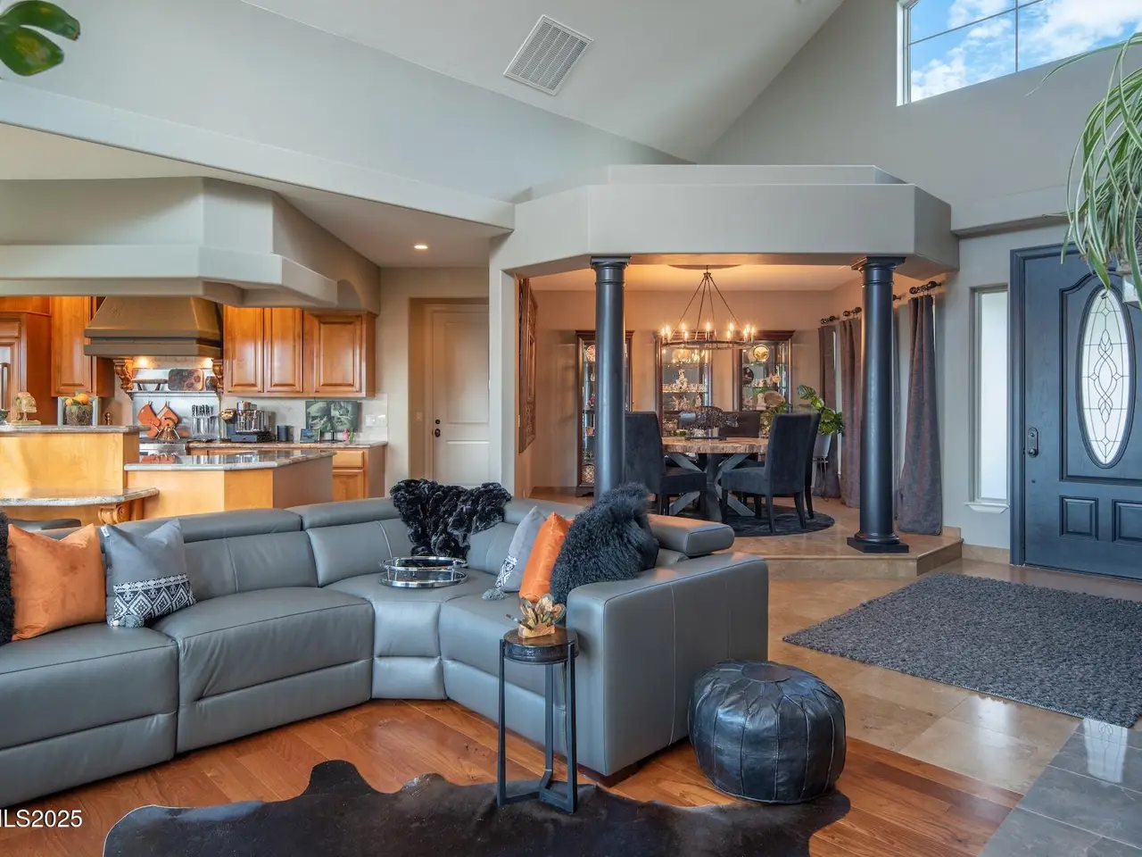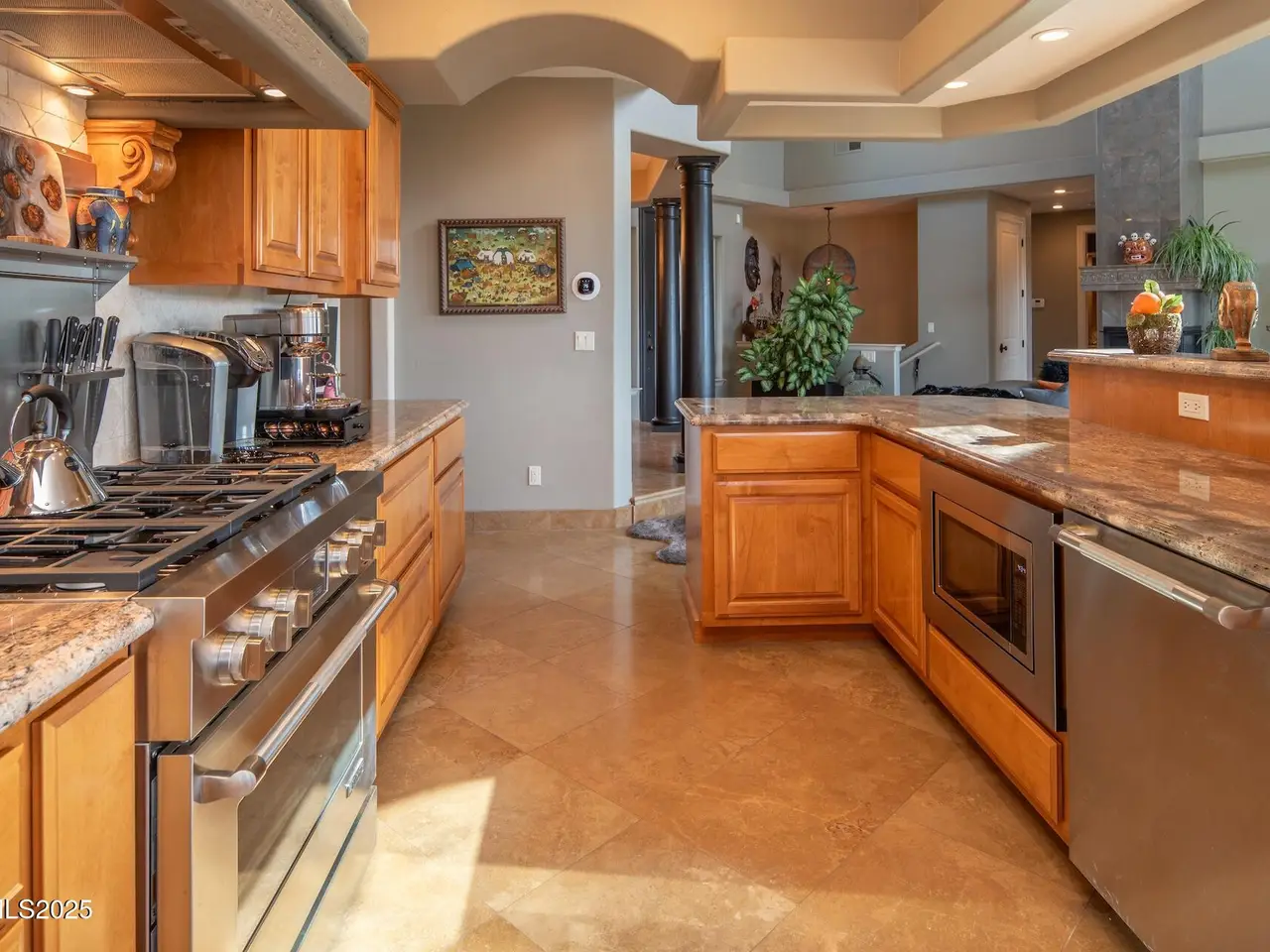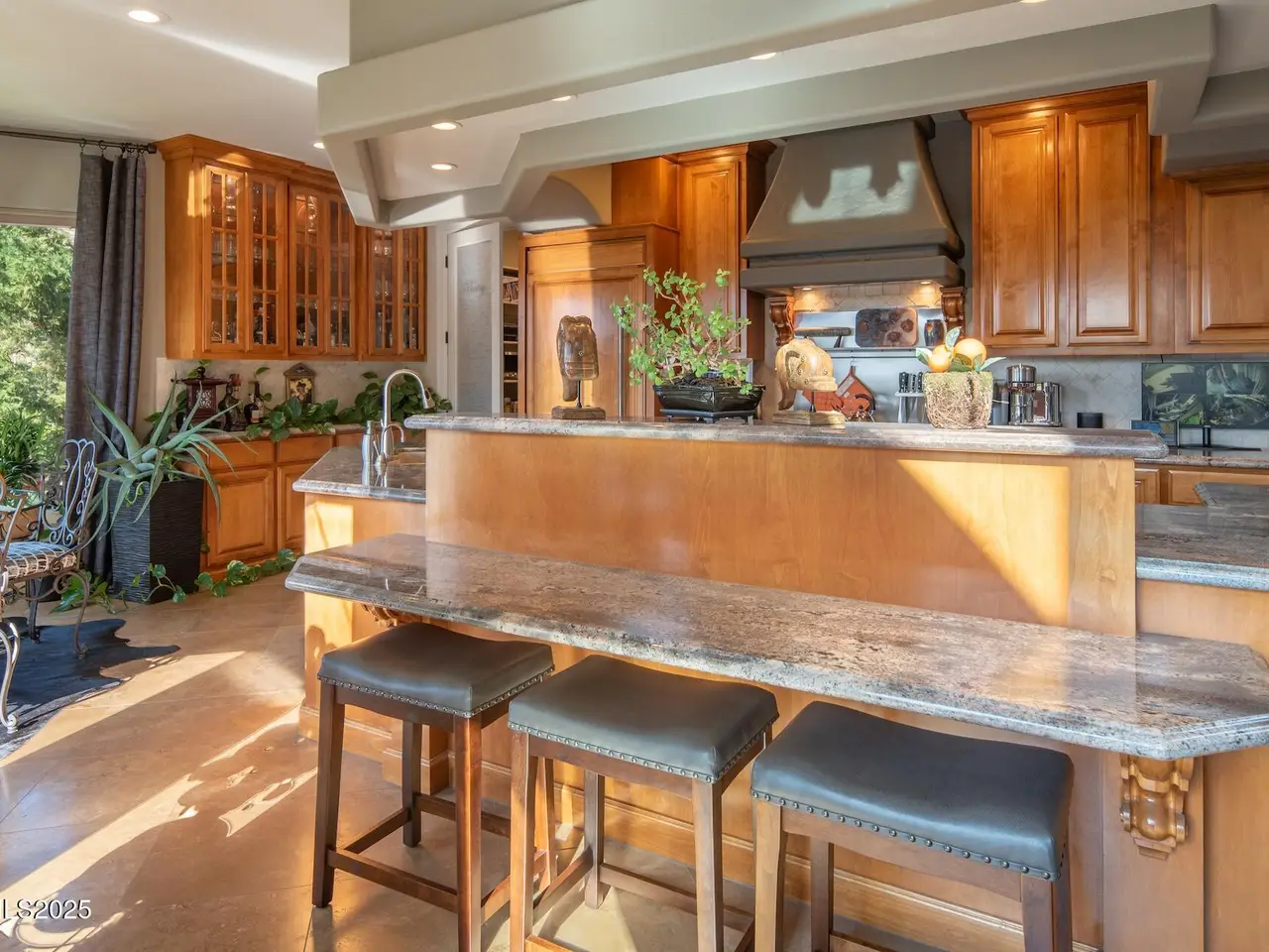 Perched above Reno behind the gates of Mountainshyre in the Caughlin Ranch community, 4905 Mountainshyre Road offers a lifestyle of elegance, security, and comfort. Completed in 2013, this 3904 sqft. custom home spans three levels and blends timeless architecture with modern conveniences, all while showcasing breathtaking views of the city skyline and surrounding mountains. You're instantly welcomed by the home's lush curb appeal, with its paver driveway that leads to the stone-accented exterior, fresh stucco finish, and quartzite steps, making a striking first impression. Inside, a travertine foyer welcomes you to soaring ceilings and windows that frame the panoramic views. The living room features a 20-foot vaulted ceiling, expansive windows, teak hardwood floors, and a dramatic three-sided gas fireplace. The dining room is defined by vaulted ceilings, faux columns, and an elegant chandelier. The open kitchen has slab granite counters, alder cabinetry, a six-burner Jenn-Air range, and paneled Jenn-Air refrigerator. A hexagonal breakfast nook offers unmatched morning views, while a large walk-in pantry with etched glass door provides ample storage. The first of two primary suites offers views from the private deck access, a stone fireplace, and beautiful travertine flooring. The spa-like bath features dual vanities, a soaking tub with mosaic surround, marble counters, and a custom-tiled shower. A large walk-in closet with alder built-ins leads to a reinforced safe room with keypad entry. The lower floor includes an entertainment room with recessed lighting, built in audio, and hardwood flooring with access to the outdoors. Down here, you'll find the second primary suite, currently being used as an office. It features hardwood flooring, blackout shades, and a sleek gas fireplace, and a warm wood paneled ceiling. The attached bath is just as luxurious as its upstairs counterpart and also features walk-in closets and second safe room. Three more downstairs bedrooms provide versatility, each with large closets for ample storage. They share a marble-appointed bathroom with alder cabinetry and walk-in shower. The top floor is dedicated to a home gym featuring commercial-grade flooring, mirrored walls, ceiling fans, and built-in audio. Step outside to a yard designed for year-round enjoyment. The expansive deck, accessed from the living room and primary suite, overlooks Reno's skyline and mountains. A built-in gas BBQ with granite counters makes it ideal for entertaining. The lower, covered patio provides a shaded outdoor retreat. Automatic sprinklers maintain the lush yard with apple, cherry, and plum trees, alongside the private vineyard with its 11 vines. The three oversized garages are finished with epoxy floors, built-in cabinets, and central vacuum outlets, and warm water hook ups for winter car washing. Behind its elegance, the home's advanced technical features include 3 Rheem HVAC units with individual zones, high-efficiency insulation, 75-gallon gas water heater plus 50-gallon electric tank with recirculating pump, hardwired Cat-6 internet and antenna system, 4 camera Lorex surveillance system with monitor, whole-house alarm and DrainVac central vacuum system. Much of this is tucked behind a 221 sqft utility room which is not included in the home's overall square footage. This estate represents a rare opportunity to own one of Reno's most distinctive properties, where craftsmanship, security, and beauty converge.