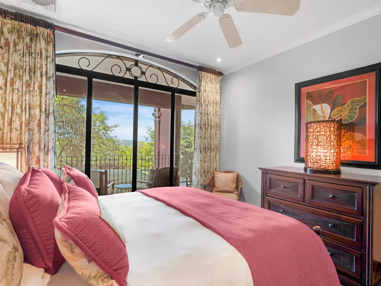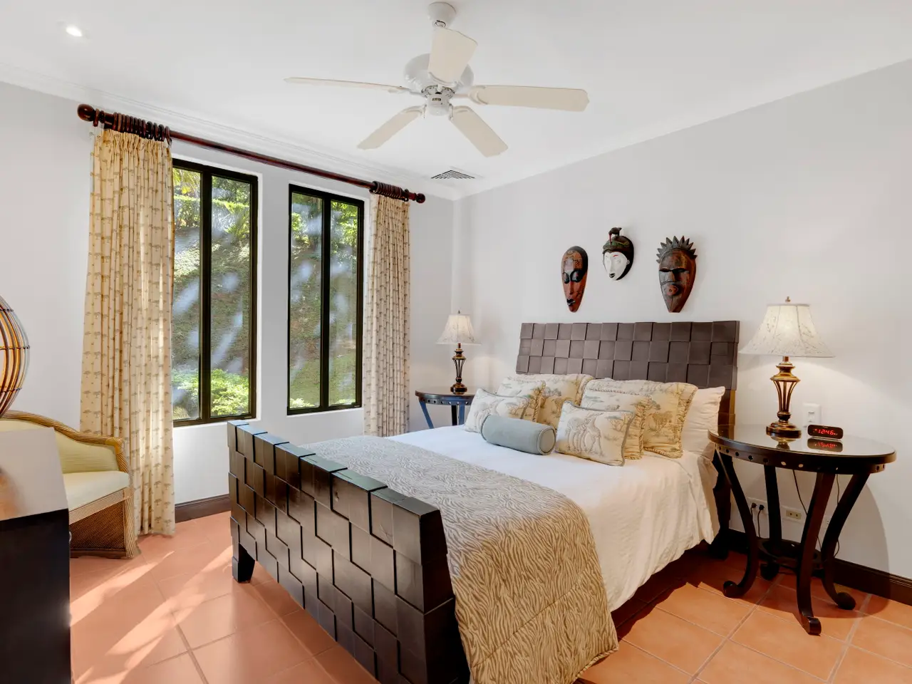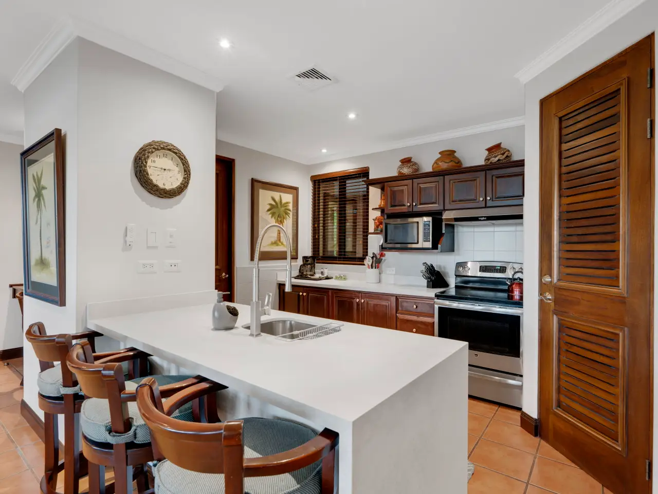 Located in the prestigious gated community of Reserva Conchal—often referred to as the “Crown Jewel” of Guanacaste—this stylish home boasts 3 bedrooms, 3 1/2 baths, plenty of space both indoors and outdoors, and has many perks that other homes in this development simply don’t have. As you enter the home, you will immediately notice the abundant natural light and open concept that this home offers, as well as its unique ability to seamlessly blend its traditional, rich hardwoods that Costa Rica is known for with a more modern, sophisticated vibe. And it is this perfect blend that captures the best of both worlds for its visitors. The living room features beautiful tones of blues and grays, a custom made entertainment center with flat screen TV, and a built in desk/bookshelf, perfect for use as a home office. This huge space opens to the dining room and, in turn, into the recently remodeled kitchen, which features hardwood cabinets, sleek quartz countertops, a large pantry for extra storage, and a striking island with waterfall edges that doubles as a breakfast bar for three. This open concert space aso features sliding glass doors that lead to a phenomenal covered patio featuring not one, not two, but three inviting spaces for guests to lounge while admiring the stunning tropical views, and hues of pinks and purples in the sky at sunset. Each of the bedrooms come with picturesque floor-to-ceiling views of the nature and it’s own en-suite bathrooms. The principle bedroom is a show stopper, with its impressive size, beautiful views, and ensuite bathroom again harmonizes the Costa Rican hardwoods with modern conveniences. The Bougainvillea development is a highly coveted community with its own private clubhouse, complete with a resort style pool, grill station and outdoor kitchen. Residents also have access to the pools of the famous Westin Resort and Spa, and Reserva Conchal’s beach club, which is nothing short of spectacular. The beach club features gorgeous pools, a high-end restaurant with poolside service, a fitness gym, his and her spas, hot-cold hydrotherapy pools, and water sports equipment. Best of all, this beach club is located on Playa Conchal, which is often referred to as one of the most beautiful beaches in Costa Rica. Reserva Conchal is a massive 2,300 acre resort, featuring a world-class golf course designed by Robert Trent Jones II, the Marriott-branded Westin and W hotels, over a dozen restaurants, tennis courts, pickle-ball courts, hiking and biking trails, and even zip-lining for its residents to enjoy.