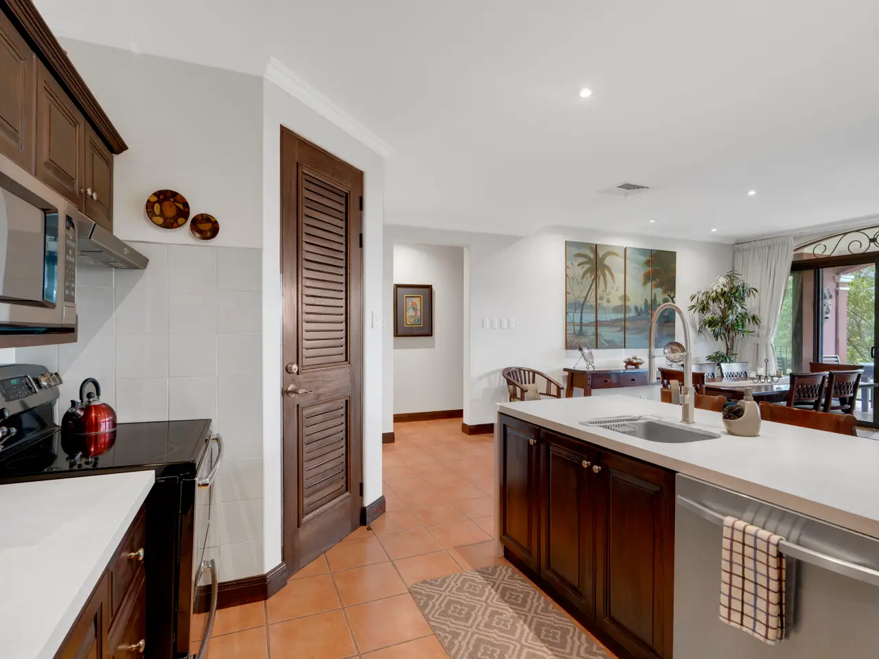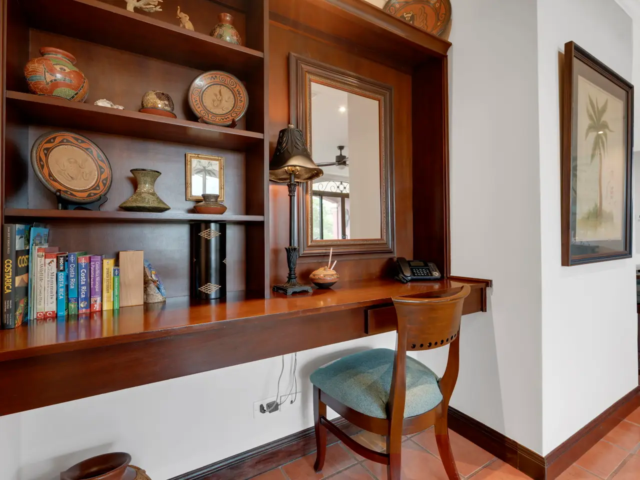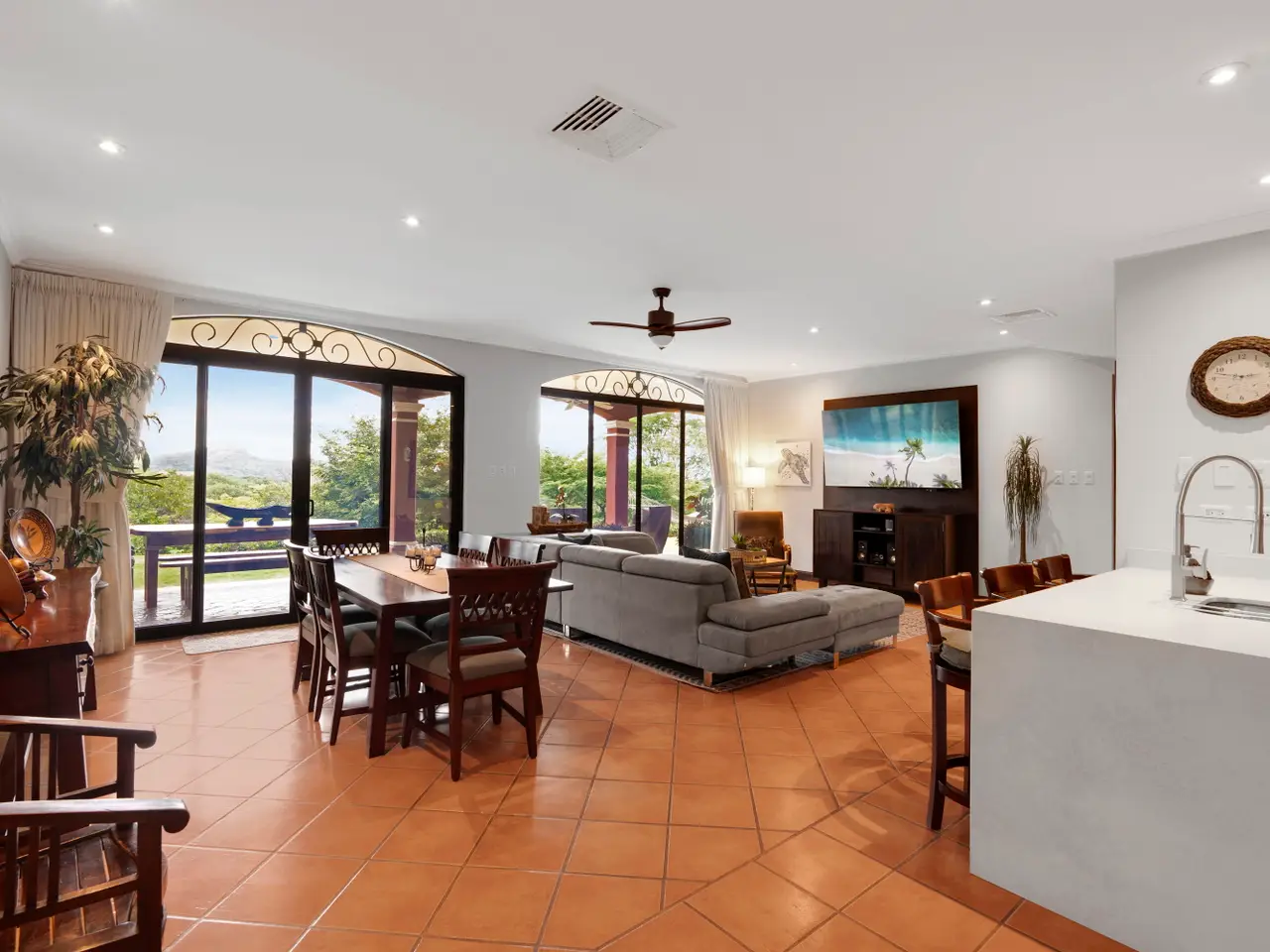 Located in the prestigious gated community of Reserva Conchal—often referred to as the “Crown Jewel” of Guanacaste—this stylish home boasts 3 bedrooms, 3 1/2 baths, plenty of space both indoors and outdoors, and has many perks that other homes in this development simply don’t have. As you enter the home, you will immediately notice the abundant natural light and open concept that this home offers, as well as its unique ability to seamlessly blend its traditional, rich hardwoods that Costa Rica is known for with a more modern, sophisticated vibe. And it is this perfect blend that captures the best of both worlds for its visitors. The living room features beautiful tones of blues and grays, a custom made entertainment center with flat screen TV, and a built in desk/bookshelf, perfect for use as a home office. This huge space opens to the dining room and, in turn, into the recently remodeled kitchen, which features hardwood cabinets, sleek quartz countertops, a large pantry for extra storage, and a striking island with waterfall edges that doubles as a breakfast bar for three. This open concert space aso features sliding glass doors that lead to a phenomenal covered patio featuring not one, not two, but three inviting spaces for guests to lounge while admiring the stunning tropical views, and hues of pinks and purples in the sky at sunset. Each of the bedrooms come with picturesque floor-to-ceiling views of the nature and it’s own en-suite bathrooms. The principle bedroom is a show stopper, with its impressive size, beautiful views, and ensuite bathroom again harmonizes the Costa Rican hardwoods with modern conveniences. The Bougainvillea development is a highly coveted community with its own private clubhouse, complete with a resort style pool, grill station and outdoor kitchen. Residents also have access to the pools of the famous Westin Resort and Spa, and Reserva Conchal’s beach club, which is nothing short of spectacular. The beach club features gorgeous pools, a high-end restaurant with poolside service, a fitness gym, his and her spas, hot-cold hydrotherapy pools, and water sports equipment. Best of all, this beach club is located on Playa Conchal, which is often referred to as one of the most beautiful beaches in Costa Rica. Reserva Conchal is a massive 2,300 acre resort, featuring a world-class golf course designed by Robert Trent Jones II, the Marriott-branded Westin and W hotels, over a dozen restaurants, tennis courts, pickle-ball courts, hiking and biking trails, and even zip-lining for its residents to enjoy.