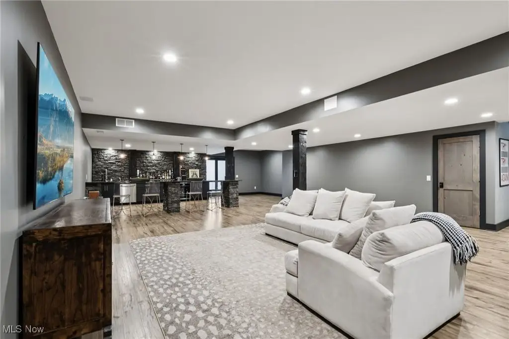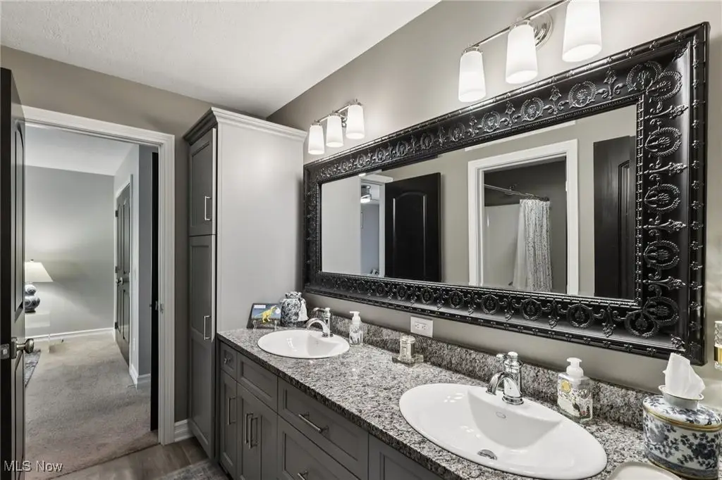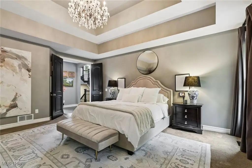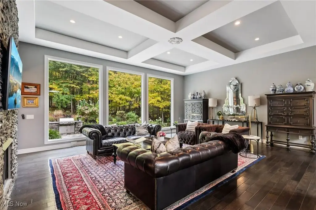 An oasis of luxury & tranquility by Ruggiero Builders. Nestled on 2 wooded acres w/ a gentle creek & sweeping natural views, this extraordinary custom built home combines elegance, comfort & superior craftsmanship. From the moment you step inside, the home's warmth & architectural detail unfold accented with spectacular Restoration Hardware lighting. As you enter, a grand great room is anchored by 2-sided stone fireplace, coffered ceilings & a wall off windows framing the scenic landscape. State-of-the-art kitchen boasts a generous granite island w/ breakfast bar, custom wood cabinetry & high-end appliances. This exceptional kitchen showcases an open floor plan that effortlessly connects the dining area/hearth room where a 2-sided fireplace adds warmth & character. Inviting sunroom w/dramatic vaulted ceiling & 3 walls of windows frame picturesque views of the outdoors. Designed for comfort, this layout creates a welcoming atmosphere. Retreat to the first floor primary suite, a serene haven w/ spa inspired glam bath, soaking tub, granite vanities, & walk-in glass shower. Oversized, custom walk-in closet, w/ his/her areas & built-ins. Adjacent library w/ rich millwork & double entry doors provides a perfect setting for work/relaxation. Upstairs, 3 large bedrooms offer privacy & comfort, incl. one ensuite & a well-appointed jack/jill bath. Walk-out lower level is designed for enjoyment/entertaining. Full wet bar w/ granite counters, wine coolers, & high-top seating for 12 boasts a game room, rec room, & gym designed for fun & relaxation. Half bath & wine storage complete this level. Take the fun outdoors & walk out to the yard & fire pit for cozy evenings. Outdoor living rivals the interior w/ a beautiful silver travertine patio for dining w/ built in grill, granite bar & gas fireplace table. The property is enhanced with integrated security & exterior cameras. This is more than a place to live-it's a place to create memories, unwind in style & live your best life!
