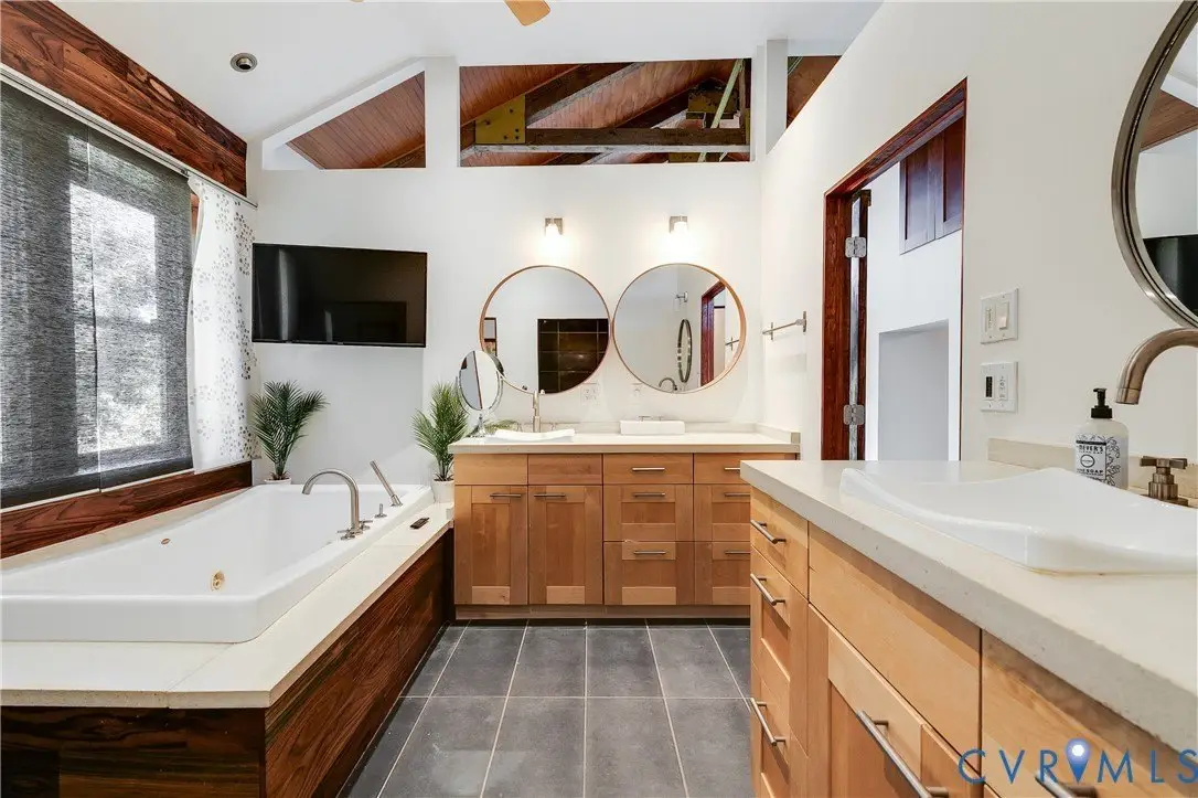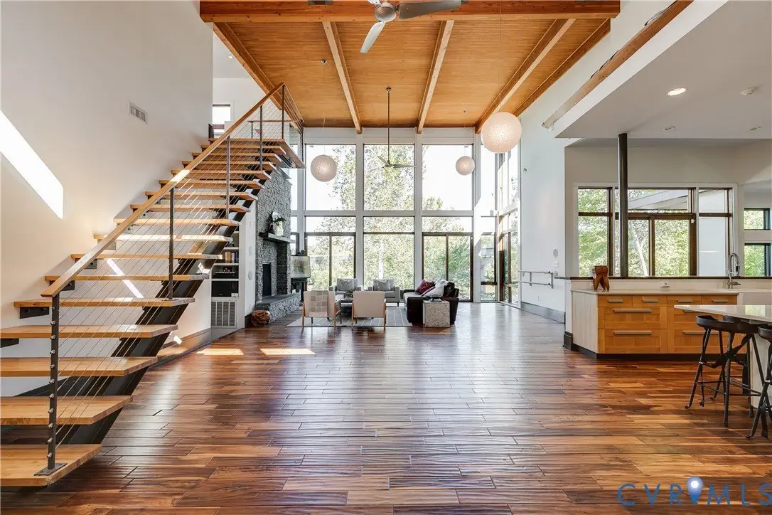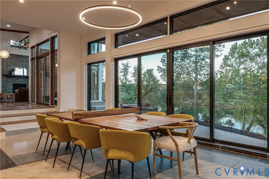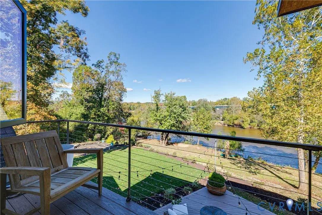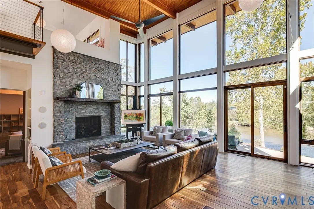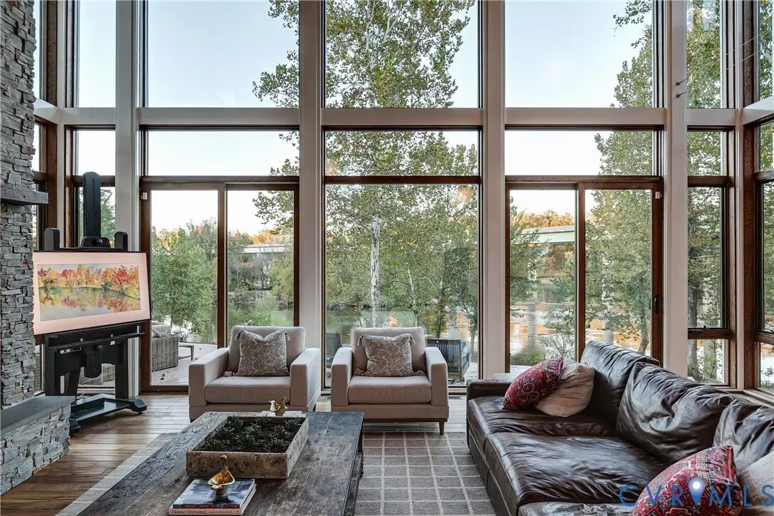 ""Extraordinary riverfront contemporary home with rare private access to the James River! This architectural gem blends dramatic design with comfortable living and stunning natural views. This home known as ""The Igloo House"""" was originally created by artist Demetrios Mavroudis and was masterfully reimagined with thoughtful additions and modern luxury while preserving its artful history. Walls of glass, vaulted ceilings with exposed beams, marble floors from the Federal Trade building, architectural details from the University of Richmond and open living spaces capture the light and the river from nearly every room. The chef's kitchen features SubZero and Wolf, quartz counters and an oversized island - perfect for entertaining. The spacious primary suite offers panoramic river views, spa bath with heated floors and exceptional custom cabinetry in the large walk-in closet. There is an additional en-suite bedroom/bath combo, 2 additional bedrooms with a hall bath to share, a 5th possible bedroom with a full bath and a large main floor laundry room. There are 2 additional versatile offices and studio spaces, which provide flexibility for modern living. The oversized former garage houses amazing storage, a huge workshop, an office and an incredible climbing wall gym with """"sprung"""" floor. This space could easily be repurposed to a parking garage again. Outdoor spaces include expansive decks and balconies, a koi pond, stone fire pit and direct access to the flatwater for kayaking and canoeing. Set on over 2 acres with landscaped gardens and spectacular sunsets over Bosher's Dam, this home is a one-of-a-kind Richmond landmark featured in RHome, Modern Home, and HGTV. Every stone, beam and piece of metal tells a story in this home. What began as a park ranger's home, then became an artist's studio and now stands as a deeply loved riverfront retreat for a family. It is now your turn to start your new lifestyle and write your next chapter in this exceptional and special place.""