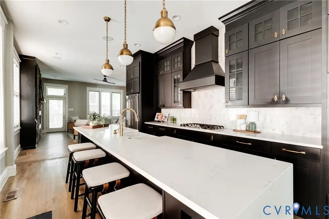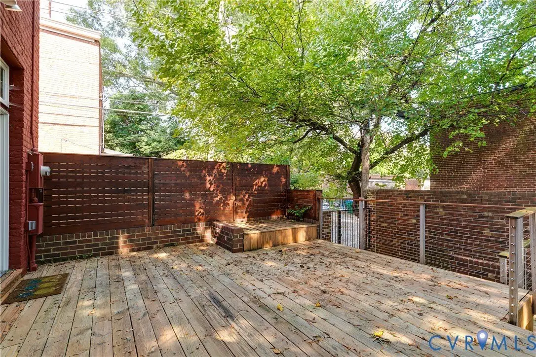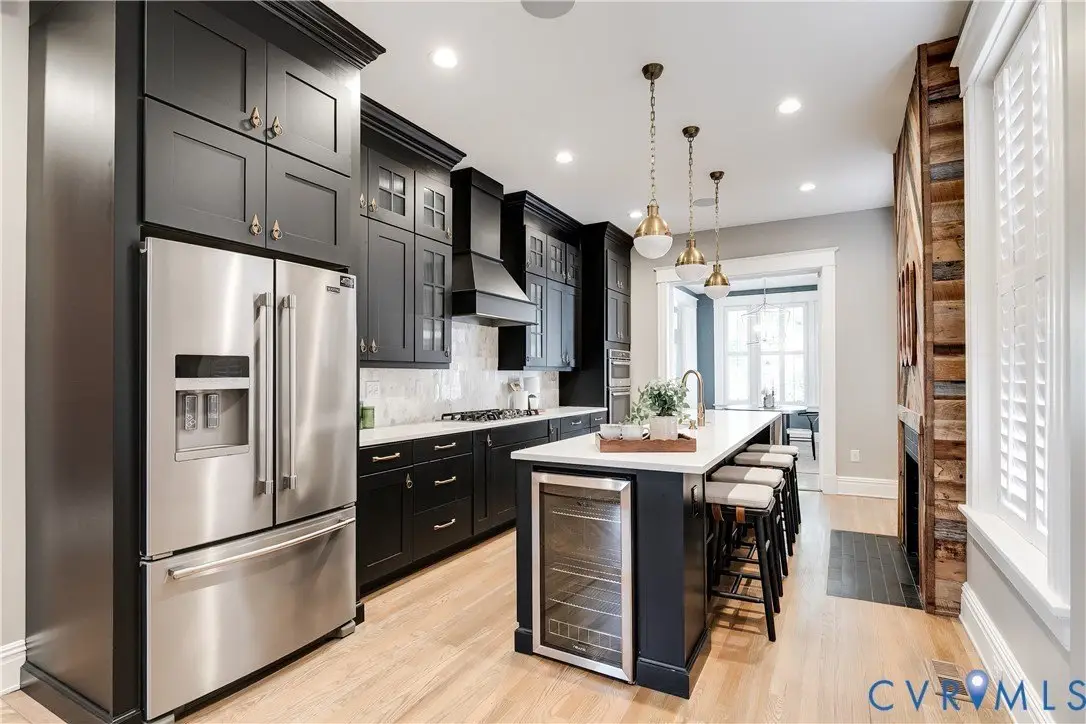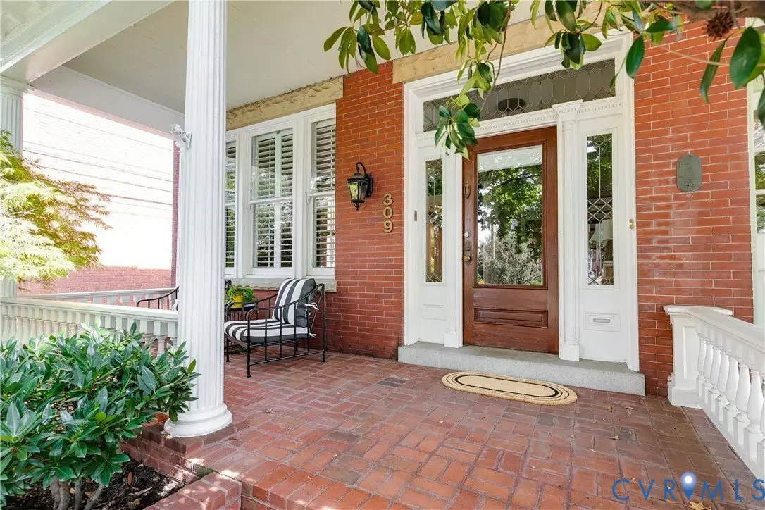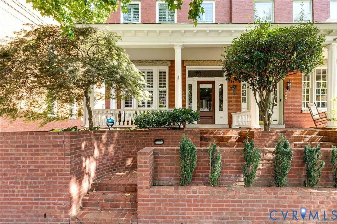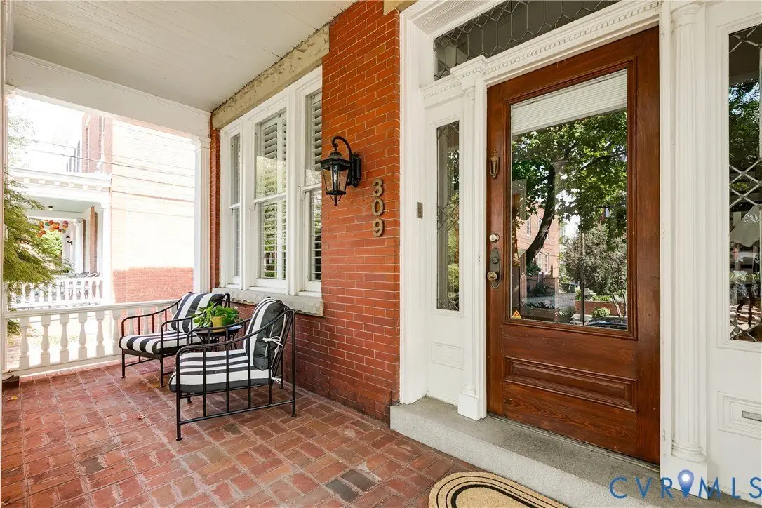 This wonderfully renovated classic row home is perfectly located on a quiet block in the heart of The Fan. Enjoy the large front porch to connect with neighbors and watch the world go by in this quiet spot. With corner placement, natural light floods the open floor plan that mixes warm classic architecture with modern living. The designer kitchen with top of the line appliances, custom cabinets and a stunning quartz waterfall countertop opens to all the living spaces.. Touch sensitive faucet, wine fridge and 5 burner gas cooktop are just a few of the many details. The stacked stone surround and reclaimed wood mantle around the gas fireplace anchors the expansive living room with built-in bar. Built-in retractable home theater screen, projector and surround sound convey with the house. On a back hallway, there is a large walk-in pantry and a renovated half bath. The large primary bedroom suite features a large closet, and stunning marble and glass bath suite. The two other large bedrooms, renovated hall bath and well-equipped laundry room complete the upstairs. The outdoor deck provides expansive space for entertaining or outdoor dining, and there is a green space which is great for pets. Side access basement is dry and provides incredible storage. NEW ROOF installed 4/23. Permit only makes on street parking a breeze.
