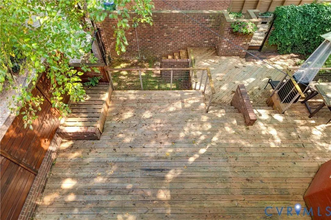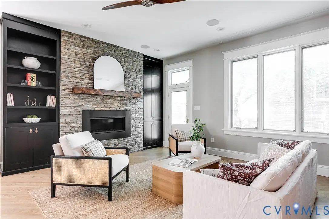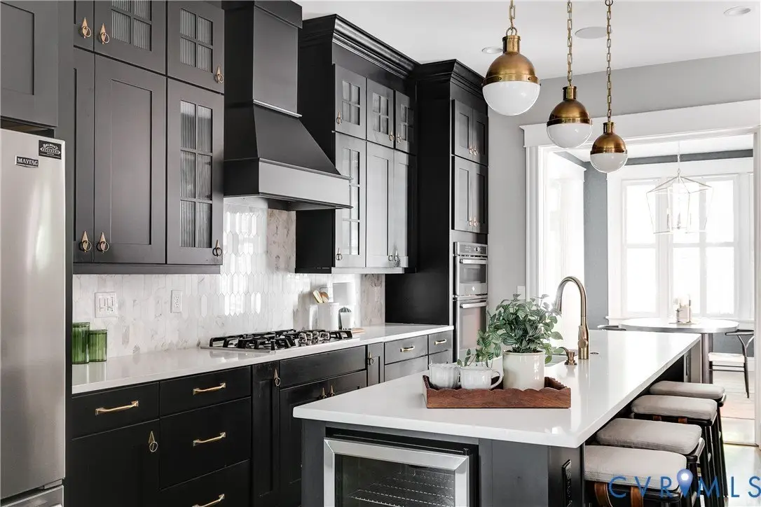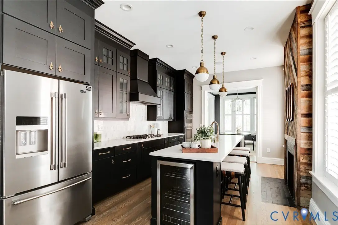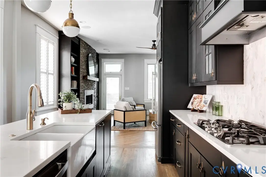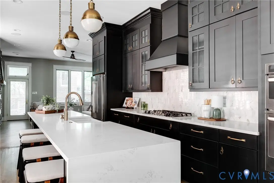 This wonderfully renovated classic row home is perfectly located on a quiet block in the heart of The Fan. Enjoy the large front porch to connect with neighbors and watch the world go by in this quiet spot. With corner placement, natural light floods the open floor plan that mixes warm classic architecture with modern living. The designer kitchen with top of the line appliances, custom cabinets and a stunning quartz waterfall countertop opens to all the living spaces.. Touch sensitive faucet, wine fridge and 5 burner gas cooktop are just a few of the many details. The stacked stone surround and reclaimed wood mantle around the gas fireplace anchors the expansive living room with built-in bar. Built-in retractable home theater screen, projector and surround sound convey with the house. On a back hallway, there is a large walk-in pantry and a renovated half bath. The large primary bedroom suite features a large closet, and stunning marble and glass bath suite. The two other large bedrooms, renovated hall bath and well-equipped laundry room complete the upstairs. The outdoor deck provides expansive space for entertaining or outdoor dining, and there is a green space which is great for pets. Side access basement is dry and provides incredible storage. NEW ROOF installed 4/23. Permit only makes on street parking a breeze.