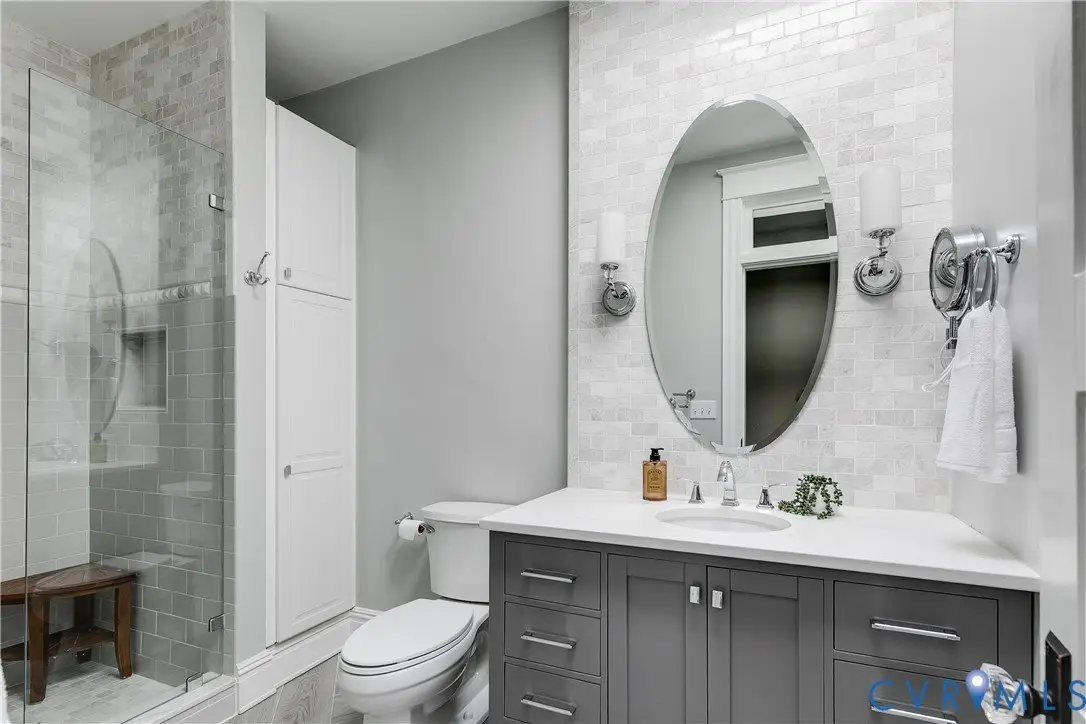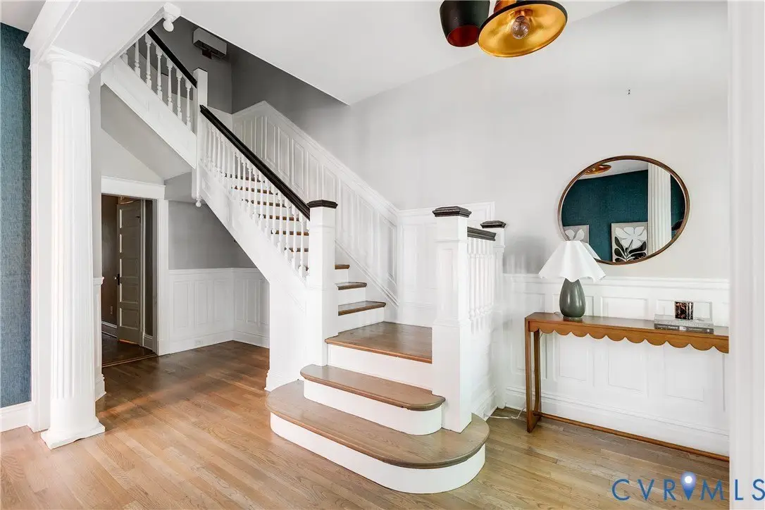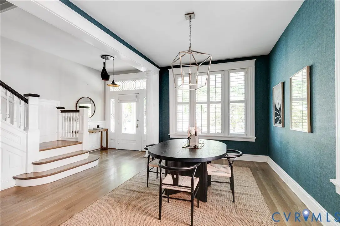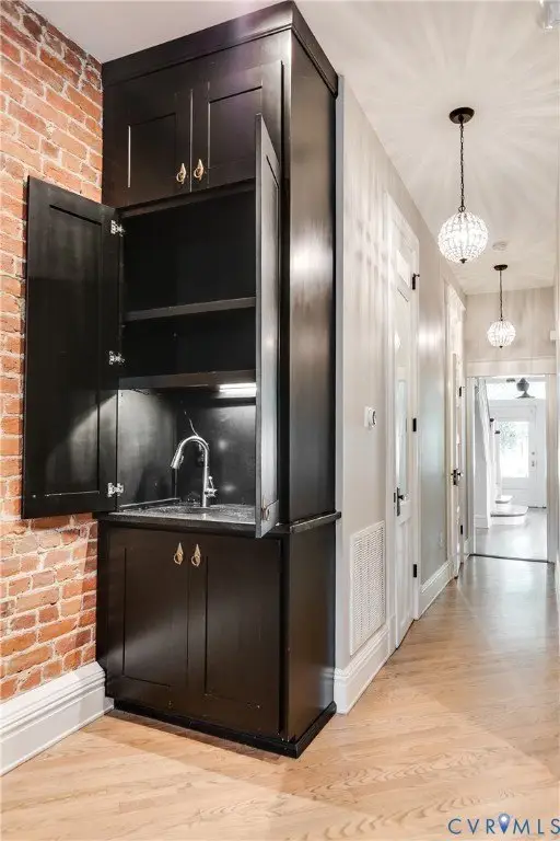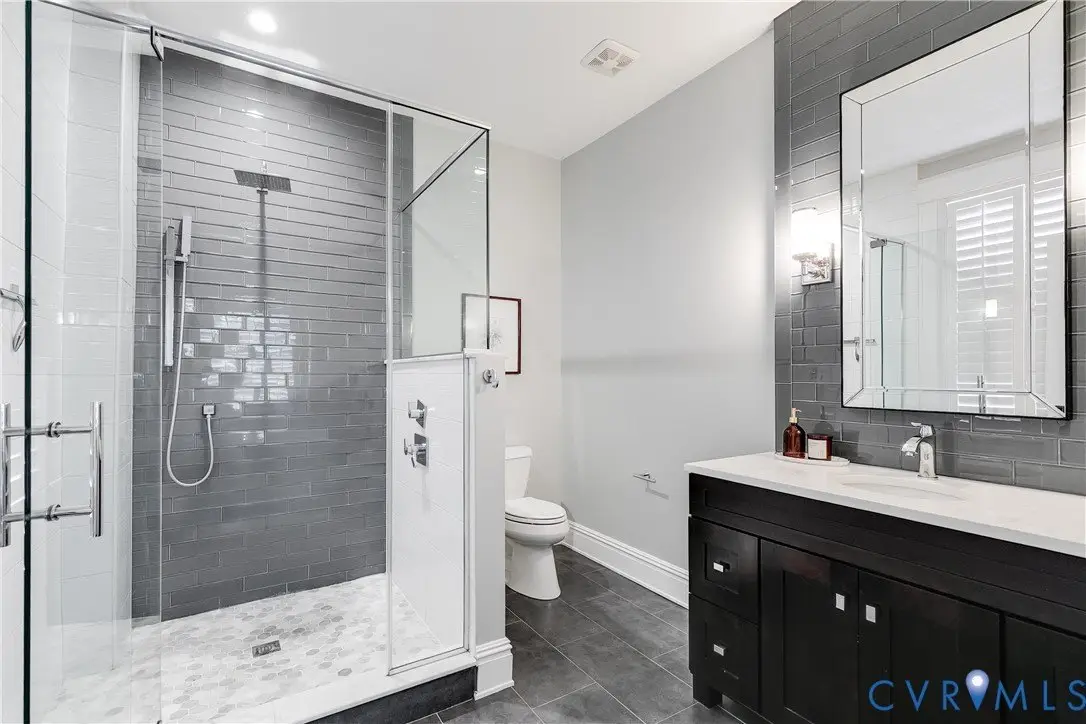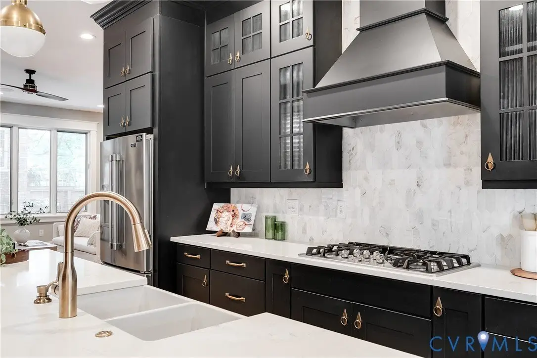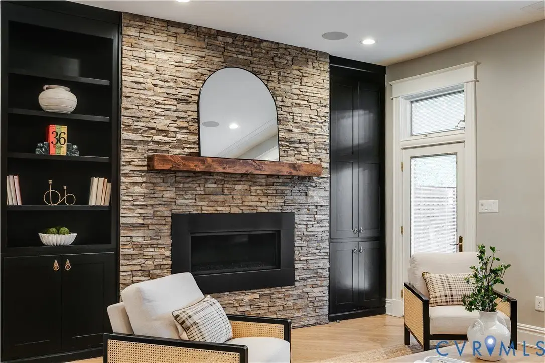 This wonderfully renovated classic row home is perfectly located on a quiet block in the heart of The Fan. Enjoy the large front porch to connect with neighbors and watch the world go by in this quiet spot. With corner placement, natural light floods the open floor plan that mixes warm classic architecture with modern living. The designer kitchen with top of the line appliances, custom cabinets and a stunning quartz waterfall countertop opens to all the living spaces.. Touch sensitive faucet, wine fridge and 5 burner gas cooktop are just a few of the many details. The stacked stone surround and reclaimed wood mantle around the gas fireplace anchors the expansive living room with built-in bar. Built-in retractable home theater screen, projector and surround sound convey with the house. On a back hallway, there is a large walk-in pantry and a renovated half bath. The large primary bedroom suite features a large closet, and stunning marble and glass bath suite. The two other large bedrooms, renovated hall bath and well-equipped laundry room complete the upstairs. The outdoor deck provides expansive space for entertaining or outdoor dining, and there is a green space which is great for pets. Side access basement is dry and provides incredible storage. NEW ROOF installed 4/23. Permit only makes on street parking a breeze.
