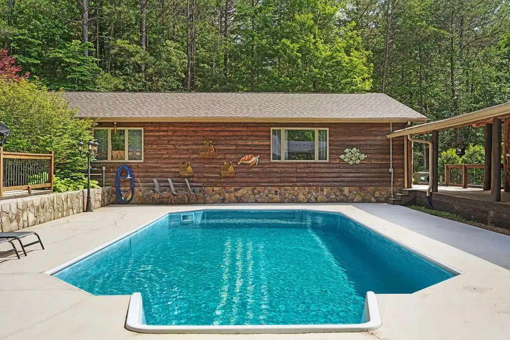 Welcome to your private sanctuary - where luxury meets rustic charm in this stunning custom-built home inspired by the serene beauty of the Smoky Mountains. Nestled on approximately 6.74 acres, this 2,718± sq ft masterpiece is a rare opportunity to own a conventionally framed, log cabin-style retreat, meticulously crafted by its original owners with no detail spared. Totally updated, roof, windows, HVAC, and water heaters have been replaced 2023-2025. Nothing spared. As you arrive, you'll be greeted by one of two private ponds, setting a tranquil tone before you even step inside. The interior opens to a breathtaking great room with soaring cathedral ceilings, seamlessly connected to a gourmet kitchen featuring custom cabinetry, premium countertops, and high-end appliances - perfect for both entertaining and everyday living. The luxurious primary suite is a true retreat, complete with its own fireplace, dual walk-in closets, a spa-like ensuite with upscale finishes, and even a private sauna. Two additional bedrooms, a spacious office (or optional fourth bedroom), a full bath, and a well-appointed laundry room round out the main home's thoughtful layout. Ideal for guests or multi-generational living, the separate 1500 sf guest house offers an open-concept design, full kitchen, and bath - perfect as a mother-in-law suite, extended stay for older children, or a potential income-producing Airbnb. Step outside to your very own resort-style oasis. The expansive patio and sparkling pool are rivaled only by the stylish cabana - complete with built-in grill, refrigerator, and cooler storage to keep refreshments flowing all day long. Additional features include a large 4-bay garage for your RVs, boats, or collector cars, a dedicated workshop, and even a deer-skinning station for outdoor enthusiasts. 6.64 acres joining this property with 2 buildings can be purchased for $250k. This is more than a home - it's a resort lifestyle. Schedule your private showing.