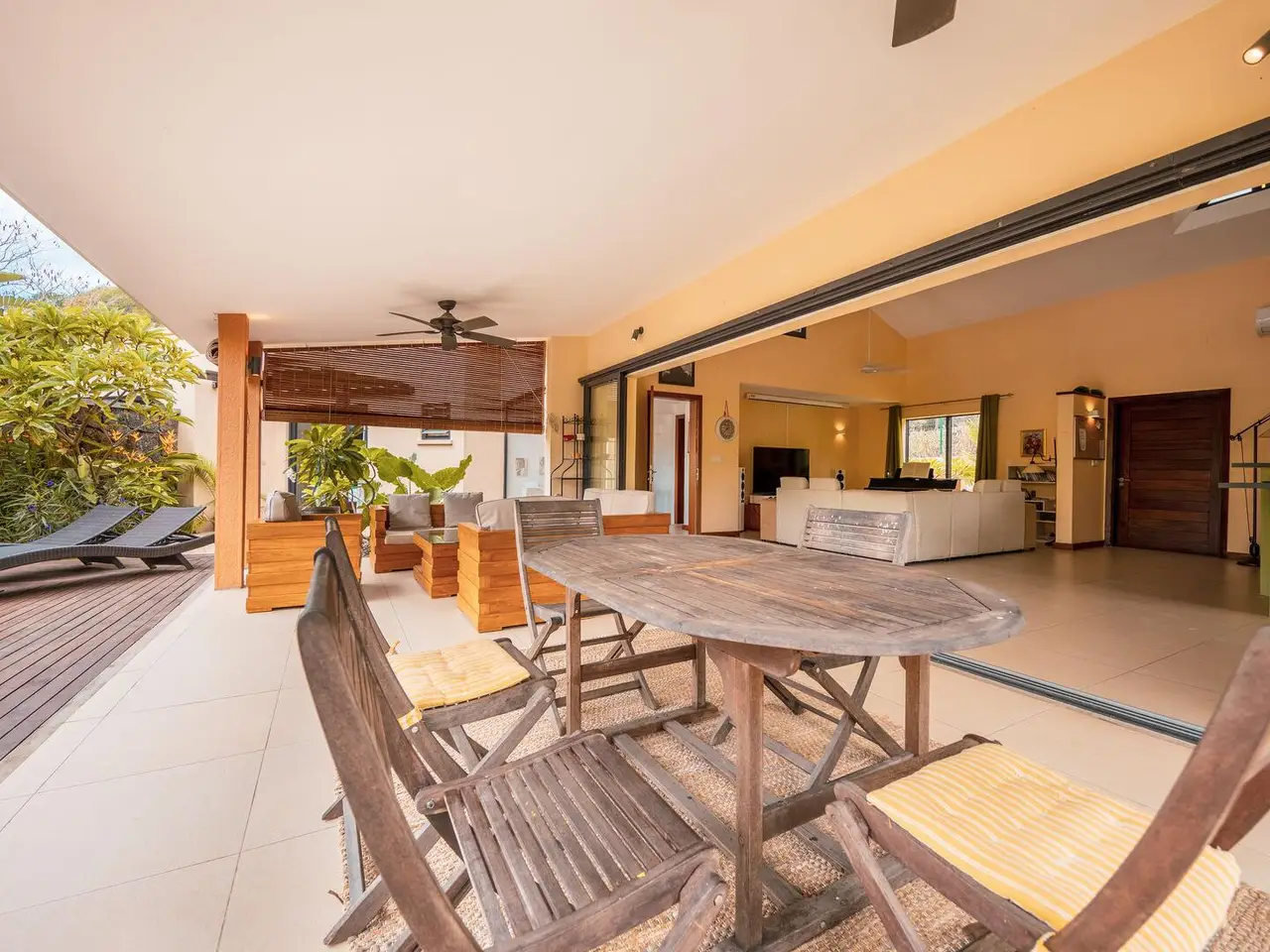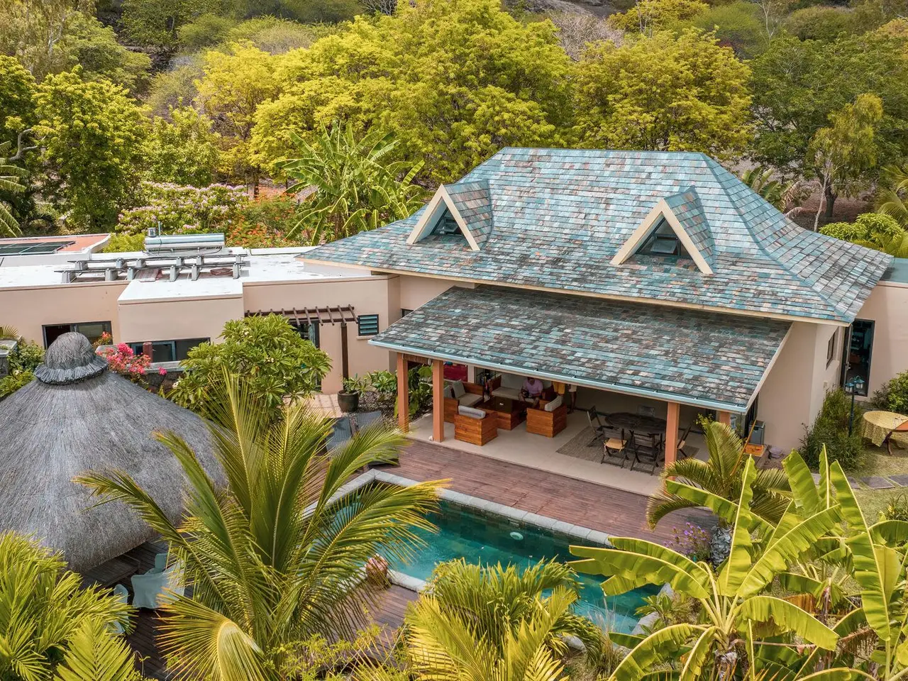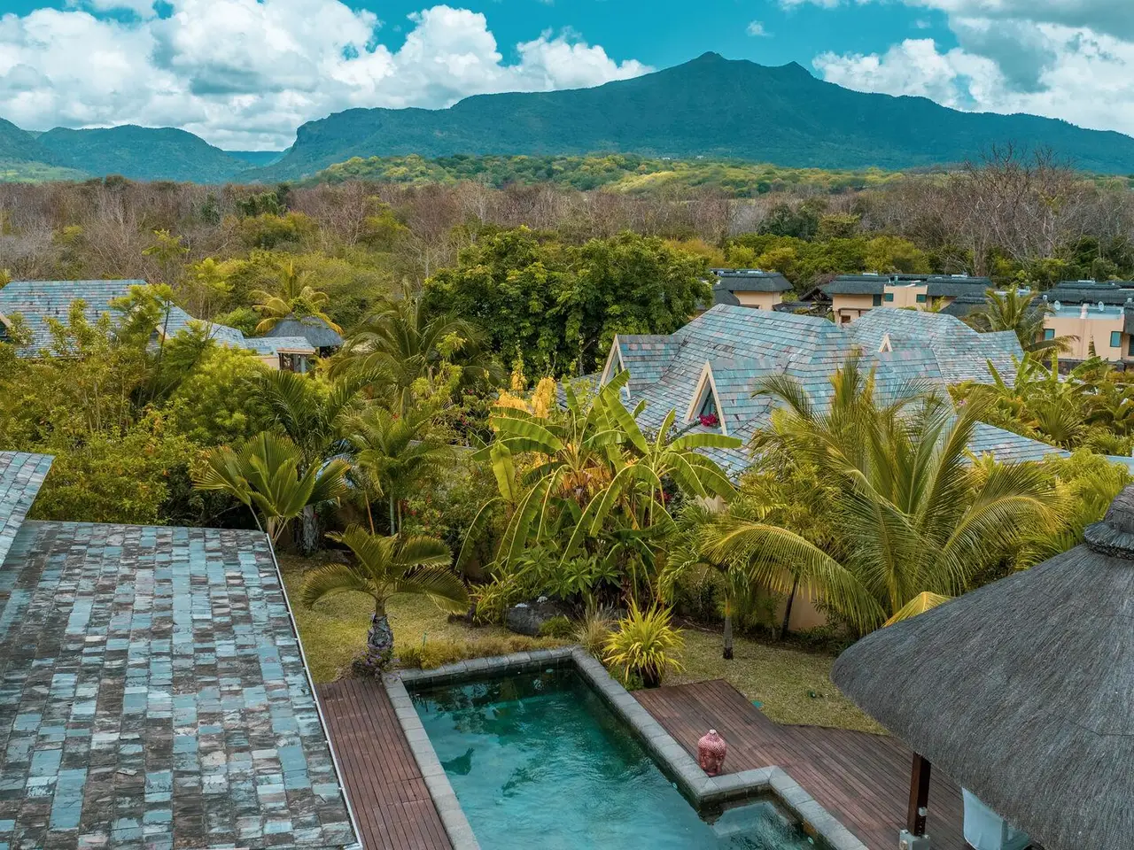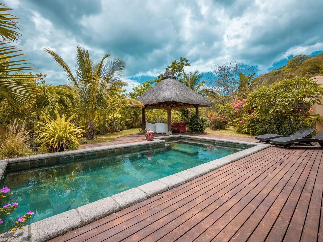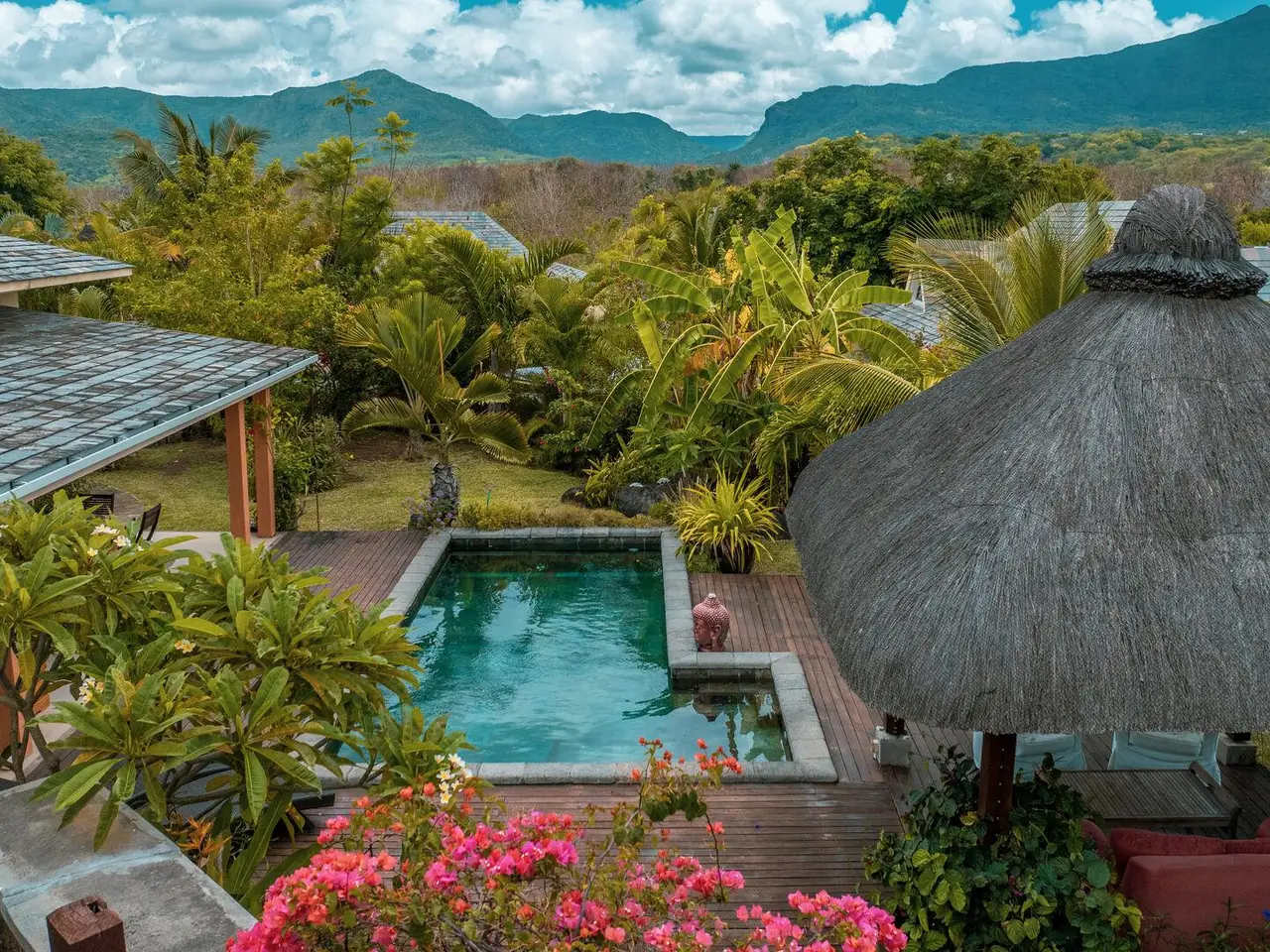 Tucked away amidst the stunning mountains of the west coast of Mauritius, this exquisite Balinese-style villa is a haven of tranquility and tropical charm. Surrounded by lush nature, the home is designed to invite natural light and cooling breezes through its spacious, airy interiors and large openings. The manicured garden, adorned with fruit trees, features a charming kiosk perfect for sundowners by the slate-tiled pool. Offering three luxurious ensuite bedrooms, the villa includes a master suite with an enchanting indoor-outdoor bathroom. A versatile mezzanine serves as an additional bedroom or creative atelier, while a separate studio provides an ideal space for guests or short-term stays. With practical features such as a rare, spacious 44m2 dry basement, a full fledged photovoltaic system, laundry/scullery, BBQ area, and garden shed, this home effortlessly blends beauty with functionality. Embrace the serene elegance of this enchanting retreat.