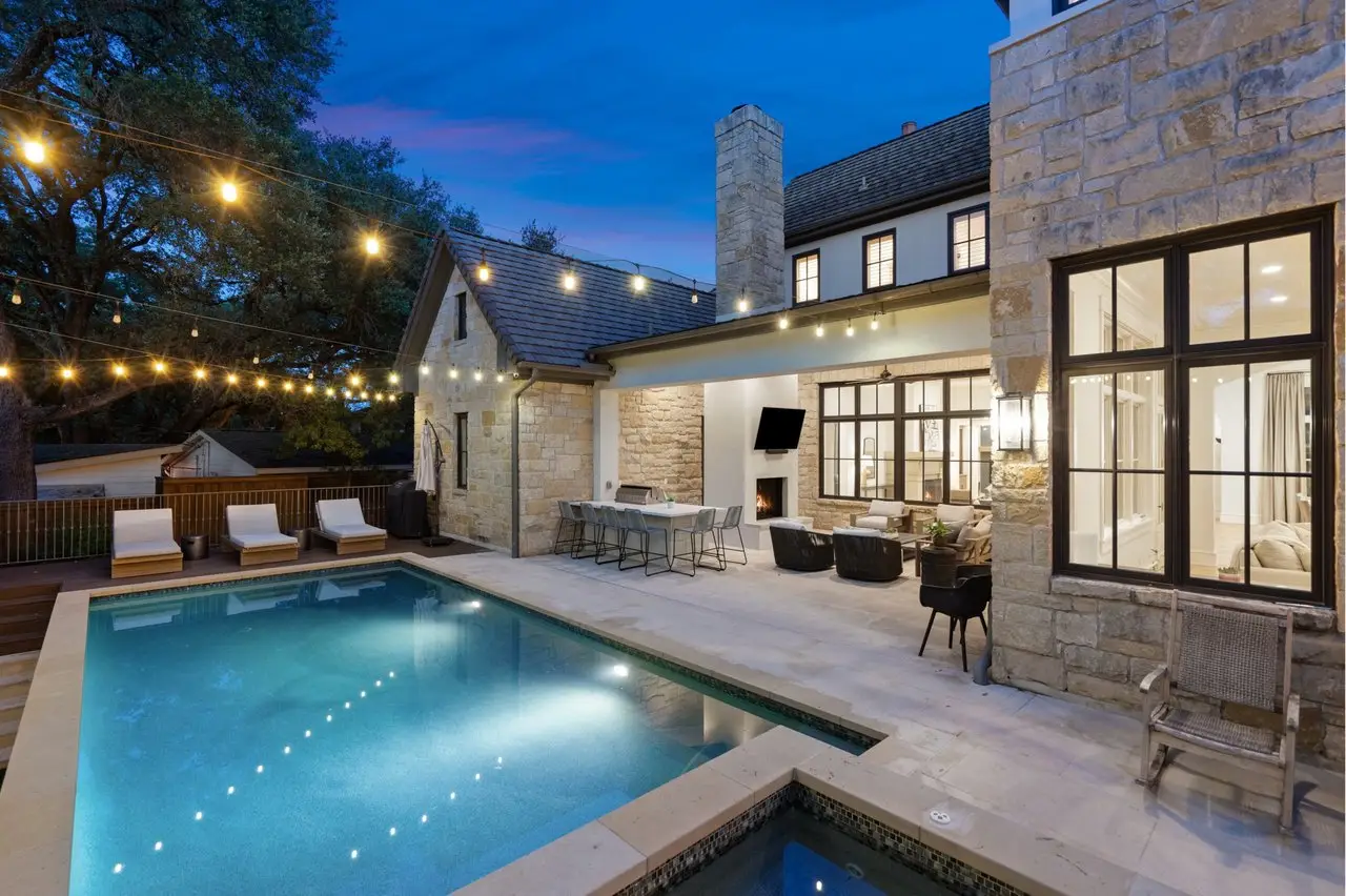 Welcome to 4907 Rollingwood Drive, a striking architectural gem nestled in the heart of one of Austin’s most prestigious neighborhoods. This sprawling 6,655-square-foot estate is a masterclass in transitional modern design—reimagined in 2021 through a collaboration with renowned LaRue Architects, interior design firm Kopfer Taylor Interiors, and luxury home builder ETF. The result is a residence that seamlessly merges timeless craftsmanship with elevated, contemporary style. Sited on an expansive .45-acre tree-lined lot, the home’s European style stone façade and graceful arches immediately command attention. Inside, the entry sets the tone with an expansive great room, abundant natural light, and an effortless flow between living spaces. Walls of glass frame the main living and dining areas, creating a constant visual connection to the outdoor covered patio, pool, and gardens beyond. The interiors exude warmth and refinement, with custom millwork, white oak flooring, designer lighting, and curated finishes at every turn The heart of the home is the open-concept kitchen—a true culinary showpiece featuring an oversized island, tailored cabinetry, premium appliances, and a walk-in pantry. Adjacent to the kitchen, a cozy breakfast nook with a fireplace invites intimate mornings, while a dramatic formal dining room with exposed beams offers a spectacular setting for hosting. Two distinct living rooms—each flooded with natural light—offer versatility for both grand entertaining and relaxed family time. The main-level primary suite is an indulgent retreat, complete with two generous walk-in closets, a spa-like bath with soaking tub and oversized shower, and direct access to a covered porch nestled beneath the trees. A private library adjoins the suite, offering the perfect space to unwind or work in peace. At the opposite wing of the home, a private guest suite with its own bath, walk-in closet, breezeway, and sun porch provides elegant accommodations for extended stays or multi-generational living. Upstairs, three additional bedrooms—each with their own en-suite bathroom—are designed with comfort and style in mind. A centrally located bonus room functions beautifully as a media lounge, game room, or gym creating a central hub for family fun and connection. An upstairs laundry room adds practicality and convenience. Outside, the property is a sanctuary designed for both relaxation and celebration. The expansive covered terrace includes a full outdoor kitchen, stone fireplace, and ample space for al fresco dining and lounging. The shimmering pool is flanked by a spa and surrounded by lush landscaping, offering total privacy and serenity. A mosquito misting system, automated landscape lighting, and whole-home generator ensure year-round comfort and peace of mind. Additional features include a circular driveway, a spacious motor court, and an oversized garage with room for up to twelve vehicles—making this an ideal setting for entertaining on any scale. The property also benefits from a shared well for irrigation and pool systems, ensuring efficiency and sustainability. Membership to the Rollingwood community pool is included, providing access to additional neighborhood amenities just moments away. With its architectural pedigree, exquisite detailing, and seamless blend of form and function, 4907 Rollingwood Drive offers a rare opportunity to own a truly exceptional home in a location that balances privacy, prestige, and proximity to Austin’s best schools, shops, and dining. This is more than a residence—it’s a lifestyle of timeless luxury.