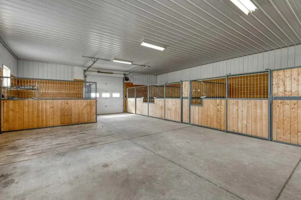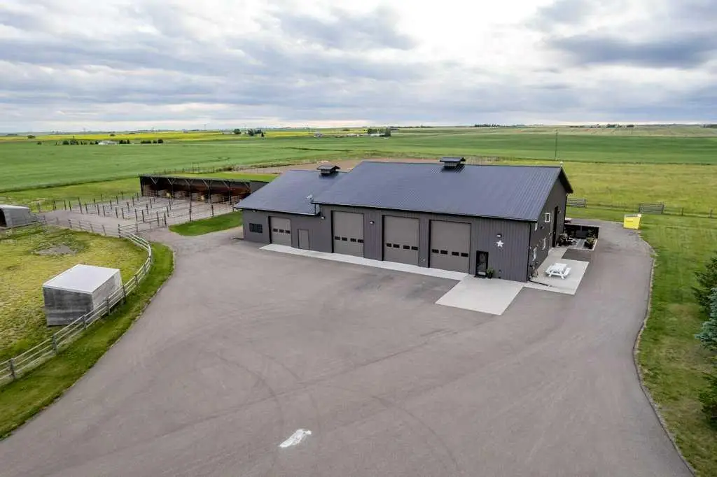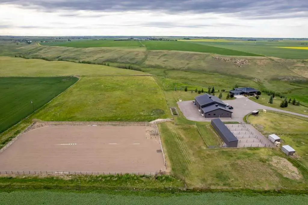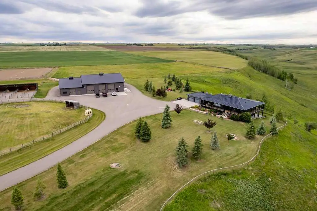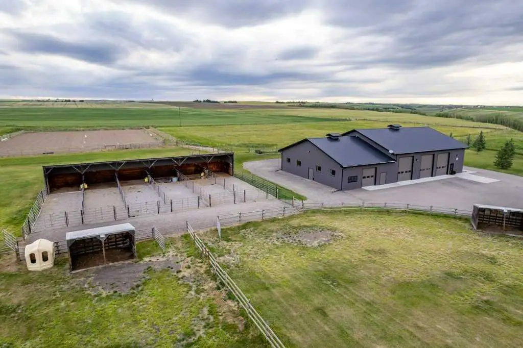 An equestrian dream awaits on this immaculate 79.5-acre property east of Crossfield, designed with horse lovers and outdoor enthusiasts in mind. Fully paved to your doorstep, this impeccable set up features a lovely 3 bedroom ranch bungalow with wrap around deck and beautiful landscaping overlooking a pastoral coulee and creek to the North. At the heart of the property is a heated 6,000 square foot shop/barn with oversized doors, in-floor heat, and a comfortable self-contained guest area (not permitted as an ADU). The barn includes a drive-through bay for easy livestock handling or parking your motorhome/ truck & trailer (19’ x 58’), a large shop area (44’ x 29.5’), gorgeous barn with four oversized box stalls, tie-stall space, a vet-grade walkthrough bath/vetting station with hot and cold water, and a well-appointed tack room/office. This building has two bathrooms, one on the lower area with a shower and a second on the upper floor as well as laundry. Outside you will love the professional 140’ x 220’ outdoor arena with roping boxes, an alley for cattle, and an adjacent holding pen, perfect for your multidisciplinary equestrian pursuits. There are six 50’ x 15’ turn out pens, each with shelters, auto waterers and feeders. There are several grass pastures and approximately 60 acres are leased annually for crop, offering added versatility and farm income potential. The house has modern country charm, nestled on a hillside to take full advantage of stunning coulee and creek views, enjoyed from the massive wraparound veranda. Inside, the home offers a comfortable and versatile layout with a custom kitchen featuring granite countertops, a 36” Capital gas range with a pot filler, prep island with seating and ample dining space. The kitchen flows into a bright living room with cozy gas fireplace and a large formal dining area perfect for entertaining. There are two bedrooms on the main floor, including one with a 3 piece ensuite bath with access to the covered deck. Downstairs the beautifully finished walkout basement is a private retreat with a spa-inspired primary suite including a large walk-in closet, ensuite, laundry, and garden doors opening to a hot tub-ready patio. A generous second living room featuring custom built-ins and full bar area complete the lower level, offering space and comfort for both relaxation and entertaining. The house has a double attached heated garage with epoxy floor which is currently being used as a man cave/ gym space. Conveniently located just 20 minutes north of Calgary International Airport—and only 5 minutes from Irvine’s Western Store—this property combines rural tranquility with unbeatable accessibility. Pavement leads right to the front door, and the home is set well back from the road, offering exceptional privacy. A secure Command Gate ensures controlled access and added peace of mind, while page wire fencing surrounds the yard to keep your four-legged companions safe. Ag-Gen zoning. GST applicable.
