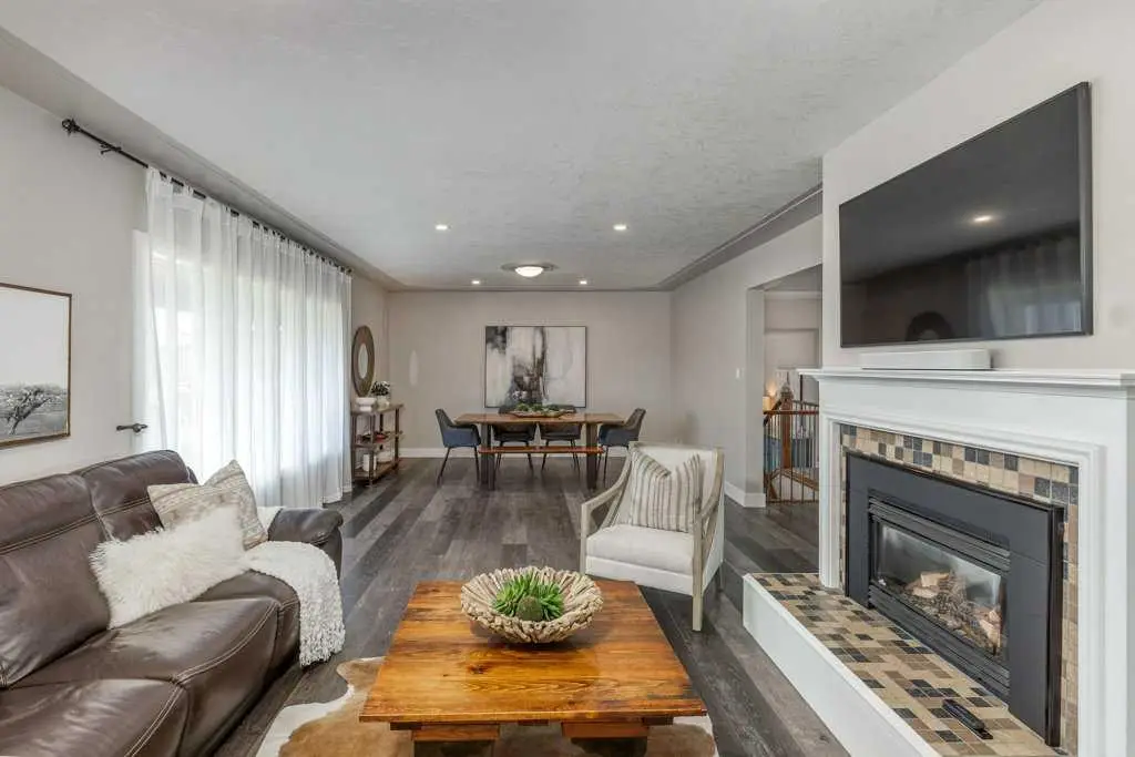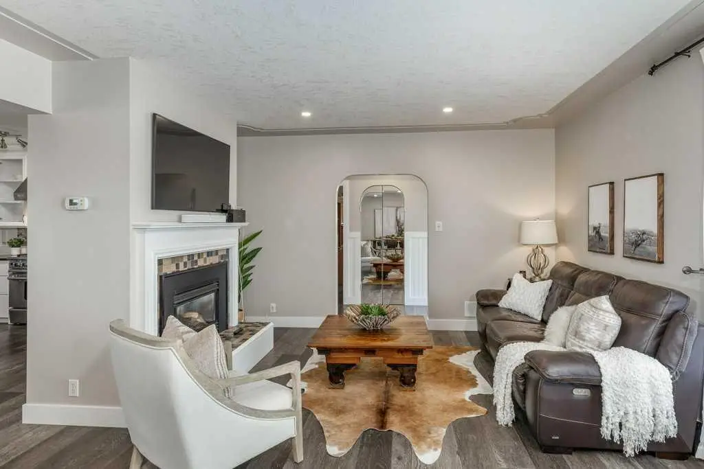 Bright living room with cozy gas fireplace