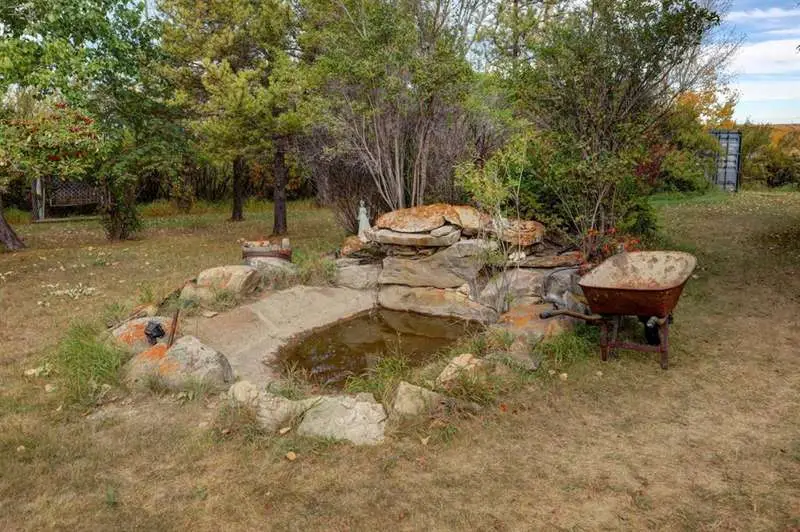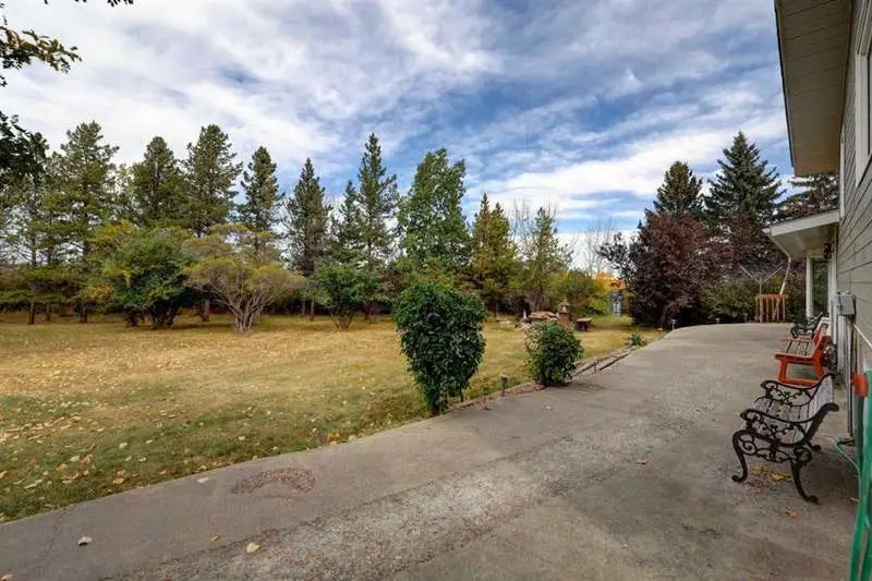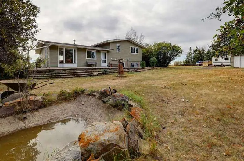 Experience the best of country living just 5 minutes from town! Tucked away on 4 private, beautifully treed acres, this charming 4-level split is the perfect retreat for those craving space, privacy, and a touch of nature. Step inside and you’re welcomed by a bright open-concept kitchen and dining area that flows into the living room, where west-facing windows frame peaceful mountain views. Upstairs you’ll find 3 comfortable bedrooms and 2 full bathrooms, including a relaxing primary suite with its own 4-piece ensuite. The lower level offers cozy family living with a wood-burning stove, a 4th bedroom, laundry, and an additional bathroom. Head down one more level to the basement and you’ll discover a games room (yes—the pool table stays!), bar area, plus plenty of storage and a cold room for all your extras. Recent updates mean peace of mind: new roof (2023), newer composite siding, newer septic tank (approx. 5 years), hot water tank and some new doors/windows (2025). But the real treasure is outside—whether you’re tinkering in the heated garage and shop (with running water!), relaxing by the waterfall pond, or enjoying evenings in the bunkhouse with its own propane stove and power. There’s room for animals with a paddock and shelter, plenty of sheds for storage, RV parking, and rows of fruit trees that add both privacy and charm. This isn’t just a property—it’s a lifestyle. A place where you can breathe, unwind, and enjoy the tranquility of acreage living, all while being just minutes from Airdrie.