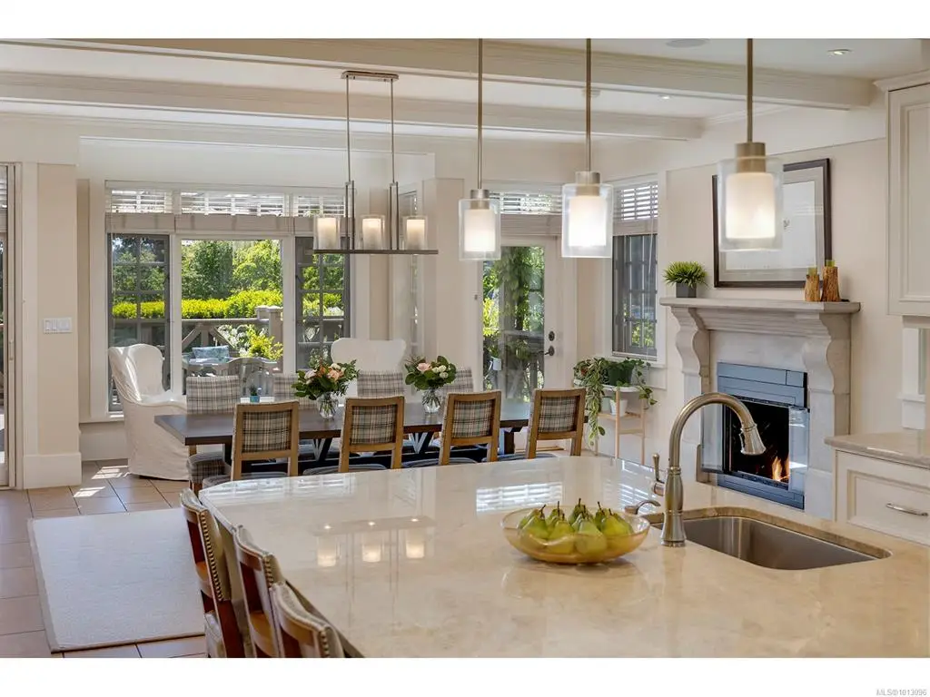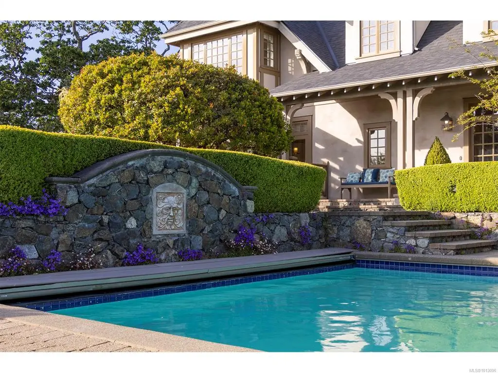 Situated in the heart of Ten Mile Point, this captivating custom residence blends timeless elegance with architectural mastery and the finest materials. Positioned high with views of Cadboro Bay, this .50-acre south-facing estate is the perfect setting for the 5,000+ sq. ft. home, complete with manicured gardens, stone walls, water features and a custom in-ground pool. Designed for seamless indoor–outdoor living, the main floor offers a refined yet relaxed lifestyle, enhanced by the area’s unique microclimate of warmer days & sun-filled evenings. Principal rooms grace the main level, with 4 bedrooms and 3 baths above, and an additional bed & bath below. The sumptuous primary retreat spans its own wing with a spa-inspired bath, fireplace, private sitting area and breathtaking ocean views from your bedside. A grand gourmet kitchen anchors the home with dining-area fireplace, expansive island and direct access to a wisteria-covered heated deck, expansive terraces and tranquil fountains.