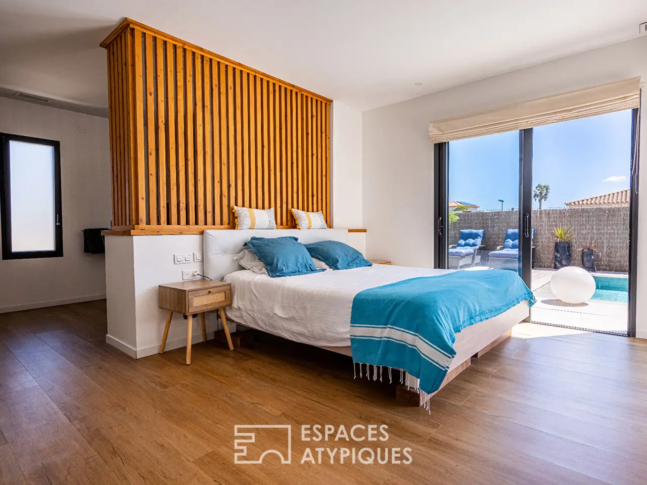 Nestled in one of Saint-Cyprien's most sought-after residential neighborhoods, this contemporary villa captivates with its elegant architecture, generous volumes, and abundant light. Its sublime mirror pool, high-end finishes, and peaceful setting make it a rare find just minutes from the beaches and amenities of the Catalan coast. Upon entering, the living area impresses with its brightness and proportions.A series of south-facing bay windows opens onto the living room, dining room, and contemporary kitchen with a central island. A glass-roofed office blends seamlessly into the space, providing a light-filled home office. A carefully designed patio adds an additional touch of brightness and elegance.The single-story master suite, a true cocoon of comfort, features a dressing area, a private bathroom, and direct access to the terrace. The water's reflections on the walls extend the soothing atmosphere into the bedroom. Upstairs, two more welcoming bedrooms share a generous bathroom. This level also leads to a rooftop terrace that can be arranged as desired: summer lounge, hanging garden, or solarium with unobstructed views of the surrounding area.The exteriors are designed as a natural extension of the living spaces. A large wooden terrace surrounds the mirror pool, the central feature of this garden, ideal for relaxing under the Mediterranean sun or entertaining in a friendly atmosphere. A large garage and several parking spaces on the plot complete the ensemble. High-end amenities abound: solar panels, ducted air conditioning, alarm, camera, and videophone. In the immediate vicinity, schools, shops, sports facilities, beach, and marina ensure an easy and pleasant daily life.Combining modern lines, comfort, and quality of life, this contemporary villa for sale in Saint-Cyprien embodies the very essence of a unique property, designed down to the smallest detail to appeal to lovers of architecture and light.ENERGY CLASS A (37) / CLIMATE CLASS A (1)Estimated average amount of annual energy expenditure for standard use, established from 2021 energy prices: EUR487 and EUR658.REF. 10491MLAdditional information* 5 rooms* 3 bedrooms* 2 shower rooms* 2 floors in the building* Outdoor space : 625 SQM* Property tax : 2 546 €Energy Performance CertificateEPC : 37 kWhEP/m2.year* A 450GHG : 1 kgeqCO2/m2.year* A 80Agency feesThe fees include VAT and are payable by the vendorMediatorMediation Franchise-Consommateurswww.mediation-franchise.com29 Boulevard de Courcelles 75008 ParisInformation on the risks to which this property is exposed is available on the Geohazards website : www.georisques.gouv.fr
