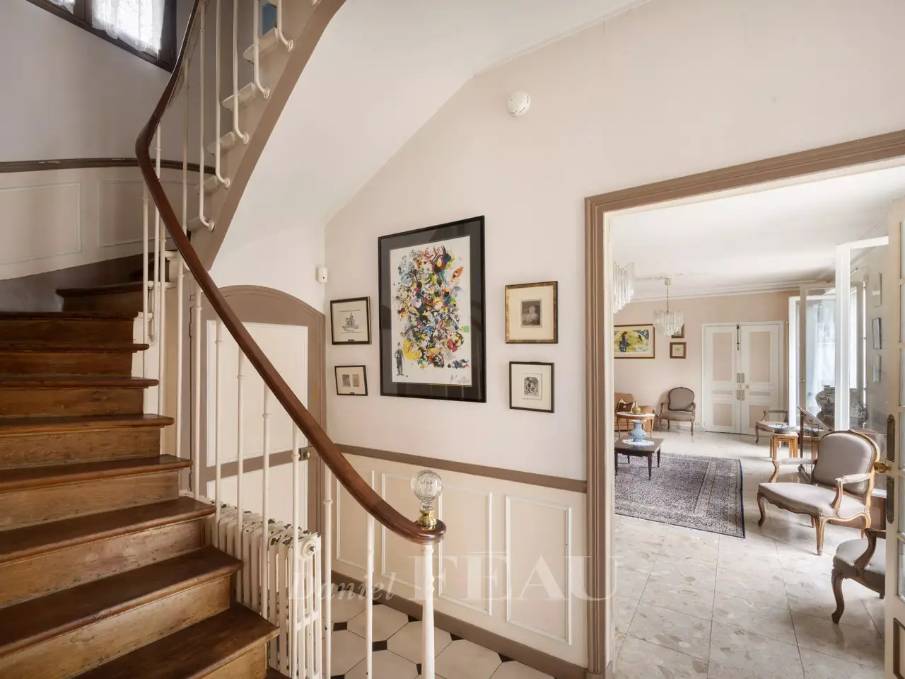 Rue du Parc. This exceptional period property is located near the shops and the metro station in the heart of Saint Mandé on the south-eastern edge of the capital. Very peaceful and accessed by means of a private drive, it offers 556.50 sqm of floor space and 307.54 sqm of living space as defined by the Carrez Law. Benefiting from two entries, it includes a spacious living/reception room, a dining room, a kitchen, a bedroom with a bathroom, a study and a wc. Two staircases access three 1st floor bedrooms, a study, a bathroom, and a separate wc. Shower rooms could be created. They also access the second floor which comprises three further bedrooms, a study, a shower room and a separate wc. Here also shower rooms would be possible. The garden level opens onto a garden featuring olive trees, and with a garage. On a basement with a large storage room, a boiler room, a workshop and a wash room.